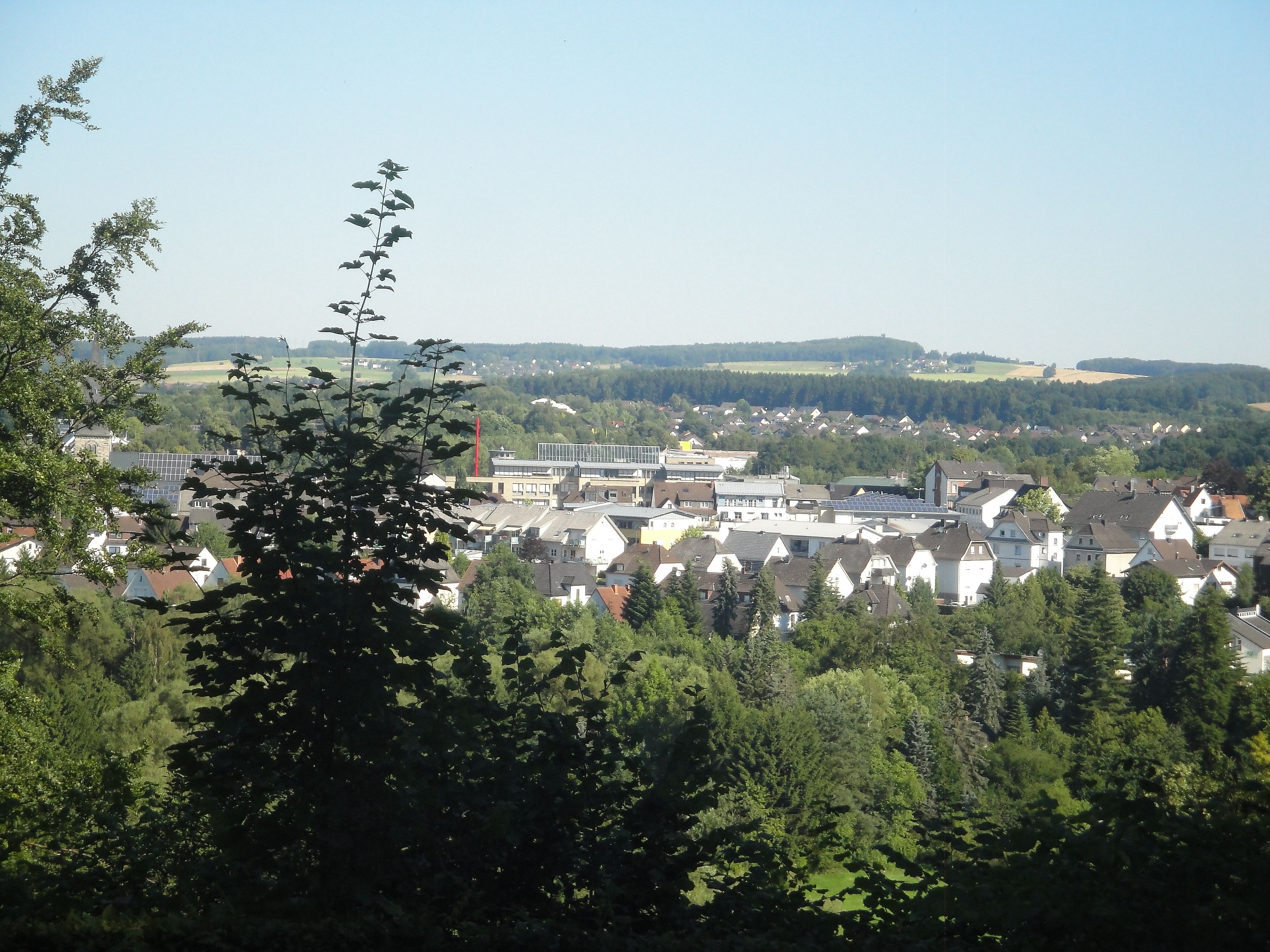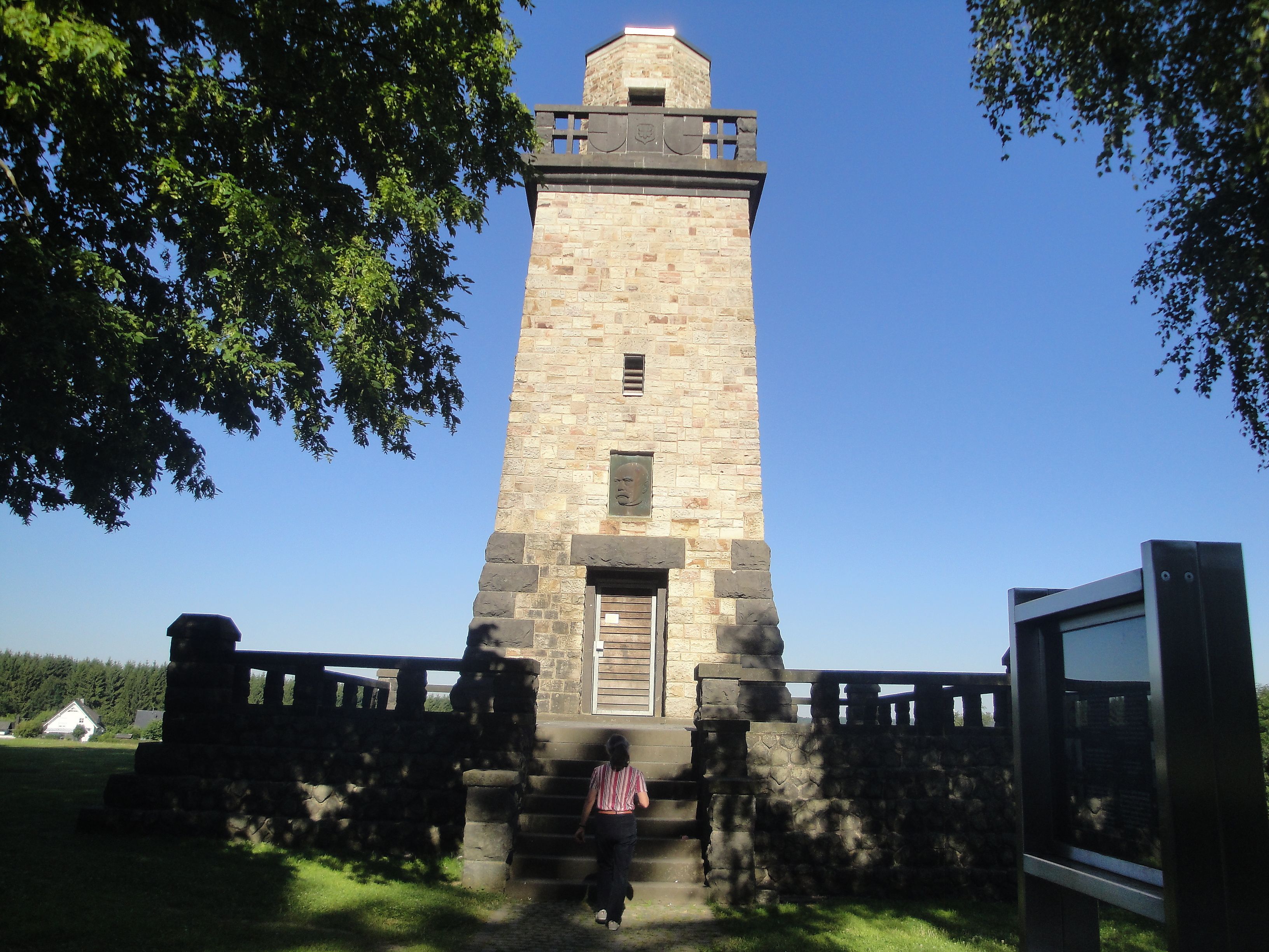 Über Oberwambach geht es hinab nach Amteroth zum Almersbachtal und dann ein letztes Mal bergauf zum Bismarckturm, der 1914 aus heimischem Felsgestein erbaut wurde. Am Ehrendenkmal halten wir ein letztes Mal kurz an und genießen von hier aus den Blick auf die Stadt.
