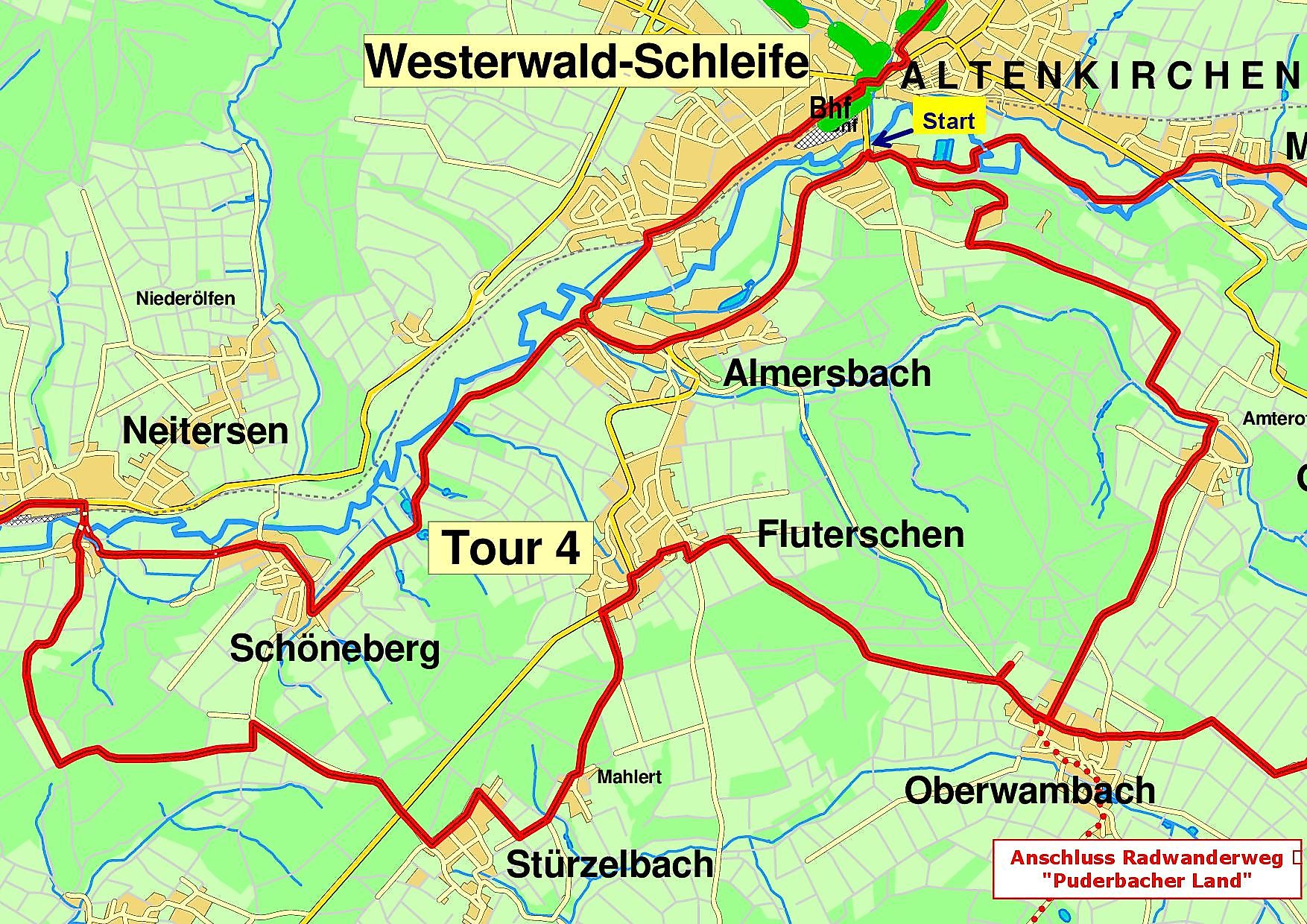 Richtung Fluterschen entlang der L 267, Beim Wanderparkplatz in Almersbach rechts hinunter zur Wied (Abstecher zur Kirche in Almersbach), im Wiedtal links nach Schöneberg und weiter flußabwärts bis Neitersen, vor der Wiedbrücke links am Kino vorbei, durch einen Hohlweg bergauf Richtung Wald bis ein breiter Waldweg kreuzt, hier links, nach ca. 230 m den leicht rechts abzweigenden Waldweg einschlagen, hinab zum Wiesental des Breibaches, links bis zur Straße, dort rechts bergauf zur L 267, L 267 kreuzen, Ortseingang Stürzelbach links, "Waldstrasse" folgen bis zum landwirtschaftlichen Querweg, links nach Mahlert, Ortshinweisschild nach Fluterschen folgen, an Bushaltestelle rechts durch die Brunnenstraße bergauf bis zur Steimeler Straße, wenige Meter rechts, dann links in den Amselweg, Höhenweg durch Waldgebiet bis Oberwambach, ca. 300 m rechts, links durch Str. "Vor dem Gebrannten" bis Amteroth, hinter Brücke über Almersbach links, nach wenigen Metern schräg bergaufwärts führenden landwirtschaftlichen Weg folgen, links Höhenstrasse zum Bismarkturm, hier rechts abbiegen und bergab zum Ausgangspunkt.