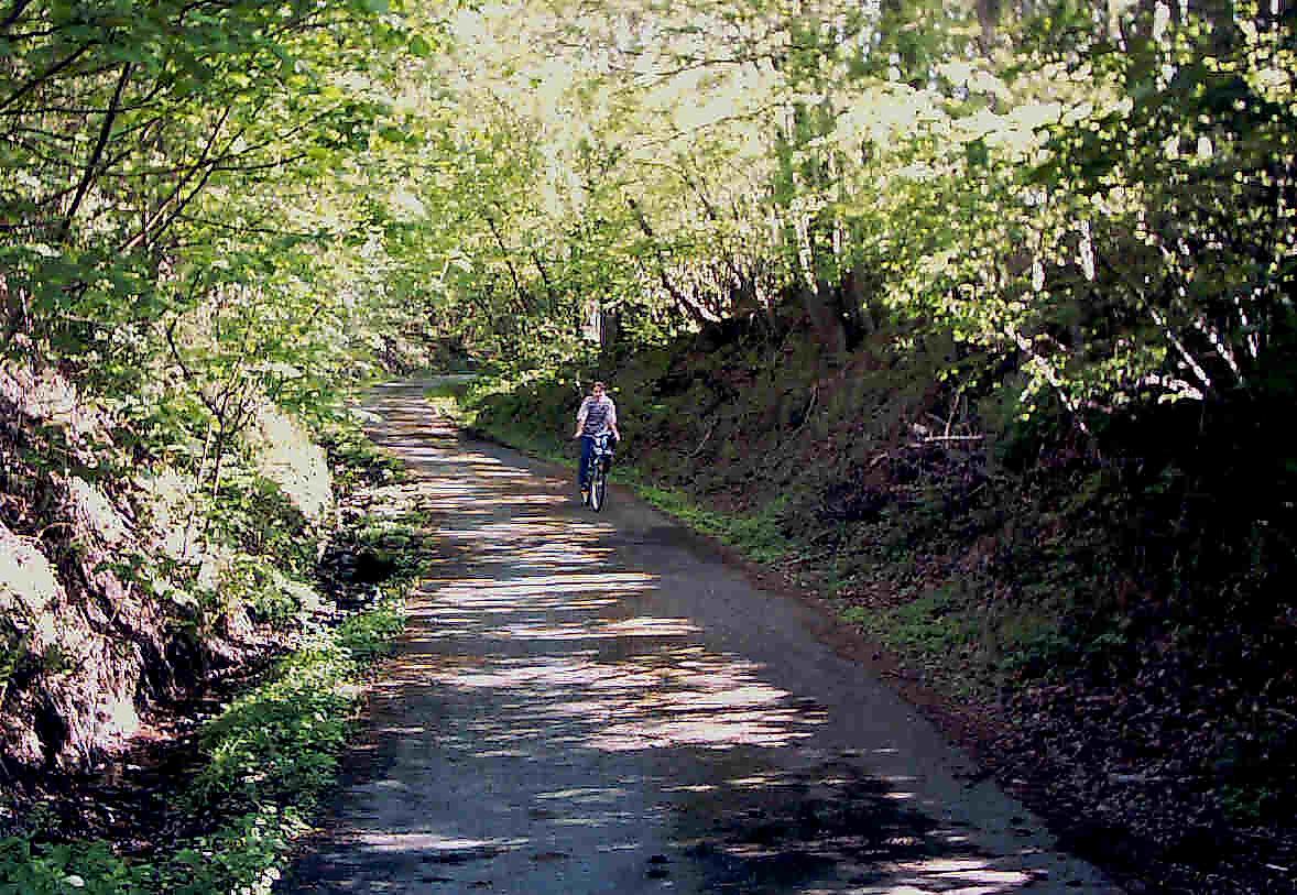 Ab Altenkirchen geht es nach Almersbach mit ihrer sehenswerten Kirche - spätromanische, flachgedeckte Pfeilerbasilika, 12. Jh. Ein kleiner Abstecher dorthin lohnt sich.Dann radeln wir gemütlich im Wiedtal nach Schöneberg, wo es im heutigen Bereich der Kirche sogar einmal ein Schlößchen gegeben haben soll. Vorbei am Programm-Kino Wiedscala in Neiterschen (ehemals eine Wassermühle) geht es nun hinauf in den Staatsforst Altenkirchen. Die Strecke beginnt mit einem eindrucksvollen Hohlwege, dessen Entstehung auf die intensive Wegenutzung zum Holz- und Steintransport (ehemalige Erzgrube „Emma“) zurückzuführen ist.