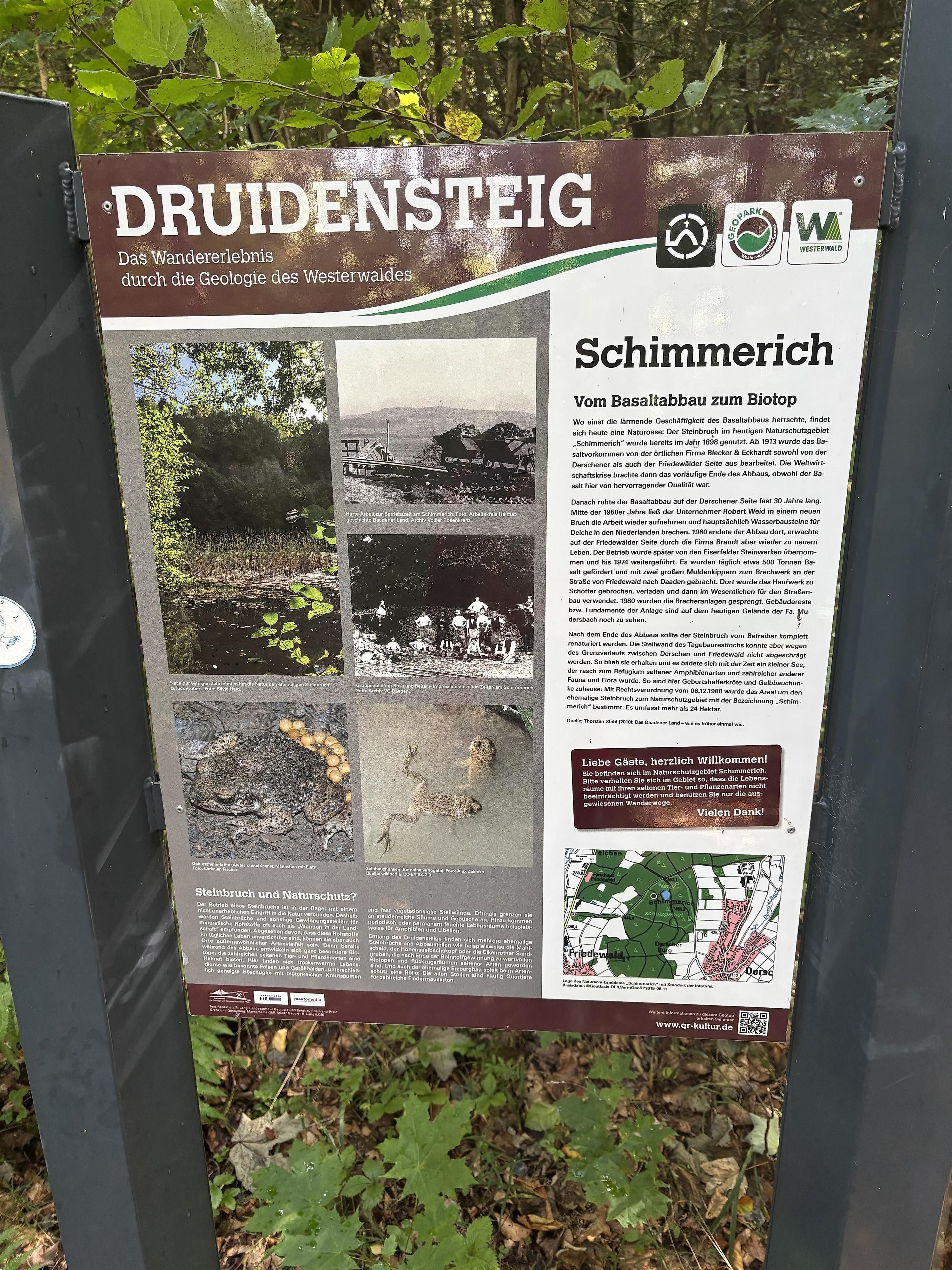 Wo einst die lärmende Geschäftigkeit des Basaltabbaus herrschte, findet sich heute eine Naturoase: Der Steinbruch im heutigen Naturschutzgebiet „Schimmerich“ wurde bereits im Jahr 1898 genutzt. Ab 1913 wurde das Basaltvorkommen von der örtlichen Firma Blecker & Eckhardt sowohl von der Derschener als auch der Friedewälder Seite aus bearbeitet.Die Weltwirtschaftskrise brachte dann das vorläufige Ende des Abbaus, obwohl der Basalt hier von hervorragender Qualität war. Danach ruhte der Basaltabbau auf der Derschener Seite fast 30 Jahre lang.Mitte der 1950er Jahre ließ der Unternehmer Robert Weid in einem neuen Bruch die Arbeit wieder aufnehmen und hauptsächlich Wasserbausteine für Deiche in den Niederlanden brechen.1960 endete der Abbau dort, erwachte auf der Friedewälder Seite durch die Firma Brandt aber wieder zu neuem Leben. Der Betrieb wurde später von den Eiserfelder Steinwerken übernommen und bis 1974 weitergeführt. Es wurden täglich etwa 500 Tonnen Basalt gefördert und mit zwei großen Muldenkippern zum Brechwerk an der Straße von Friedewald nach Daaden gebracht. Dort wurde das Haufwerk zu Schotter gebrochen, verladen und dann im Wesentlichen für den Straßenbau verwendet.1980 wurden die Brecheranlagen gesprengt. Gebäudereste bzw. Fundamente der Anlage sind auf dem heutigen Gelände der Fa. Mudersbach noch zu sehen.Nach dem Ende des Abbaus sollte der Steinbruch vom Betreiber komplett renaturiert werden. Die Steilwand des Tagebaurestlochs konnte aber wegen des Grenzverlaufs zwischen Derschen und Friedewald nicht abgeschrägt werden. So blieb sie erhalten und es bildete sich mit der Zeit ein kleiner See, der rasch zum Refugium seltener Amphibienarten und zahlreicher anderer Fauna und Flora wurde. So sind hier Geburtshelferkröte und Gelbbauchunke zuhause.Mit Rechtsverordnung vom 08.12.1980 wurde das Areal um den ehemalige Steinbruch zum Naturschutzgebiet mit der Bezeichnung „Schimmerich“ bestimmt. Es umfasst mehr als 24 Hektar.