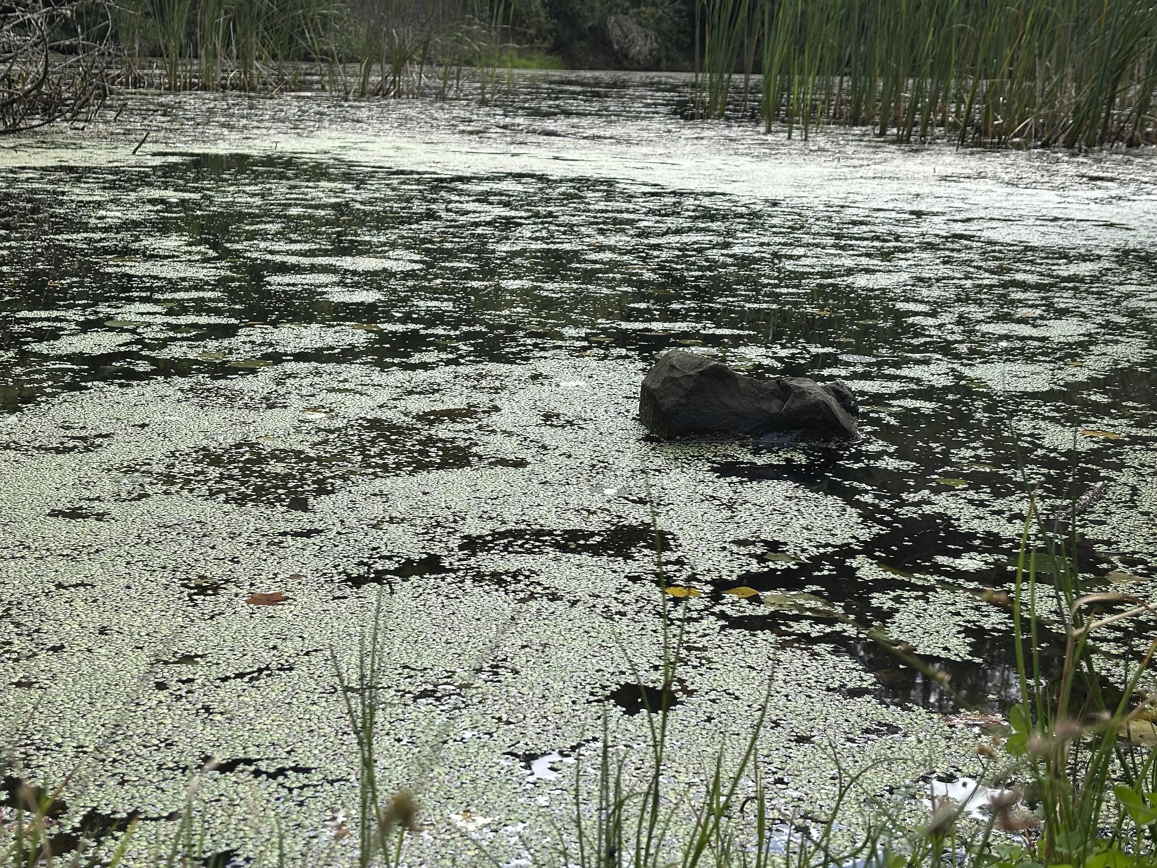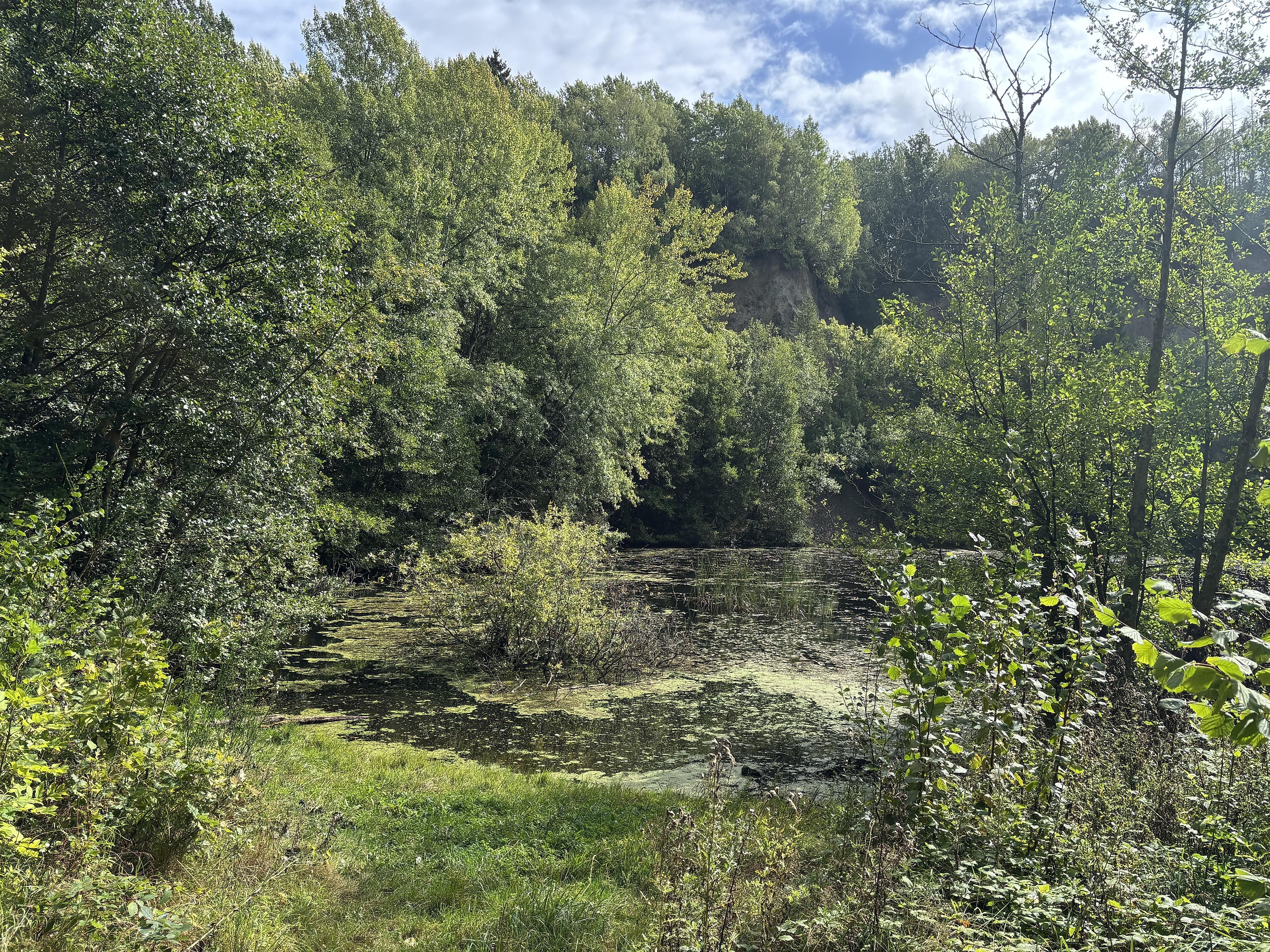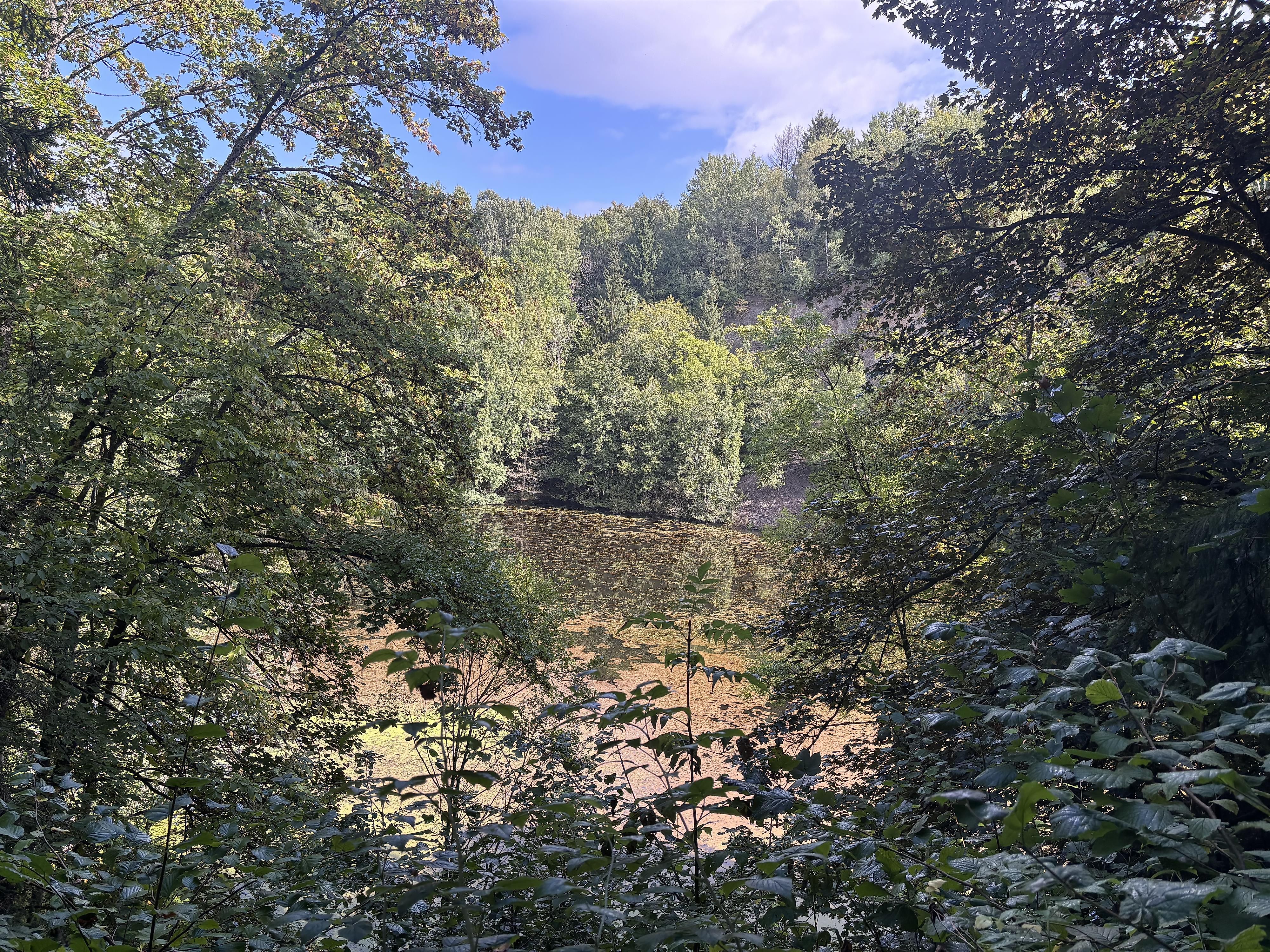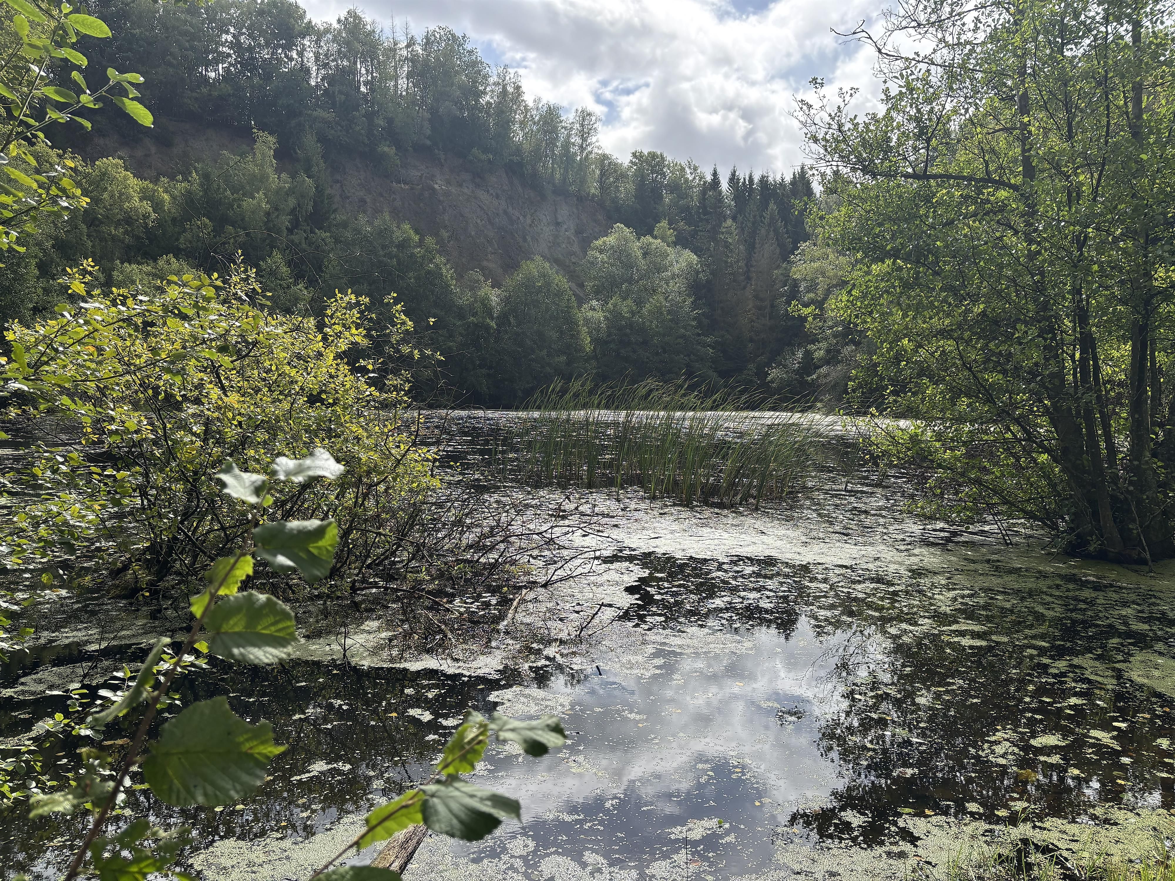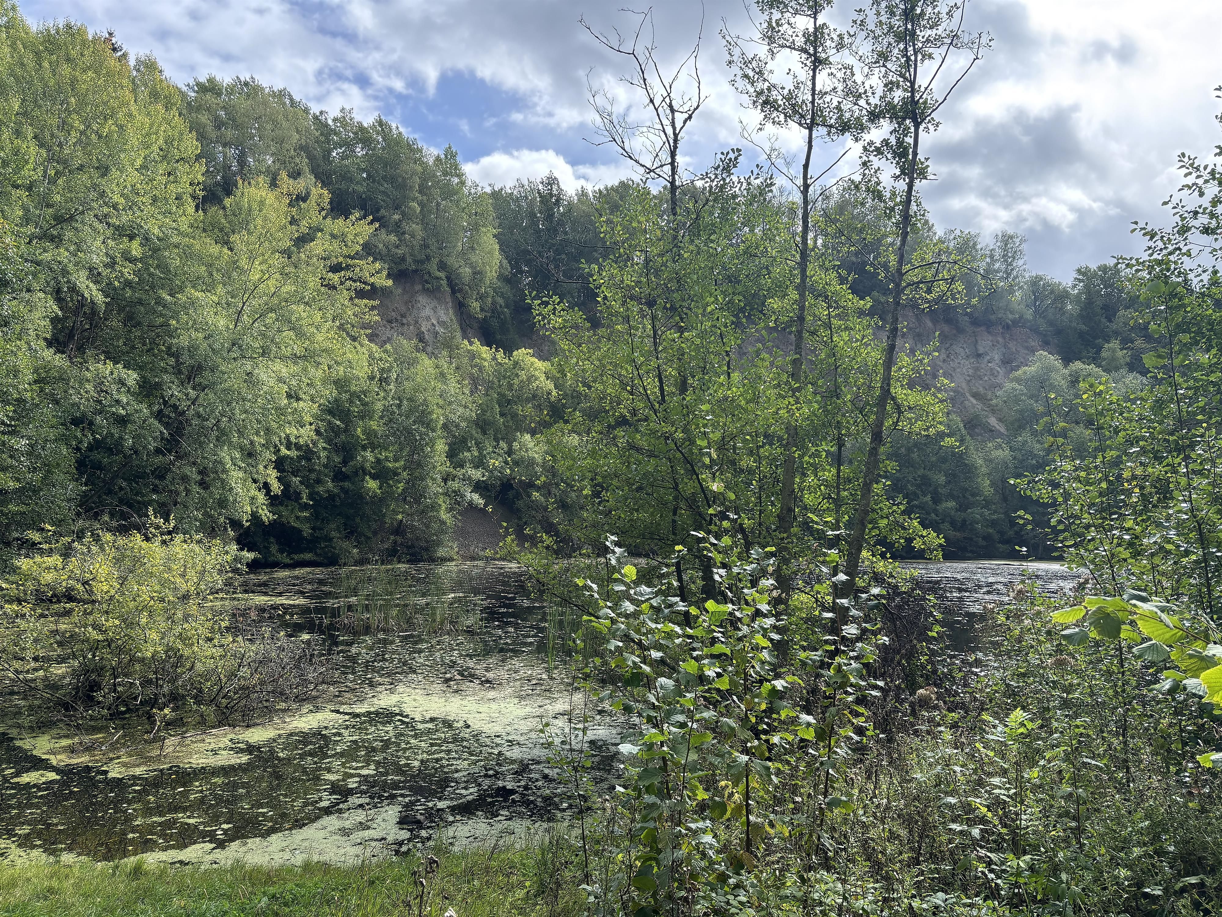 Ein kleiner Aussichtspunkt bietet einen wunderbaren Blick in den still daliegenden Abbausee.