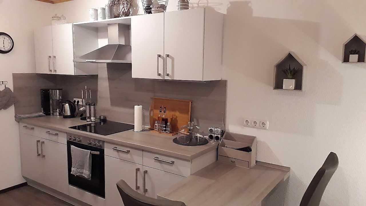 Offener Küche-/Wohnbereich:Backofen, Spülmaschine, Kühlschrank,Dunstabzugshaube, Kaffeemaschine, Toaster, Eierkocher, Sandwichmaker, Saftpresse, Stabmixer, Küchenreibe, Küchenwaage, Raclette, WMF Topfset + Besteck, Pfanne, Geschirr + Gläser, Küchenmaschine,Esstisch angrenzend an Küche, moderner Flachbildschirm Sateliten TV, 2 x Relax-Sessel mit Tisch und Leselampen, gemütlicher Schwedenofen