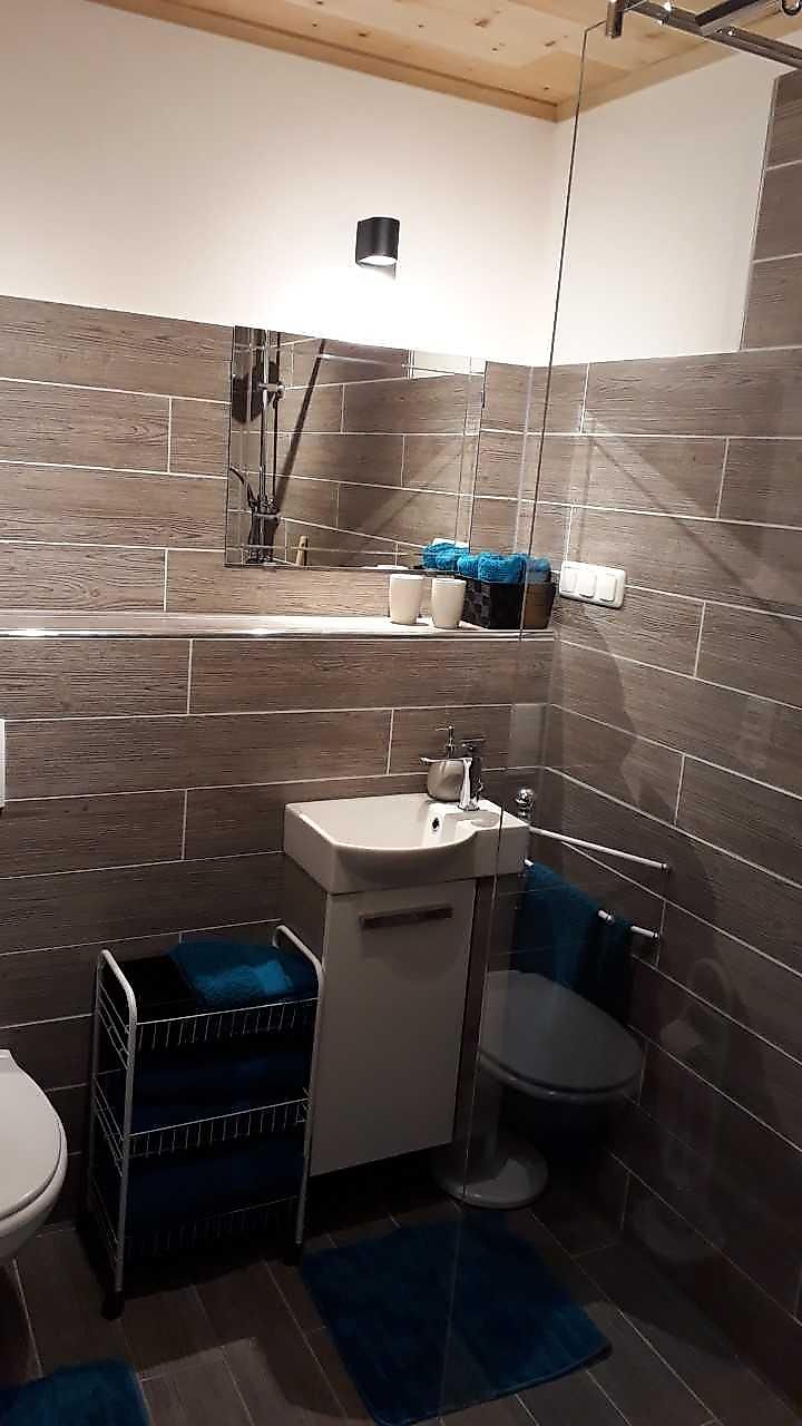 Bad: Dusche, WC, Waschbecken, Radio, Spiegel, Durchlauferhitzer und Elektroheizung