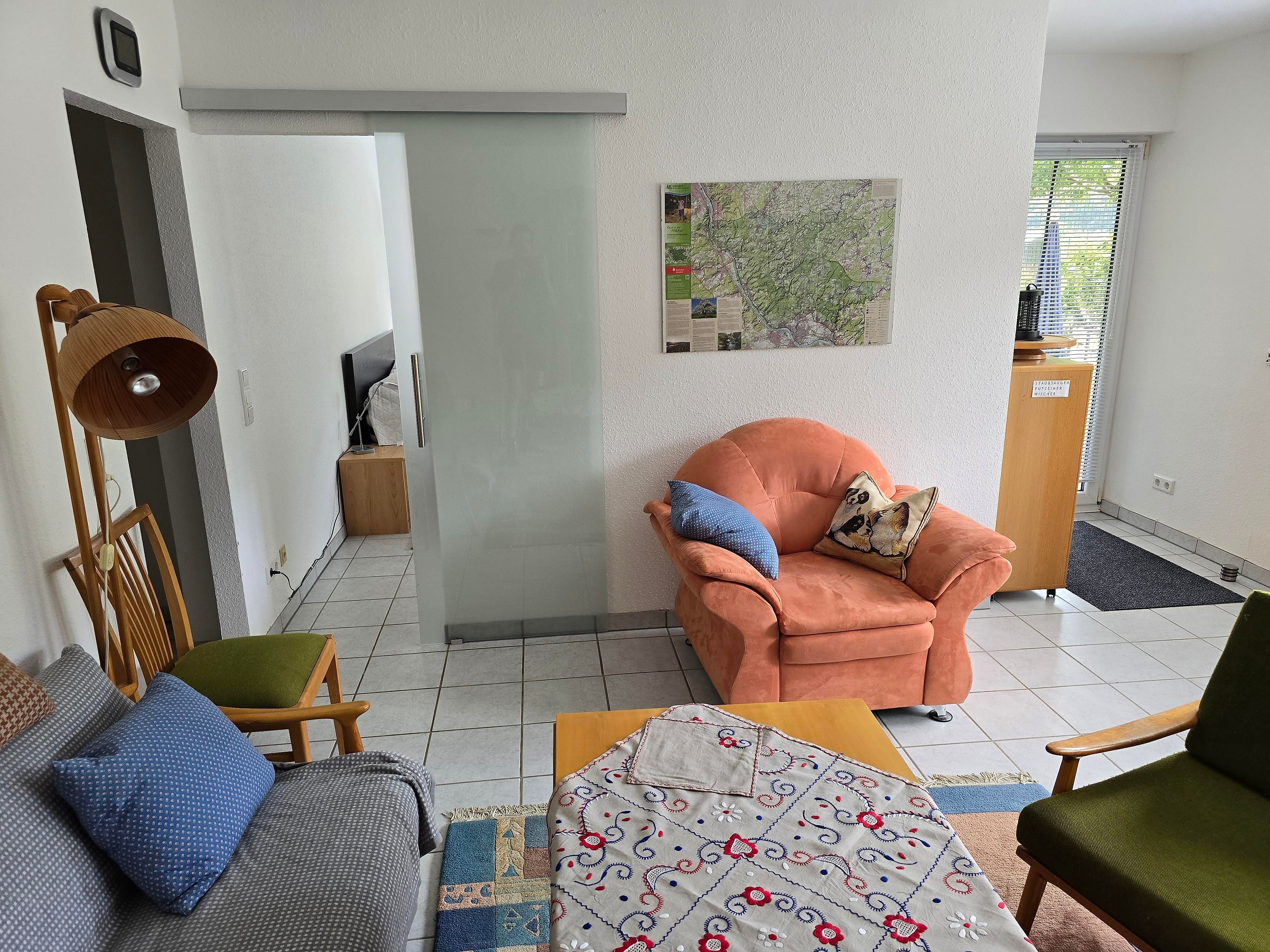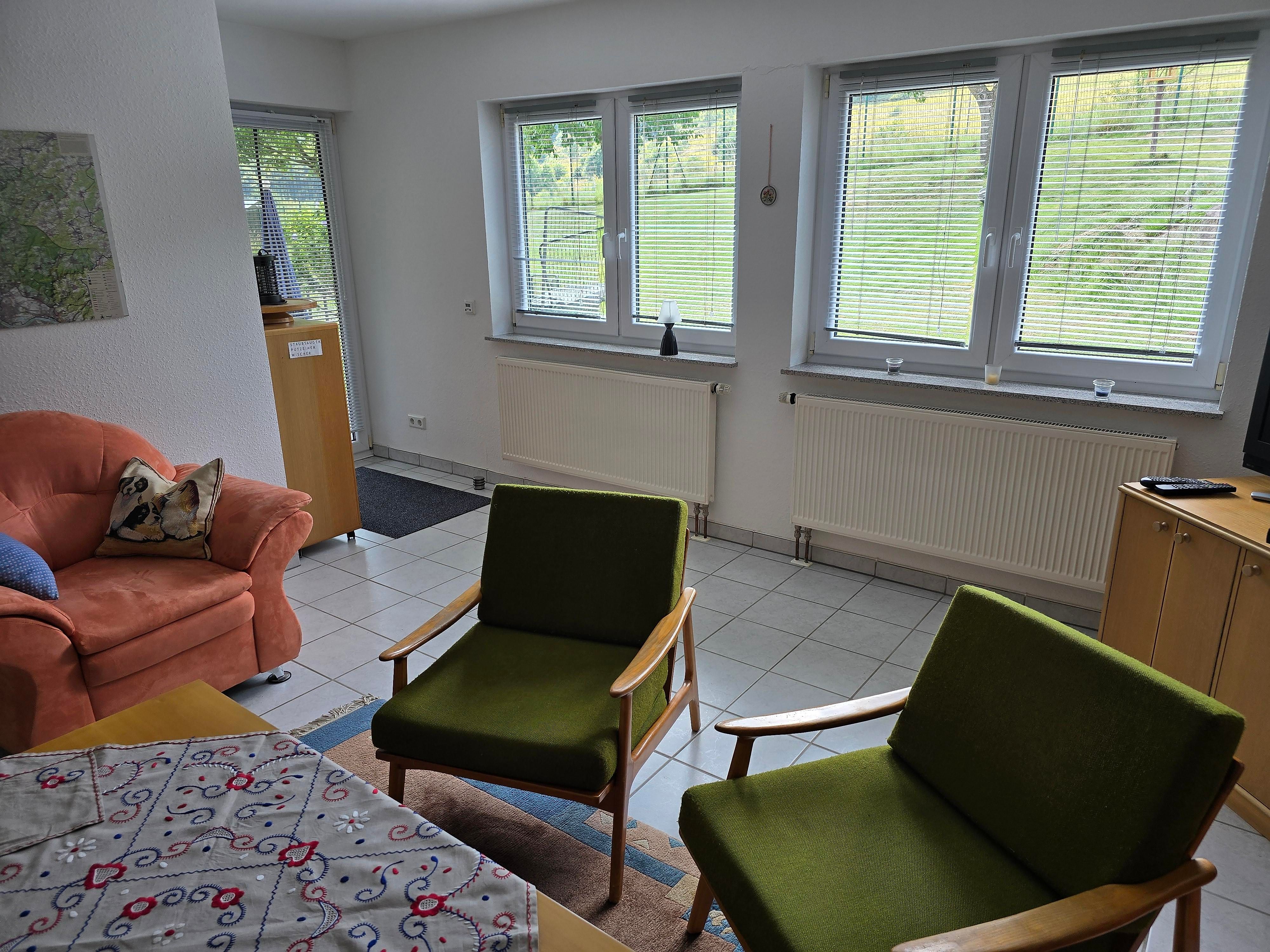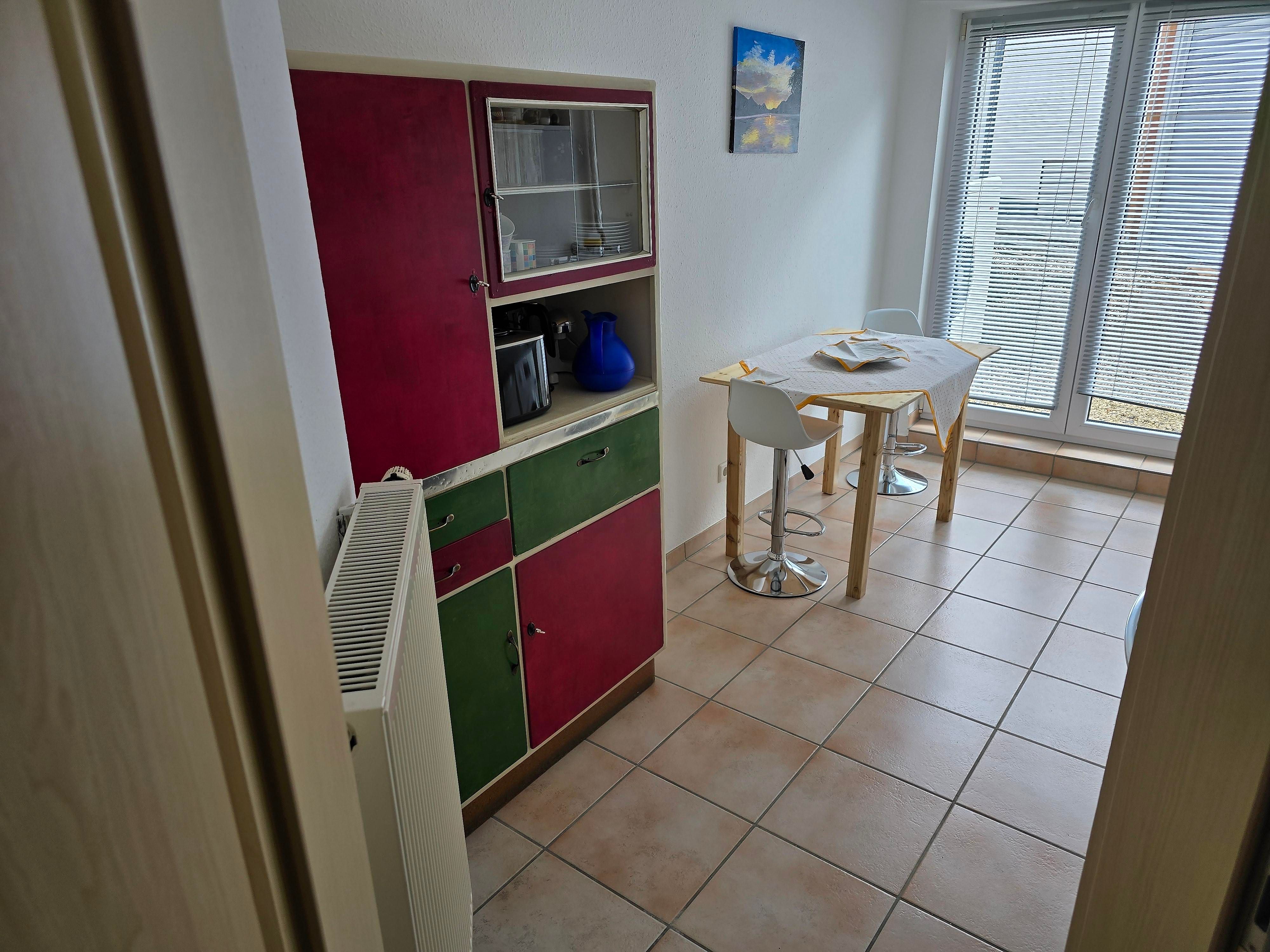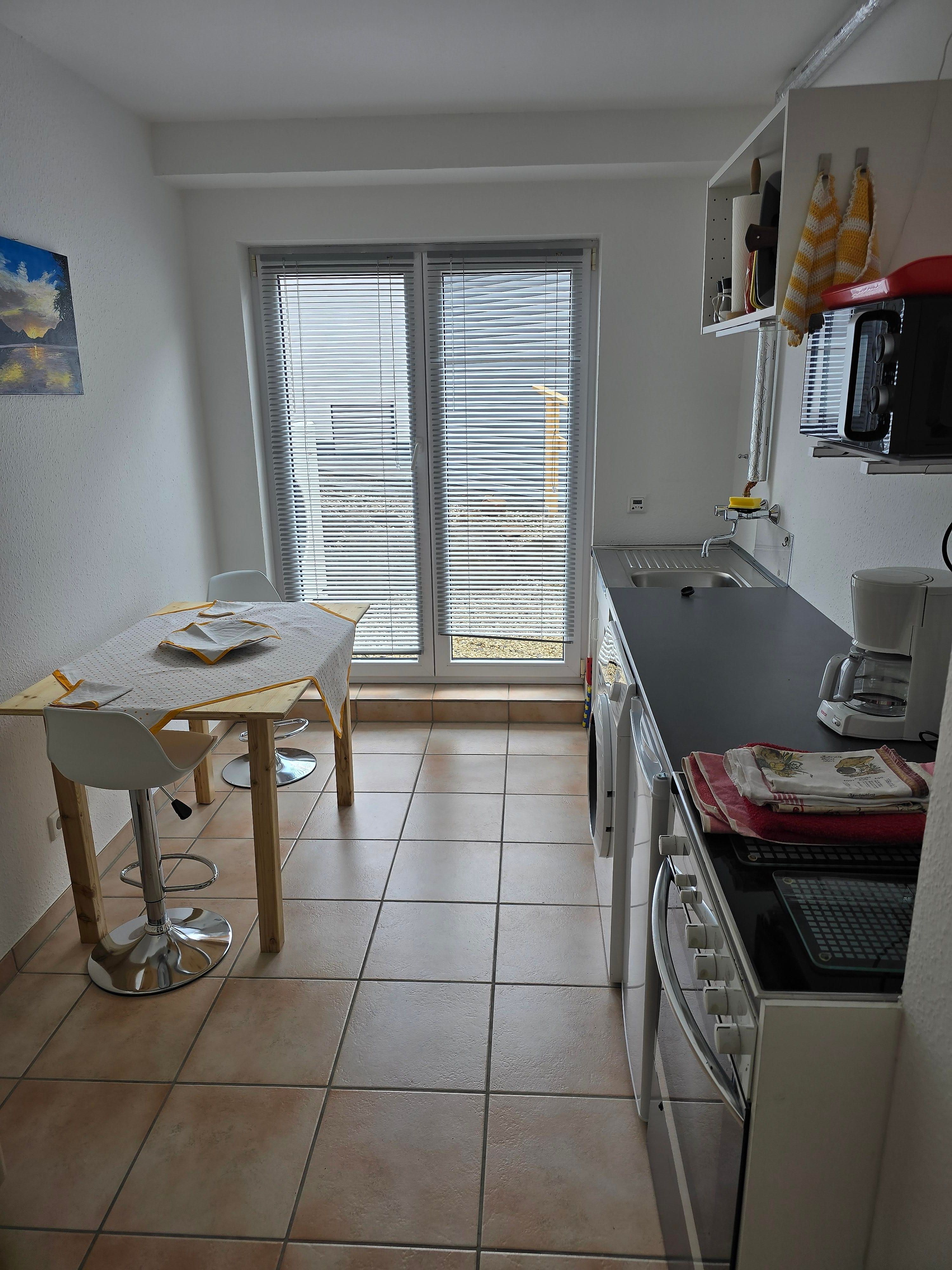 Ferienwohung im Parterre. Separates Wohnzimmer, Schlafzimmer, Bad und Küche plus Flur. Parkmöglichkeit vor dem Haus. Unterstellmöglichkeit für Fahrräder, einzelnes Motorrad. Terrasse und ein Teil des Gartens stehen zur Nutzung zur Verfügung, ebenso ein Grill.
