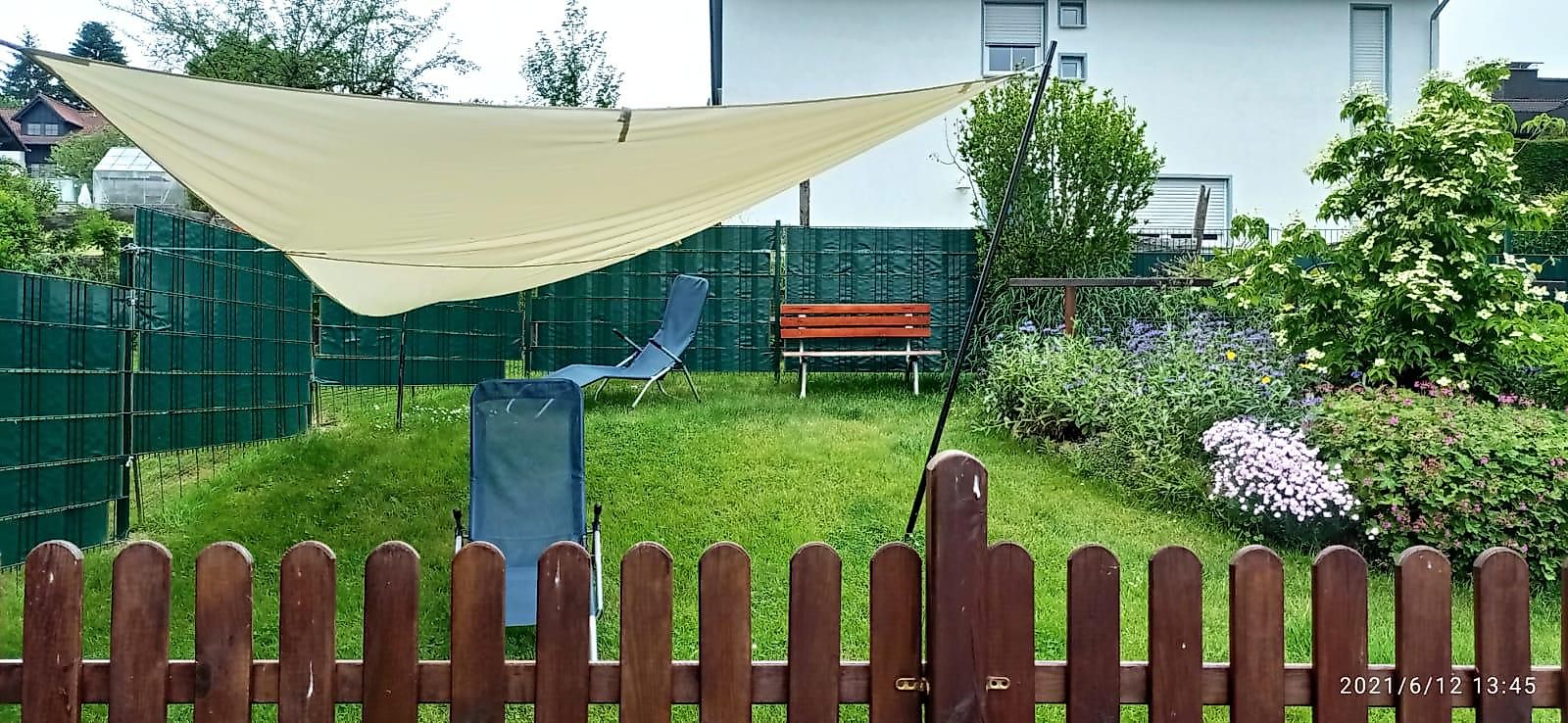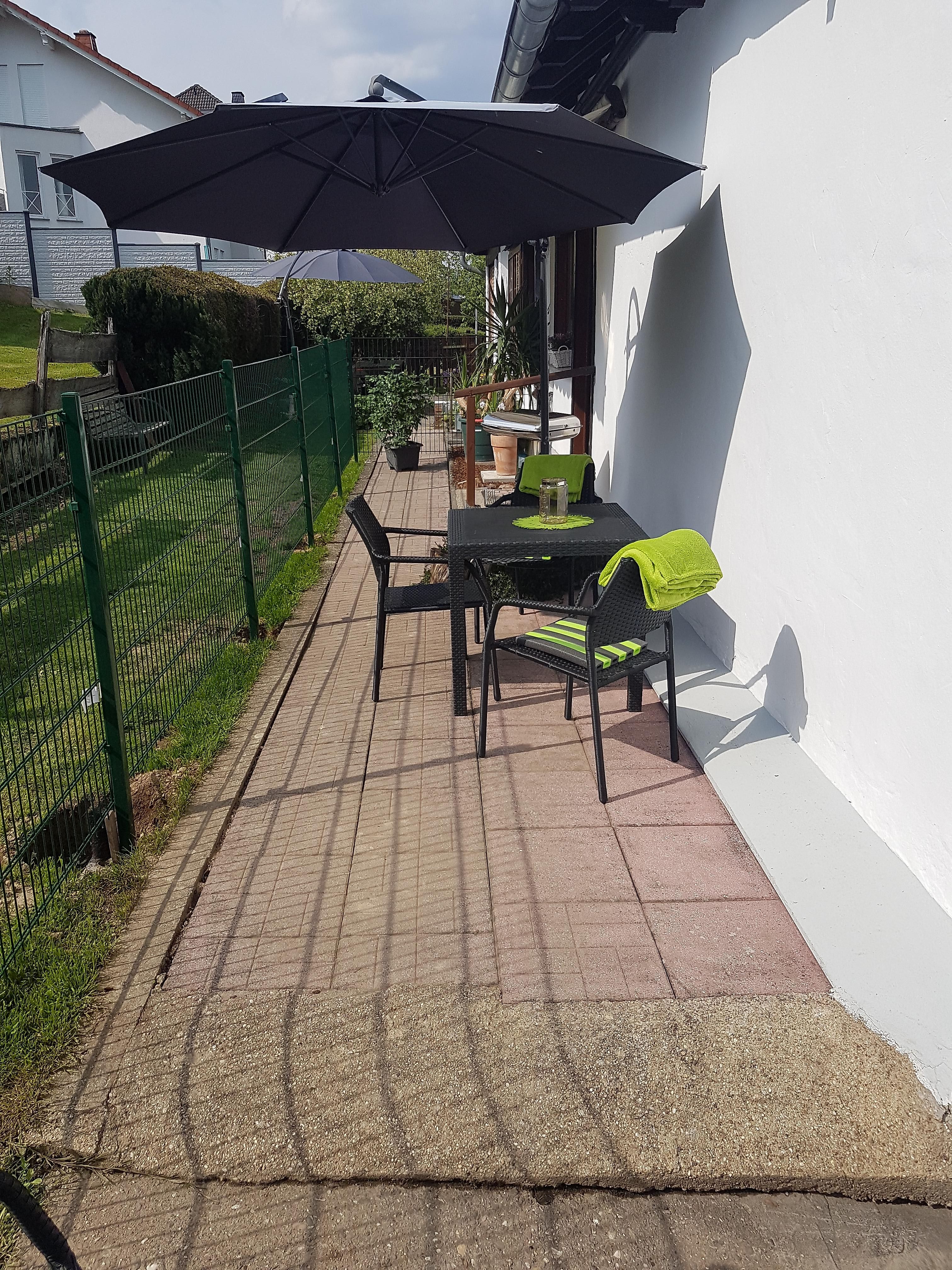 Für unsere Erwachsenen Gäste habe wir eine Terrasse / Sonnenseite mit Tisch und Bestuhlung sowie die Möglichkeit mit einem großen Ampelsonnenschirm für Schatten zu sorgen.