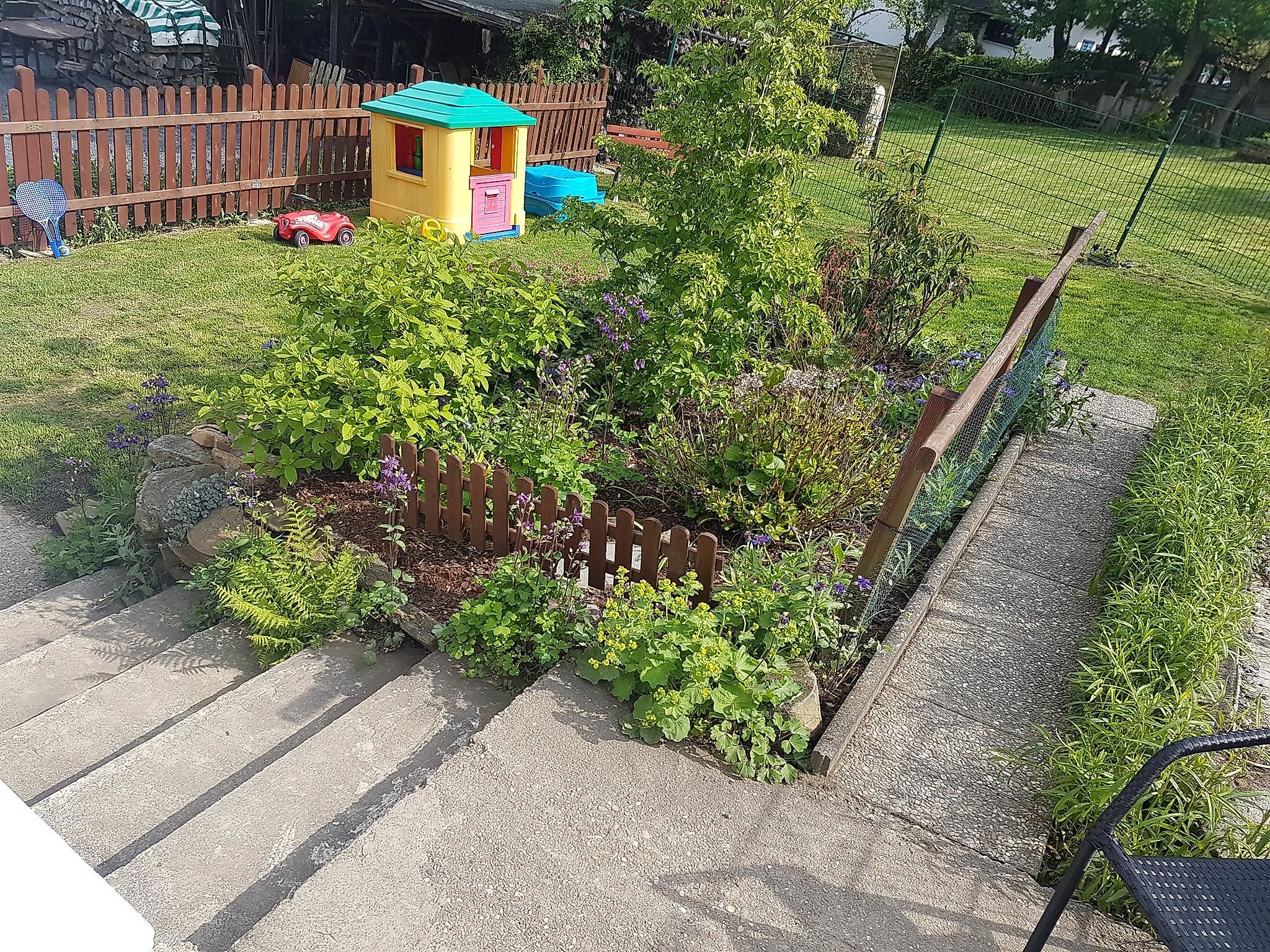 Auf dem Grundstück ist ein Steingarten, sowie ein Spielabschnitt für Kinder, dieser beinhaltet einen Sandkasten, eine Rutsche sowie ein Kinderspielhaus. Eine gemütliche Gartenbank lädt dazu ein den Kindern beim spielen zu zu schauen.