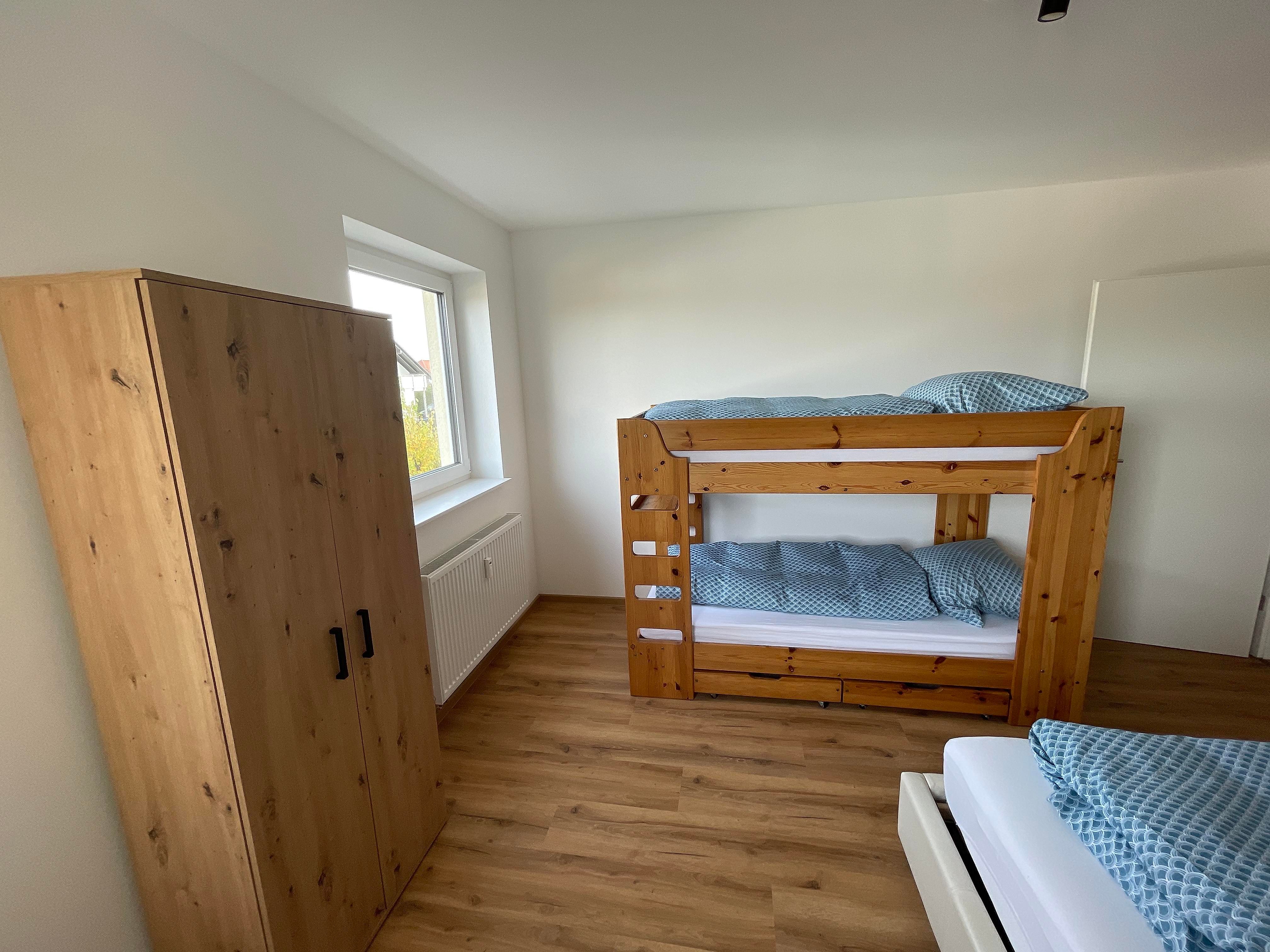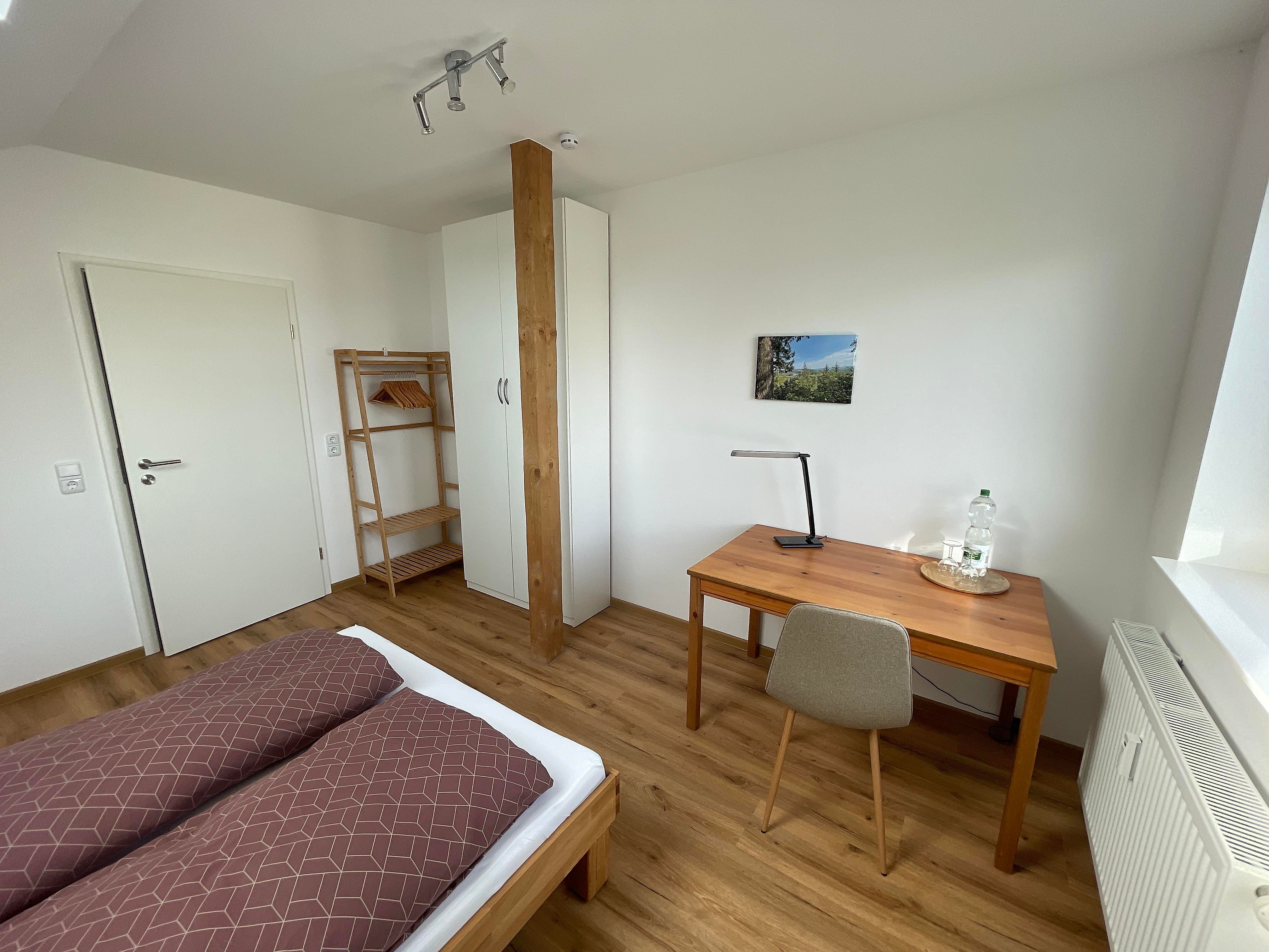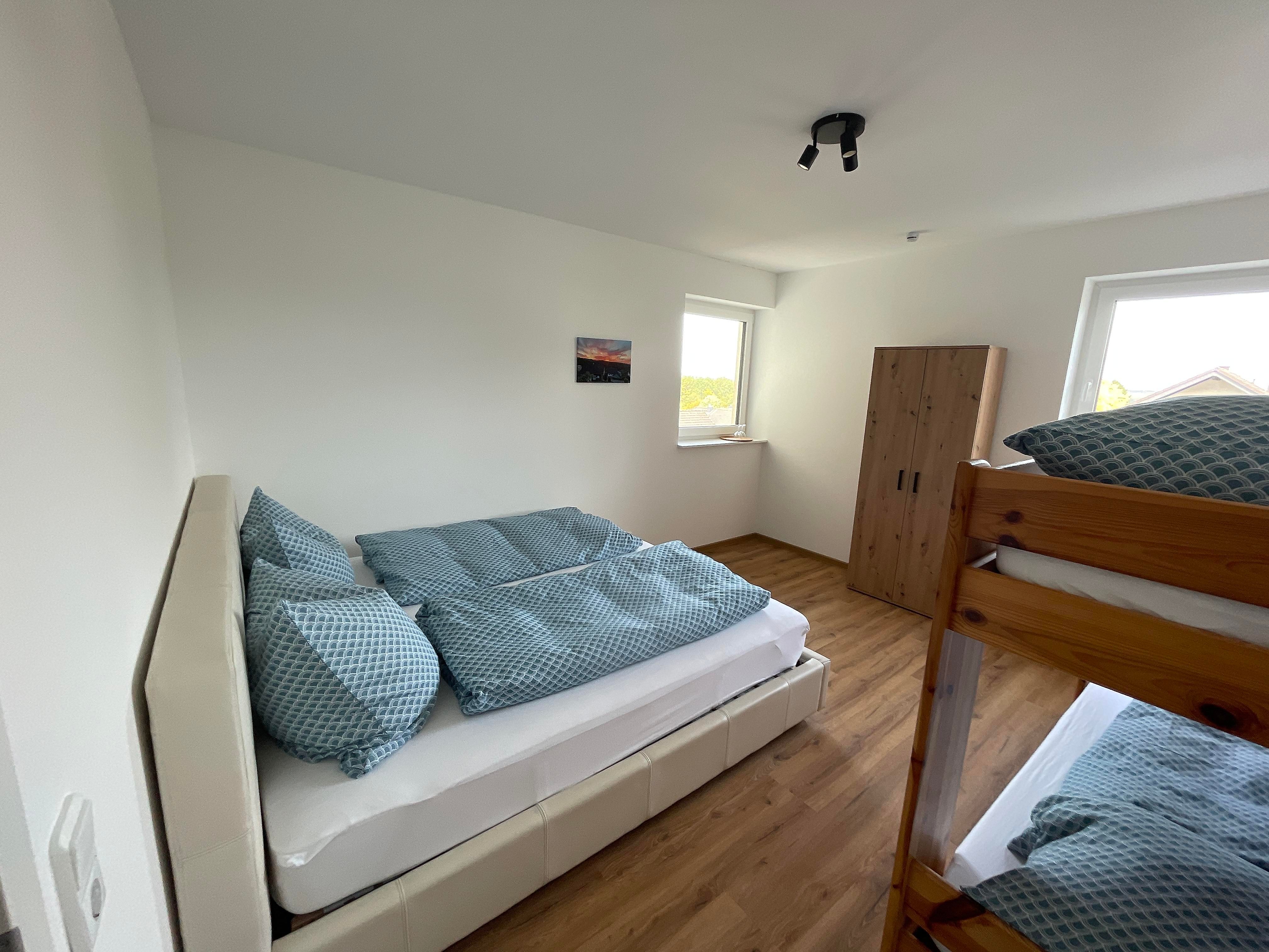 Die Ferienwohnung verfügt über zwei wunderschöne, lichtdurchflutete Schlafzimmer. Das erste Schlafzimmer besticht neben seiner Gemütlichkeit mit dem Doppelbett unter dem Dachfenster. Der Blick auf den Sternenhimmel ist bei einem wolkenfreien Himmel garantiert. Aus dem Fenster blicken Sie über Müschenbach, den Müschenbacher Gemeindewald sowie über die gesamte Kroppacher Schweiz. Das zweite Schlafzimmer verfügt neben einem Doppelbett über ein Stockbett. Somit finden Sie in diesem Raum vier Schlafplätze. Neben den beschriebenen Schlafplätzen verfügt die Ferienwohnung optional über zwei Kinder-Reisebetten, sodass auch die Kleinsten sicher und gemütlich schlafen.