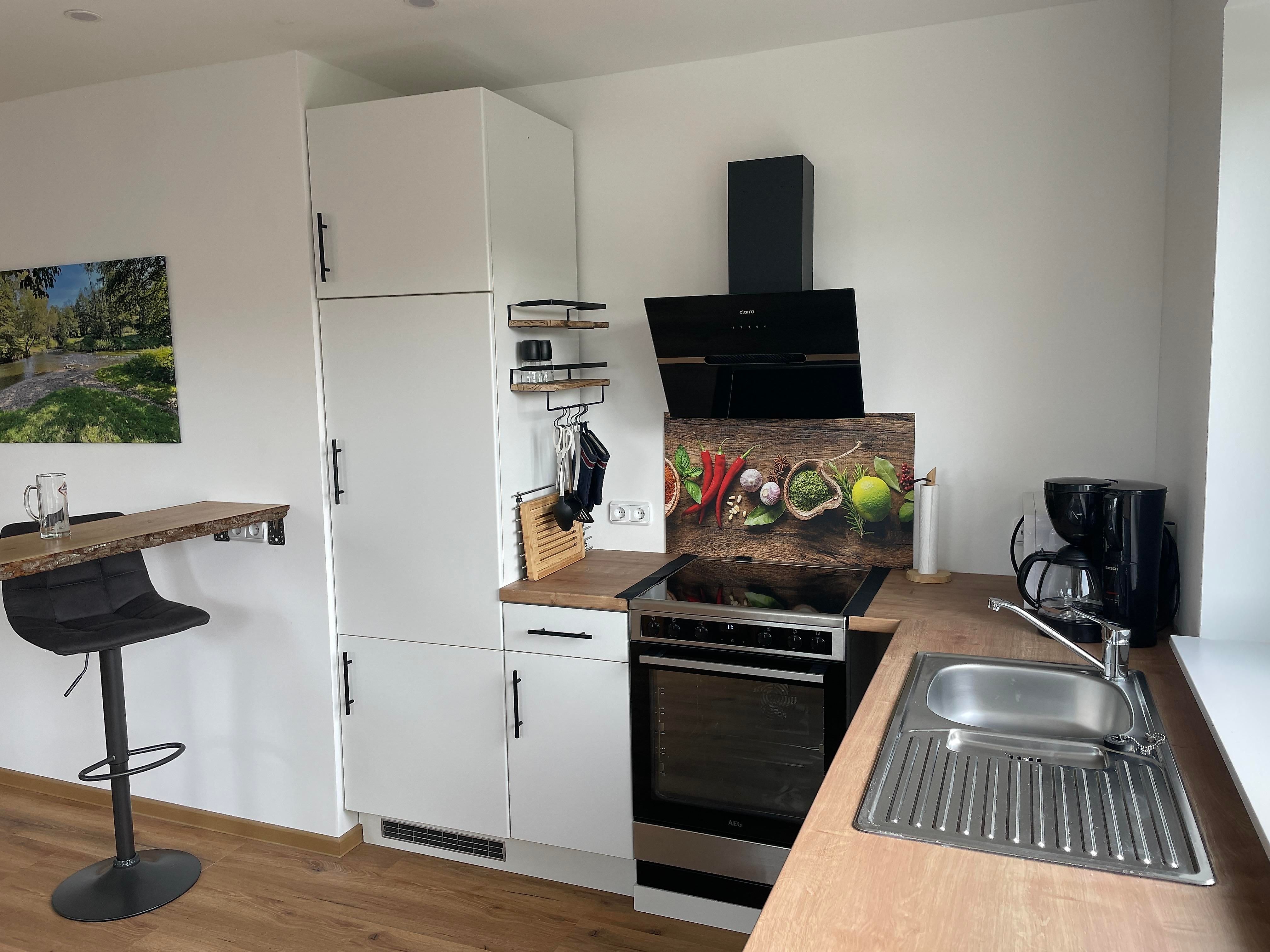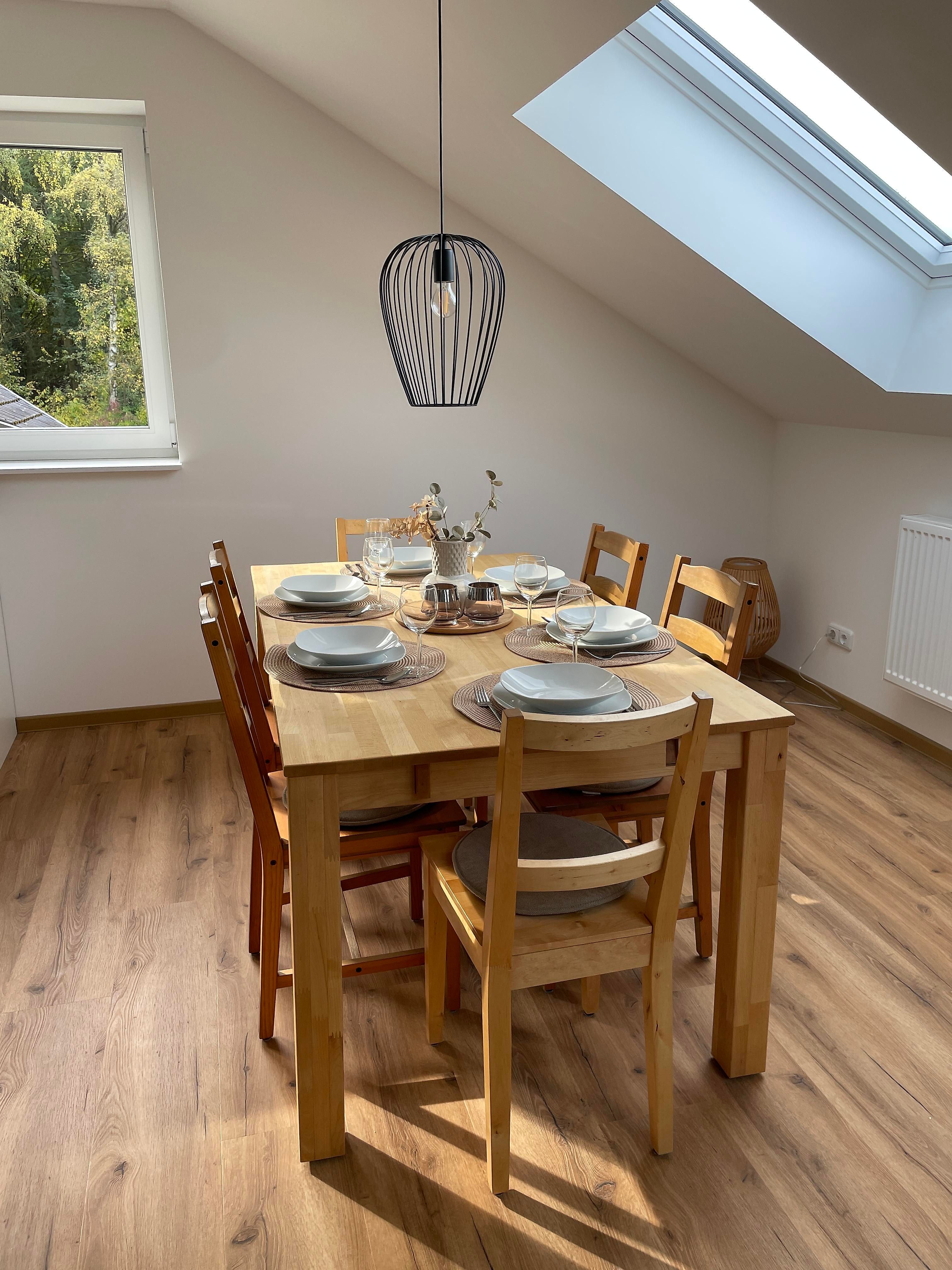 Der Höhepunkt unserer Ferienwohnung ist der offen und modern gestaltete Wohn- und Essbereich mit offener Wohnküchenzeile. Hier bleiben keine Wünsche offen. Die weiße Küche mit integrierter Bar ist ein absoluter Blickfang. Sie läd zum Verweilen und Wohlfühlen ein. Genießen Sie eine Tasse Kaffee oder Tee an der Bar mit Blick auf den Müschenbacher Wald oder lassen Sie den Abend bei einem Glas Wein oder Bier ausklingen. Hier kommt jeder auf seine Kosten. In der Küche, welche wir mit Markengeräten – Backofen, Spülmaschine, Mikrowelle, Kaffeemaschine, etc. - ausgestattet haben, wird jedes Essen zum Genuss. Da wir für Ihren Aufenthalt Gewürze, Spülmittel, Klarspülmittel, Mülltüten, Kaffeefilter, Spül- und Abtrockentücher bereitstellen, können Sie Ihren Urlaub direkt beginnen lassen. Der massive Holztisch strahlt absolute Gemütlichkeit aus. Hier kann man das Leben genießen. Die drei großen Dachfenster schaffen einen lichtdurchfluteten Wohnbereich, an dem man sich erholen kann und die Seele frei atmen kann. Der gemütliche Wohnzimmerbereich rundet das Raumkonzept ab. Ein komfortables Sofa und ein gemütlicher Sessel laden zum Verweilen ein. In den beleuchteten Schränken und Kommoden finden Sie alles was Sie brauchen... ein paar Klassiker zum Lesen, ein paar Spiele, Spielsachen für Kinder und vieles mehr. Natürlich darf auch ein Fernseher mit HD-Empfang nicht fehlen. Das Sofa kann bei Bedarf zu einem Doppelbett ausgezogen werden. Für die kleinsten Gäste können zwei Kinderhochstühle bereit gestellt werden. In der gesamten Wohnung haben Sie W-LAN Empfang. Weiterhin nutzen Sie gerne die Möglichkeit Ihre Endgeräte mit den vorhandenen LAN-Anschlüssen zu verbinden (max. Download 100 Mbit/s, max. Upload 6 Mbit/s).