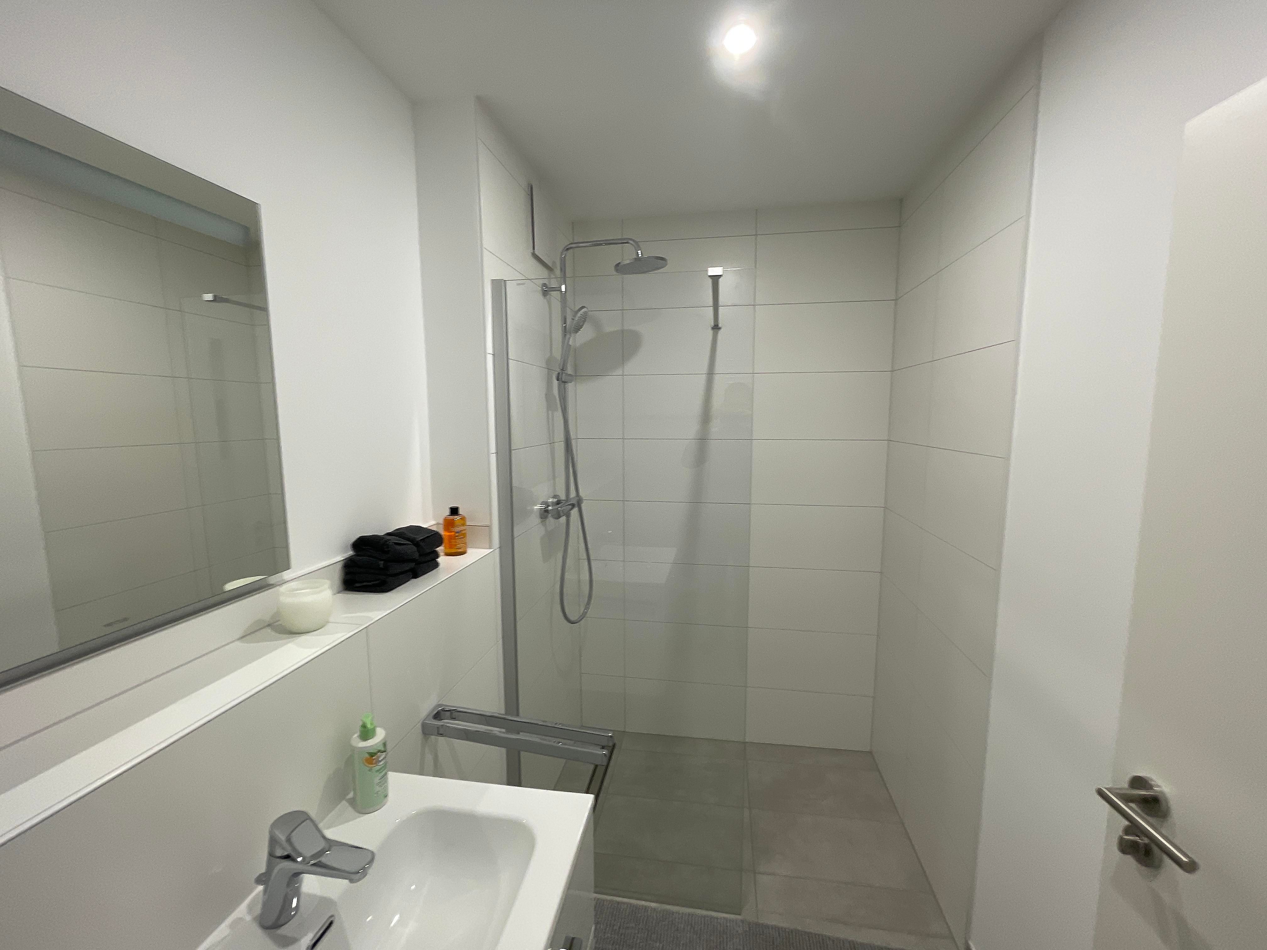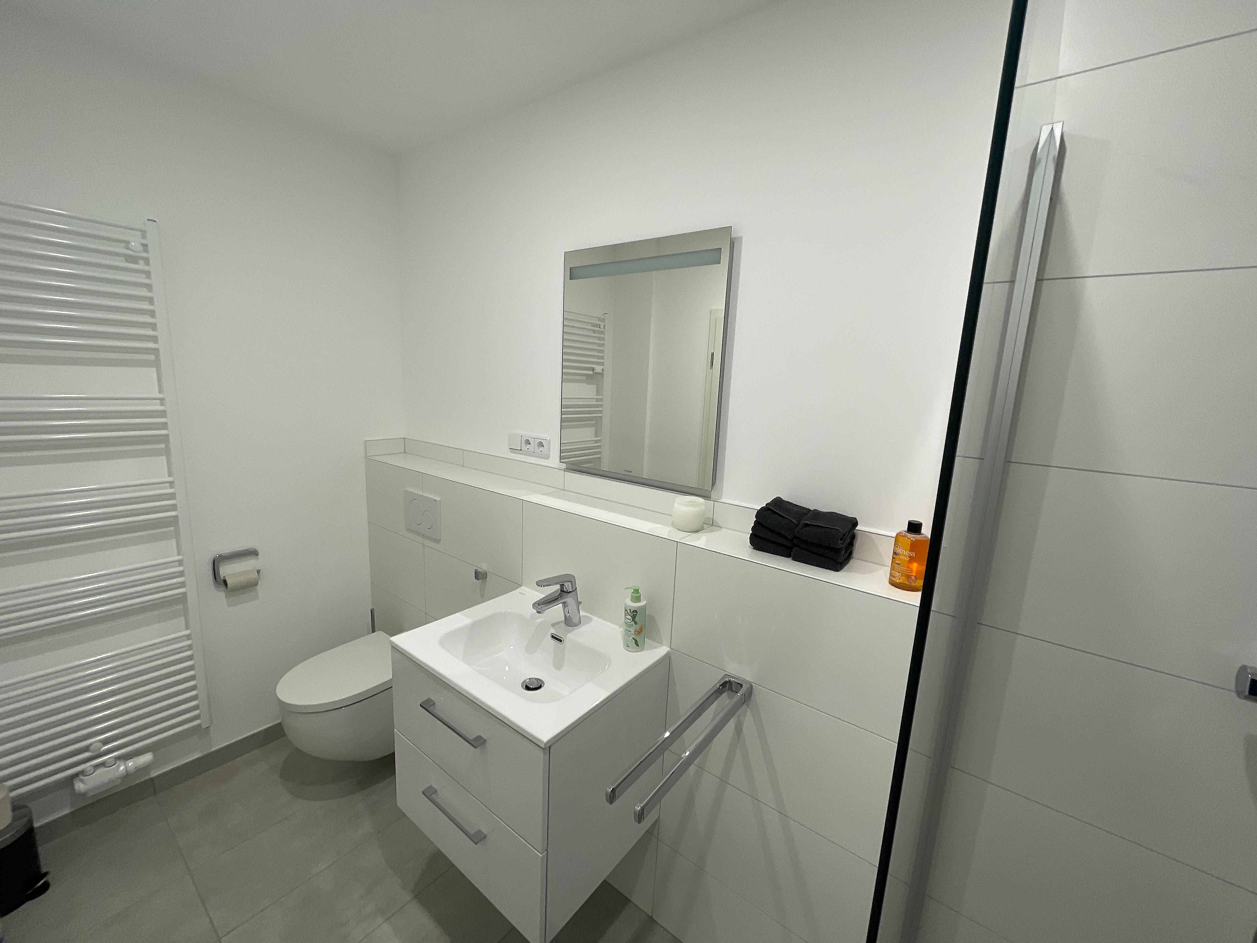 Weiterhin verfügt unsere Ferienwohnung über ein modernes Bad. Die ebenerdige Regenwalddusche verspricht ein einmaliges Duscherlebnis. Der Spiegel mit integriertem Licht untermalt das Wellnesserlebnis. Am großen Heizkörper können Sie die zur Verfügung gesellten Hand- und Duschtücher trocknen und warmhalten (je eins pro Person und Woche). Die Handseife sowie ein Fön gehören ebenfalls zu den Annehmlichkeiten der Wohnung.