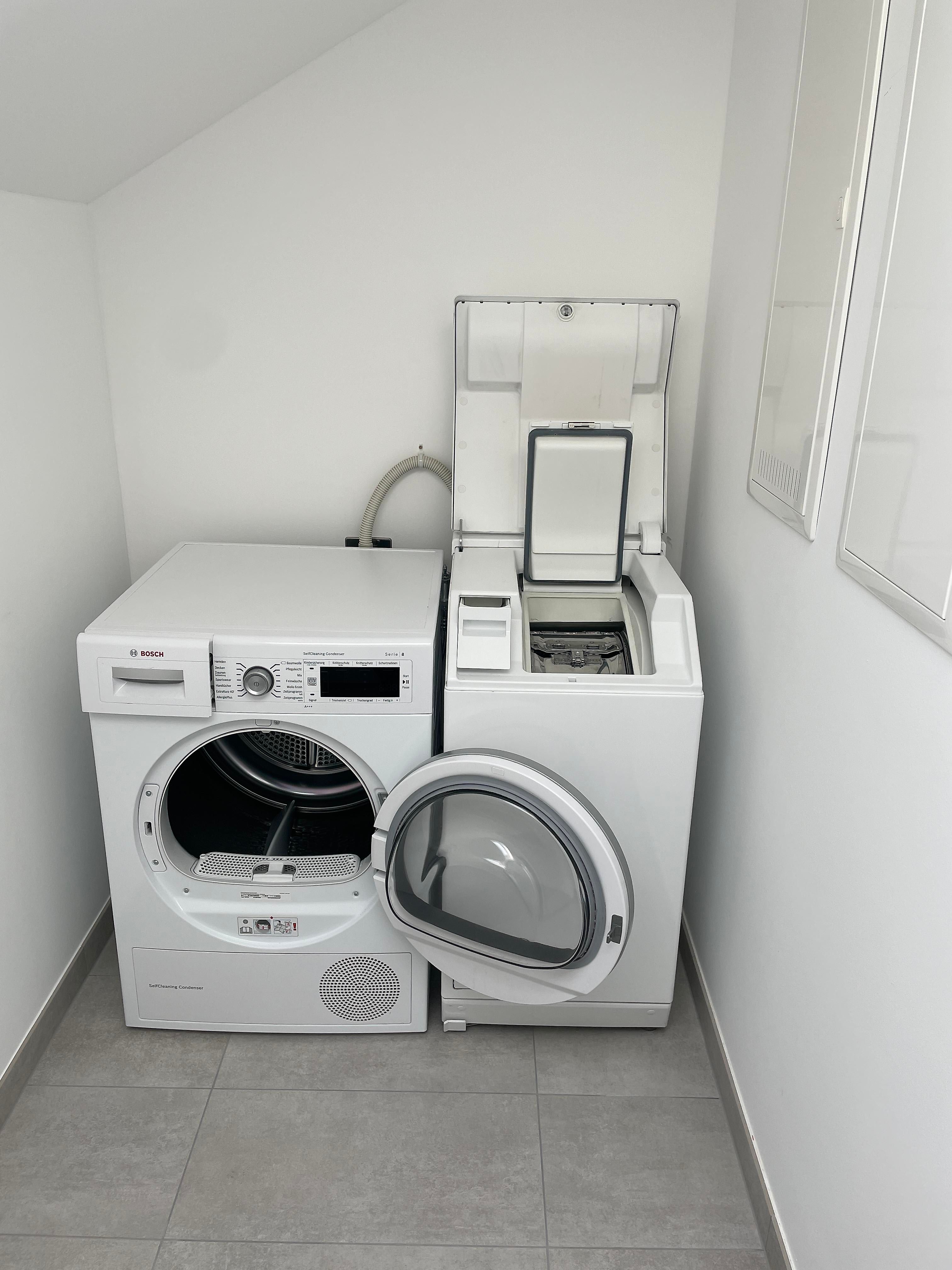Im Eingangsbereich der Ferienwohnung finden Sie einen kleinen Hauswirtschaftsraum, welcher mit einer Miele Waschmaschine und einem Bosch Trockner ausgestattet ist. Color-, Universal- und Wollwaschmittel sowie Kalkschutz sind Teil der Wohnungsausstattung und müssen nicht extra mitgebracht werden.