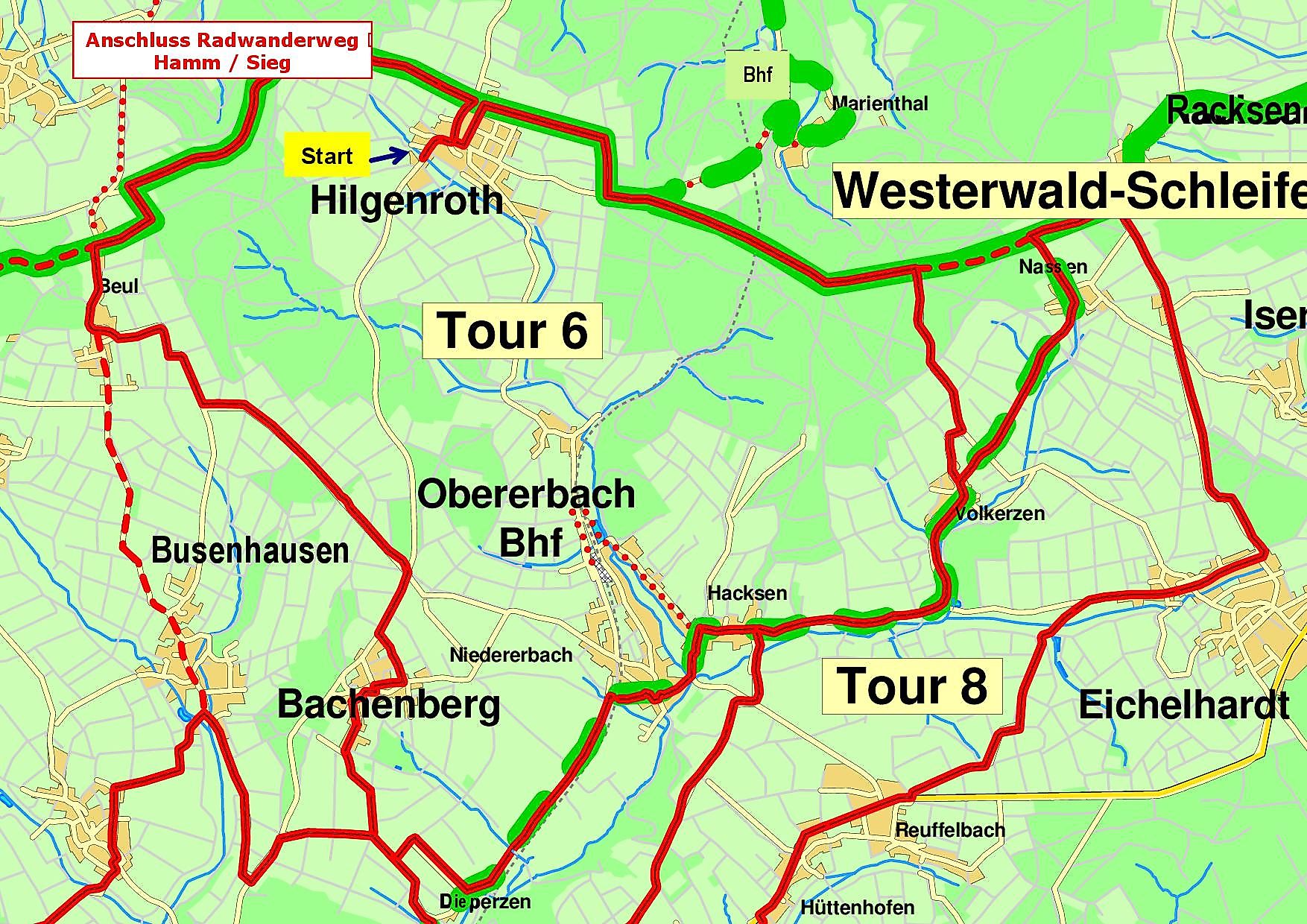 Die Radtour 6 kann von den Bahnhöfen Obererbach (ca. 0,6 km) oder Altenkirchen (ca. 3 km) erreicht werden. Hier verkehrt die Regionalbahn 90 (Windeck/Au - Obererbach - Altenkirchen - Limburg).
