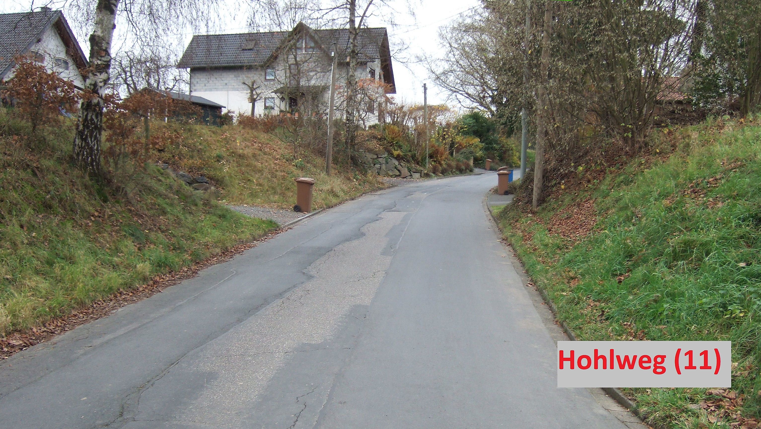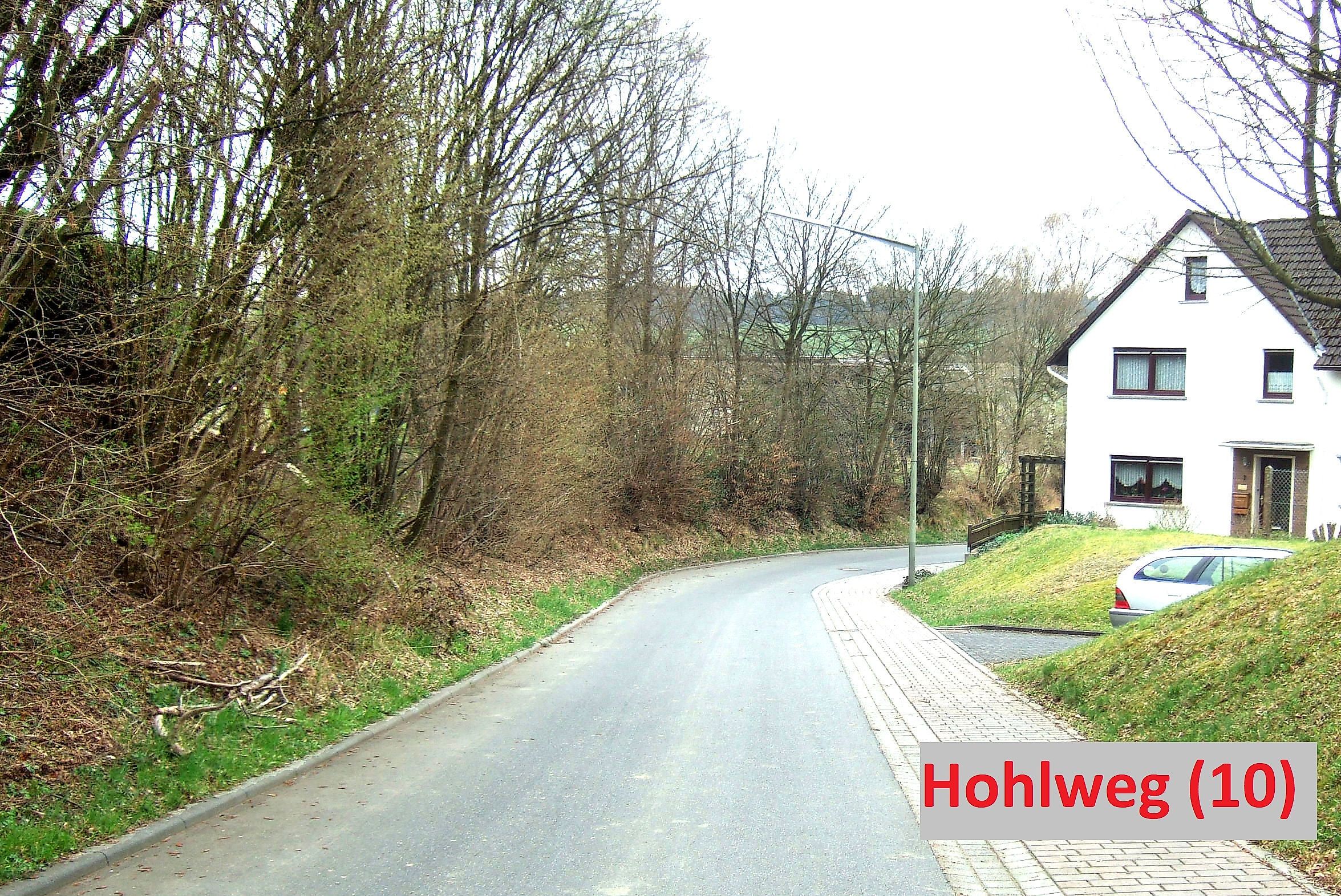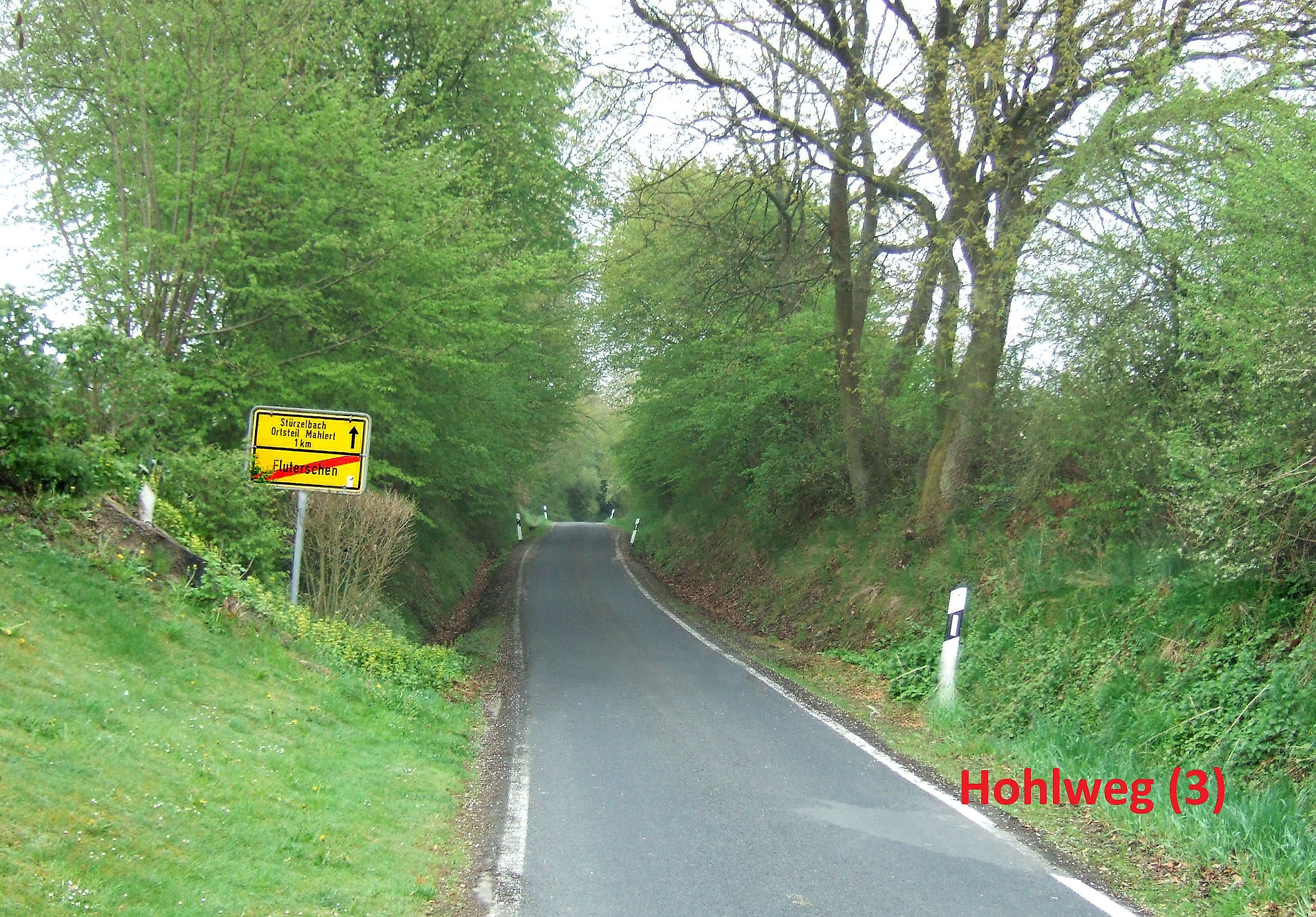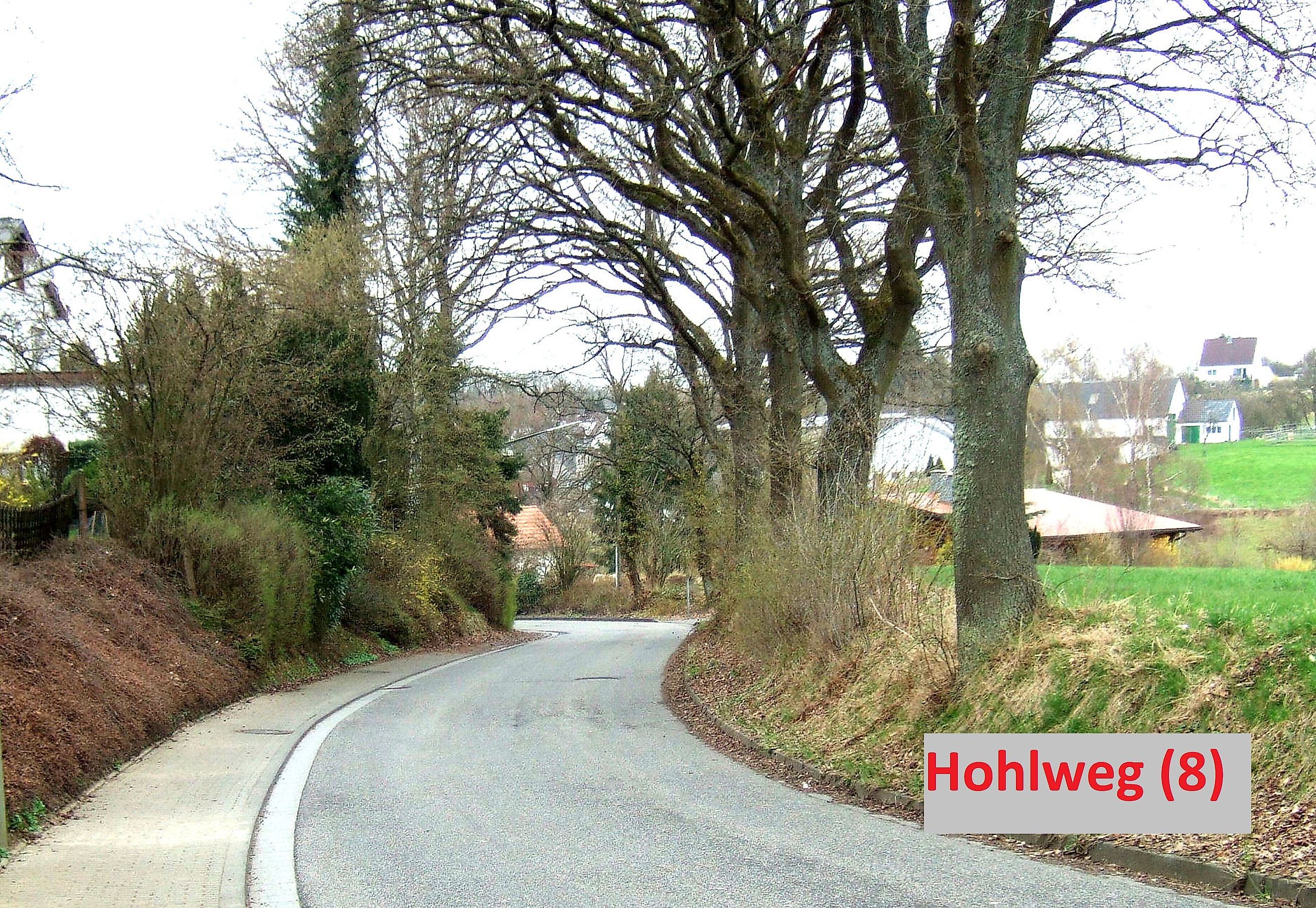 Kurz vor dem Ort durchfahre ich den Hohlweg Nr.(3), der als geteerte Straße kaum noch als ehemaliger Hohlweg wahrgenommen wird. Ich quere die Koblenzer Straße, fahre ca. 100 m auf der Straße "Zum Allen" und biege dann nach links in den "Eichenweg"ein.