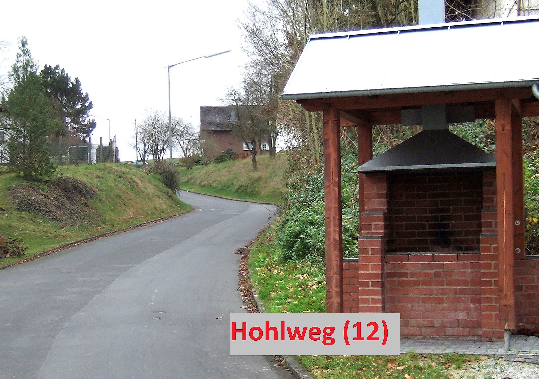 Weiter im Ort mache ich noch einen Abstecher zum "Dorfplatz". (1.Straße rechts "Auf der alten Bitz" abbiegen – ca.150 m fahren). Am Amterother Dorfplatz beginnt hinter der alten Dreschhalle die Straße "Hohlweg" und in Ansätzen kann ich auch den früheren Hohlweg Nr.(12) erkennen.