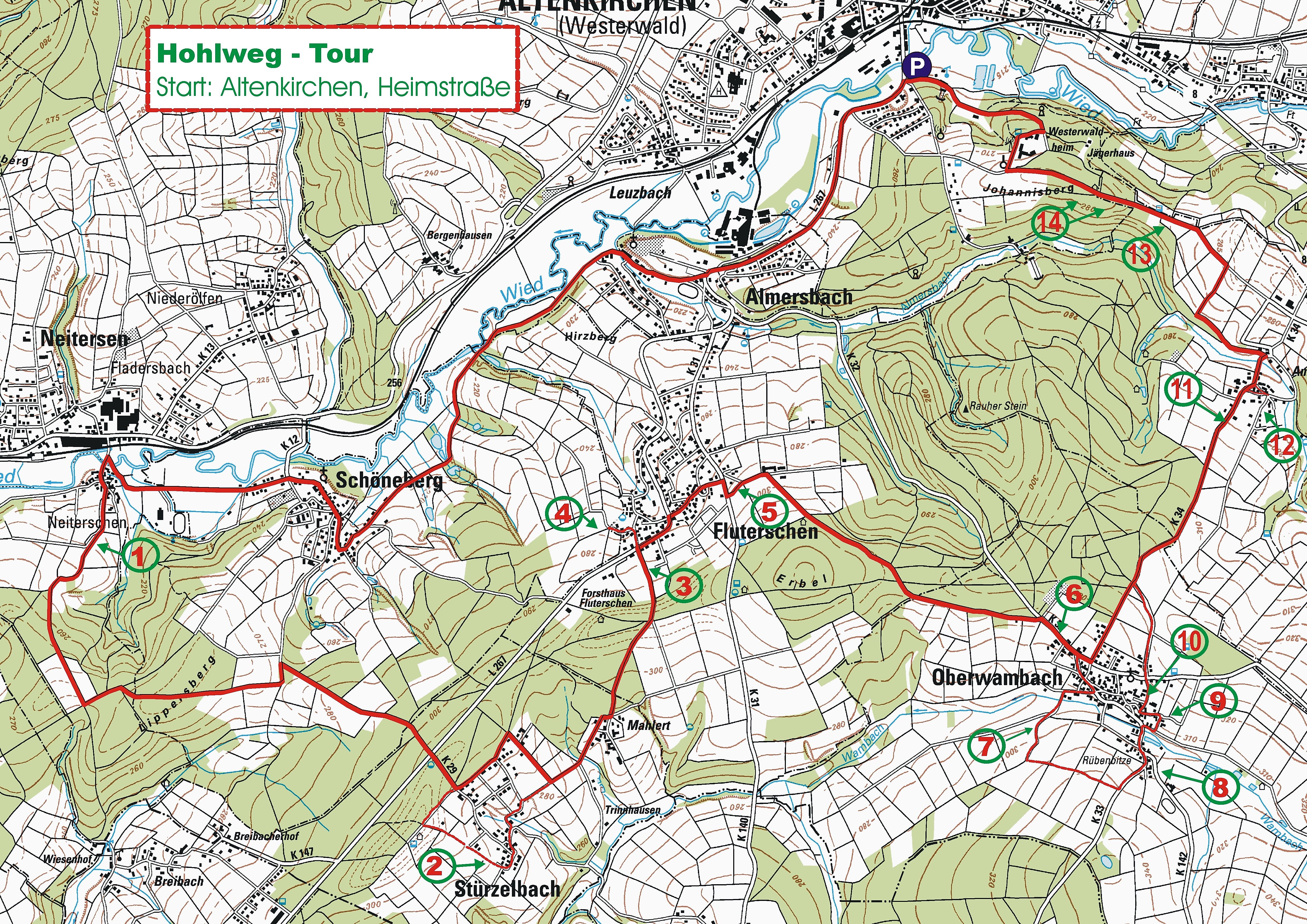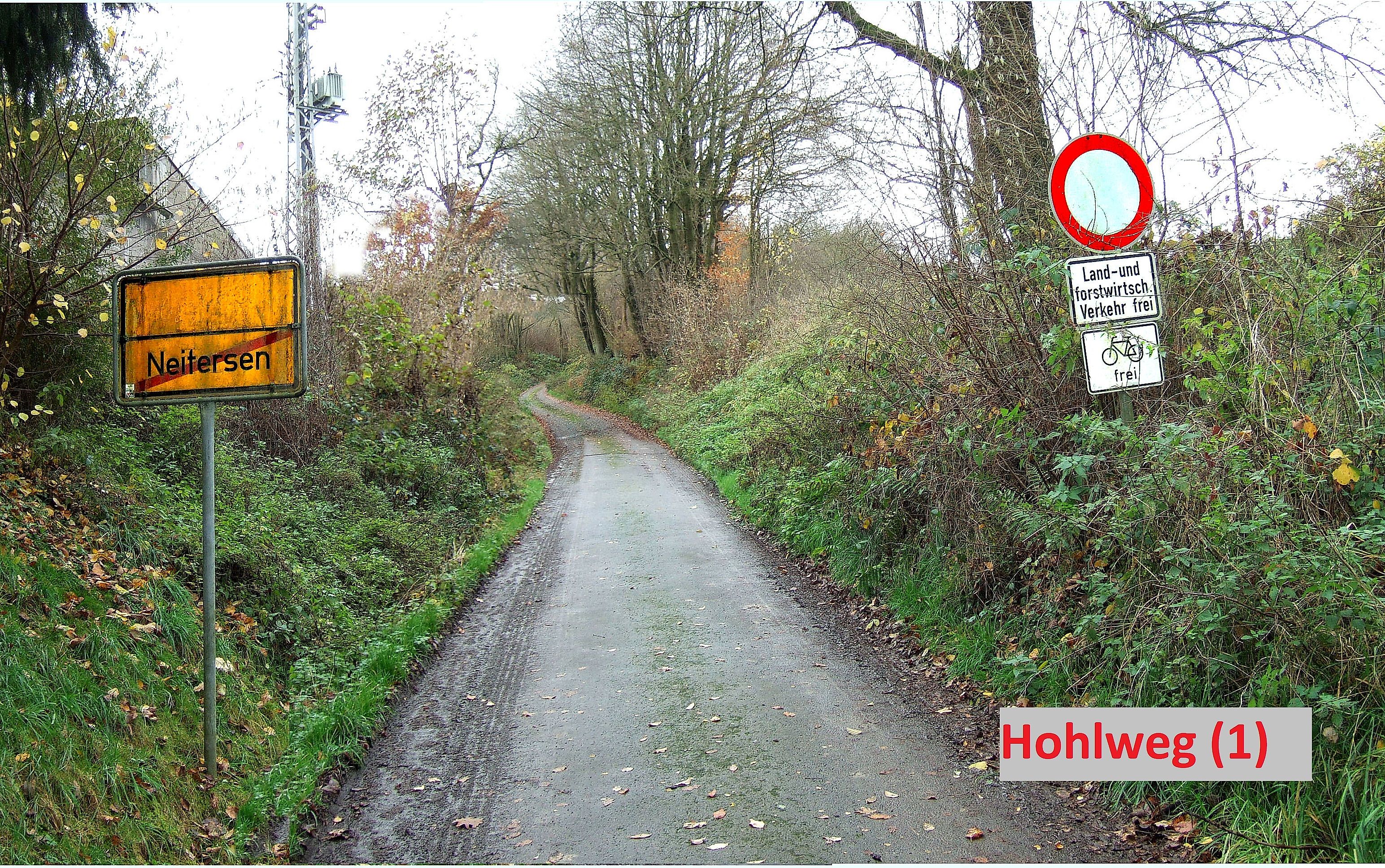 Vom Startpunkt aus geht es Richtung Almersbach und dann nach Neitersen. Direkt hinter dem Kino "Wied-Scala" – durchfahre ich den ersten Hohlweg (1). Ich folge der beschilderten Radtour Nr. 4 bis Stürzelbach, fahre hier aber hinter dem Ortseingangschild nach rechts . Ca.200 m weiter (vor dem Parkplatz der Grillhütte), geht es links in einen Wirtschaftsweg. Nach weiteren 200 m befindet man sich mitten im Hohlweg "Gartenstraße". Über die Talstraße und Fürstenbergstraße erreiche ich die Feldstraße nach Mahlert und fahre weiter nach Fluterschen.
