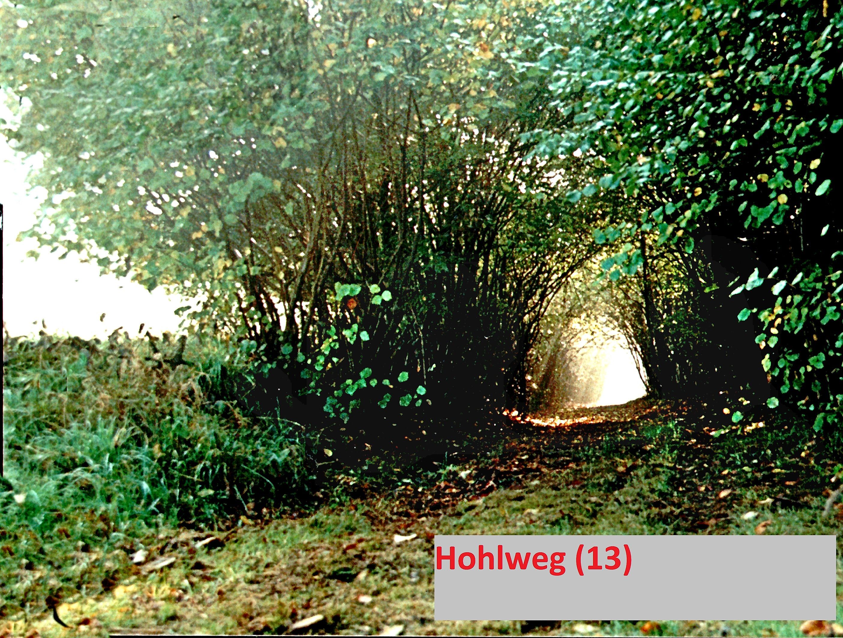 Am Ende des "Eichenwegs" führt ein Hohlweg rechts ins Tal. Den Hohlweg Nr.(4) sieht man in der Ver-längerung des "Eichenweges". Beim Blick zurück sind einige knorrige Bäume zu entdecken. Ob die "gebückten" Hainbuchen einst Teil eines "Gebücks" gewesen sein können? –