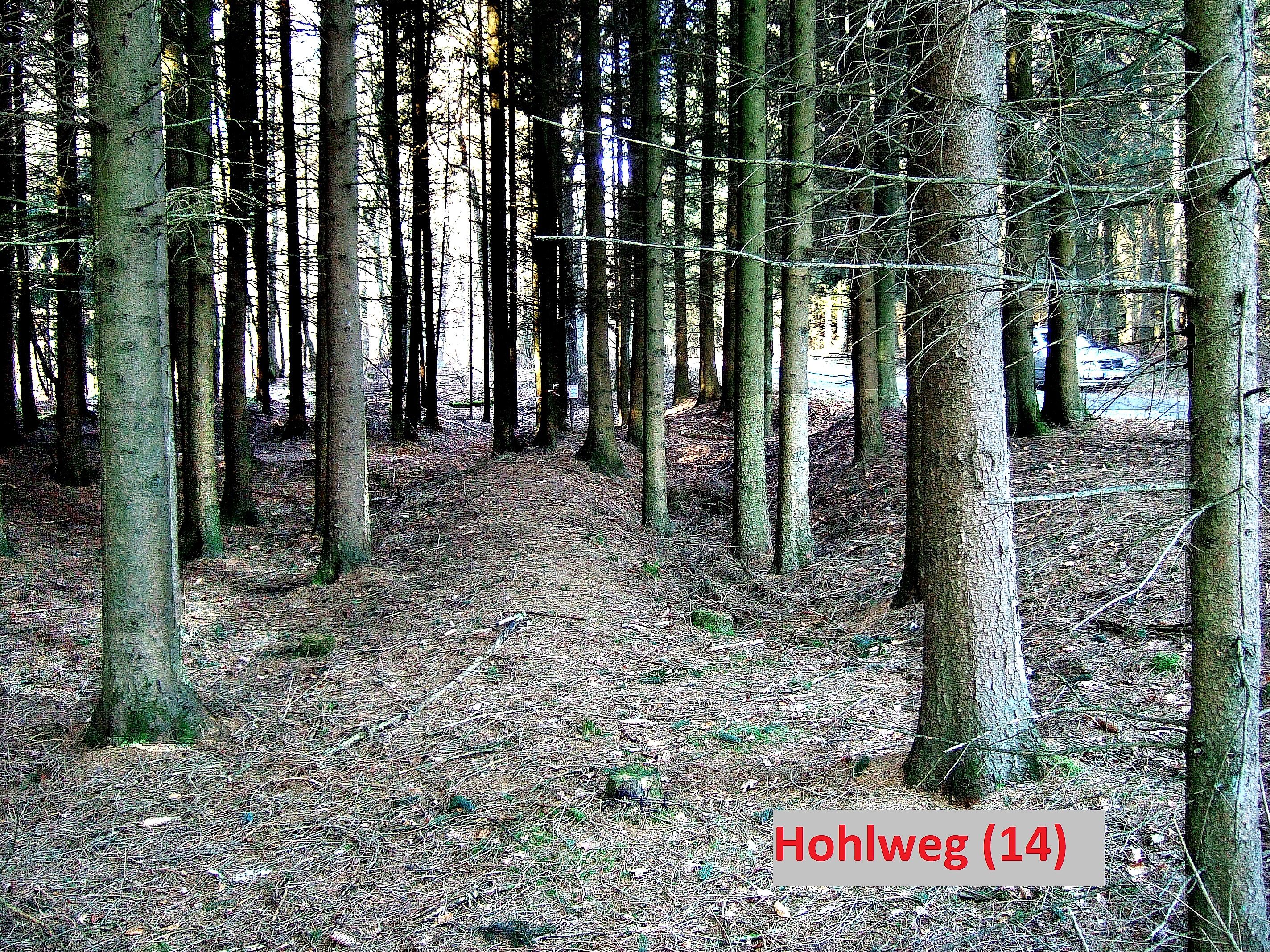 Links, vor dem ersten Fichtenforst beginnt der Hohlweg Nr. (13), der durch die Nutzung mit Fahrzeugen entstanden war, denn der Hohlweg führt relativ steil hinab ins Almersbachtal. Parallel dazu erkennt man im Wäldchen eine zweite Fahrrinne.