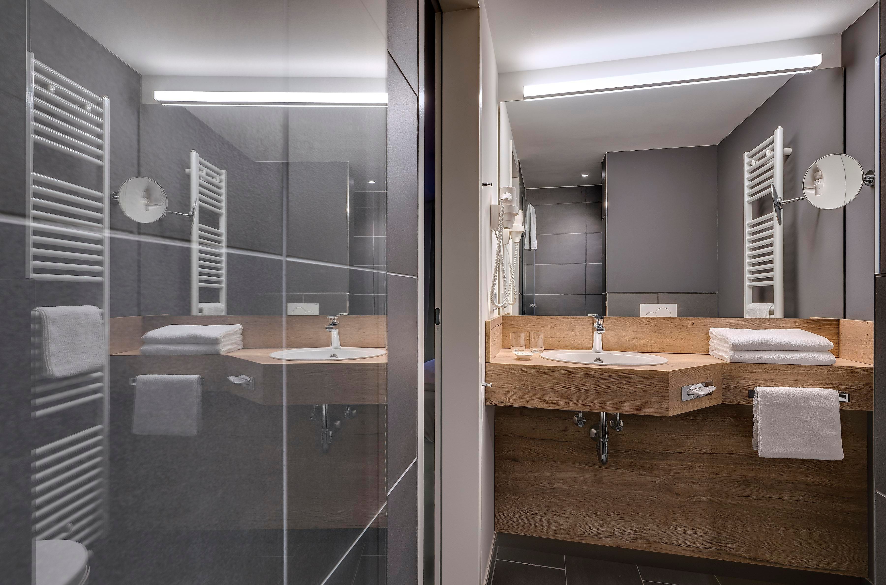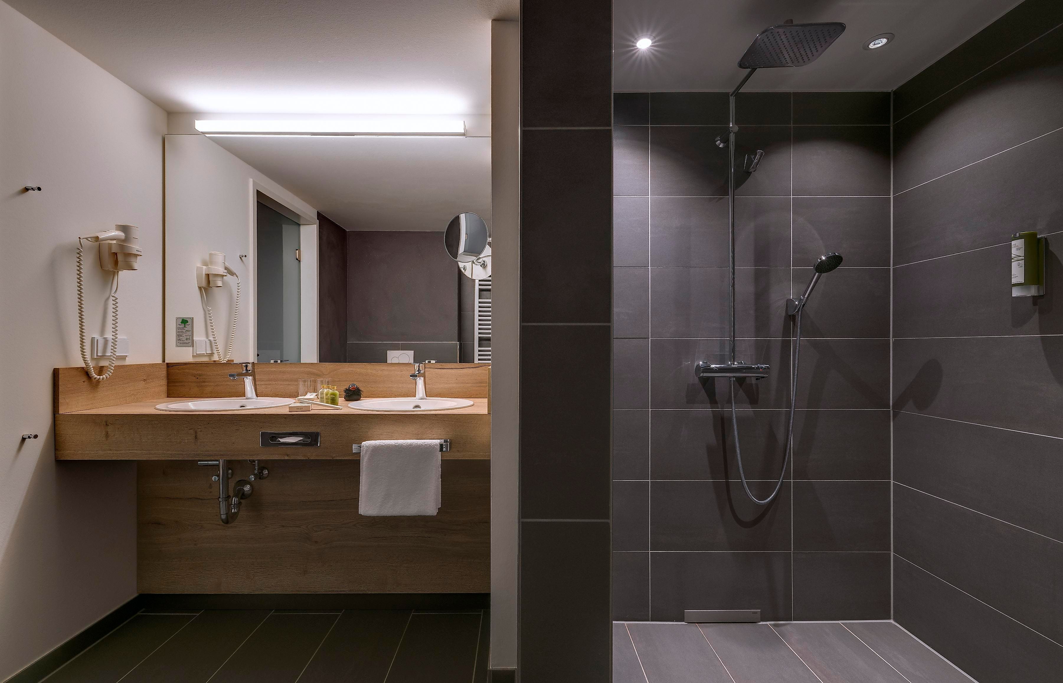 Besondern viel Platz bieten auch die Junior- Suiten mit barrierefreier Dusche. Alle Suiten haben einen Doppelwaschtisch.