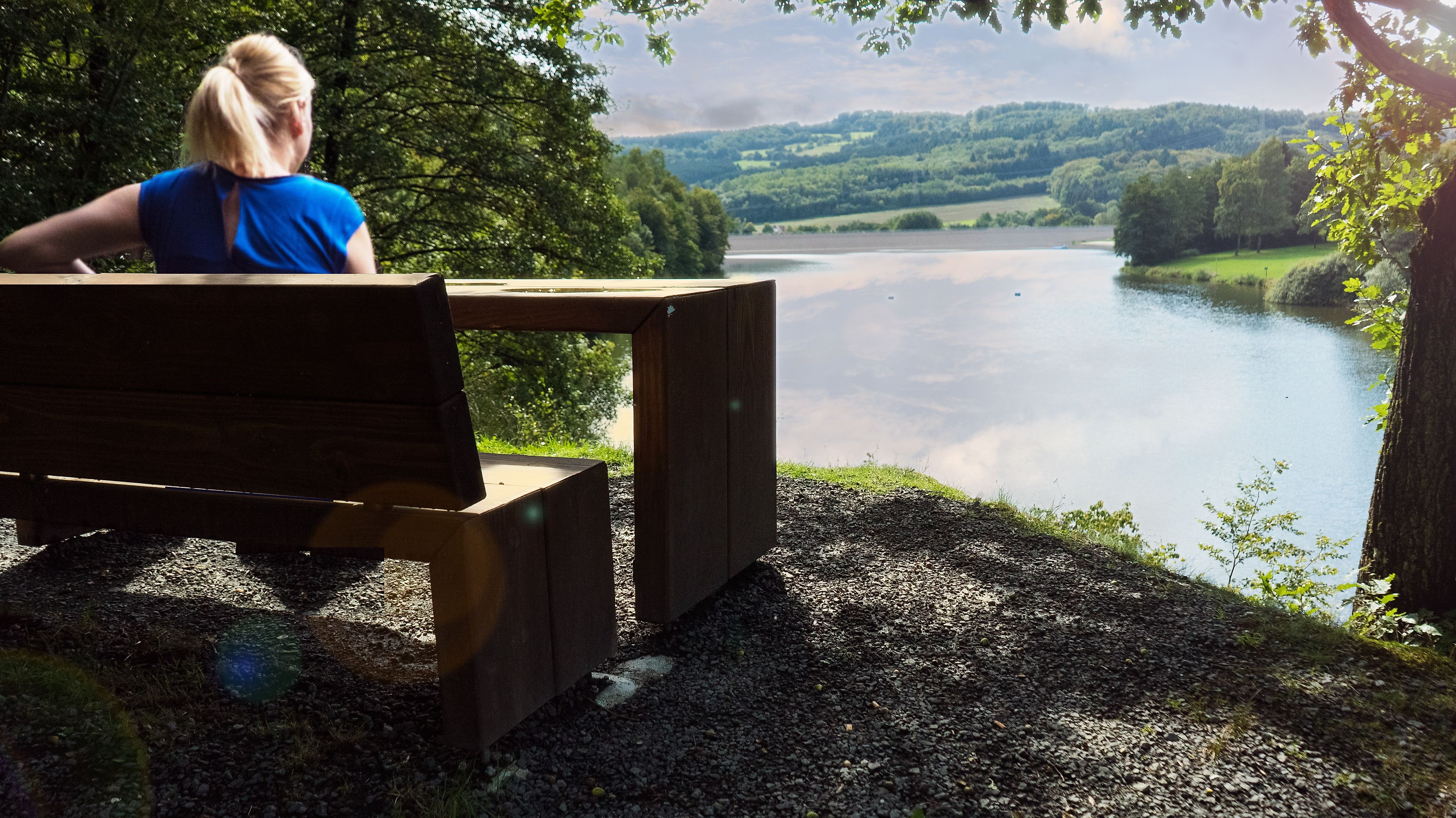 Am Ende des Parks überquere ich zum letzten Mal den Ulmbach und dann die Schloßstraße. Ich folge der Straße „Zur Schmalburg“ etwa 100 Meter bergauf, dann biege ich links auf den asphaltierten Ulmtalradweg ab. Die ehemalige Trasse der Ulmtalbahn, auf der zwischen 1921 und 1976 sogar der legendäre BALKAN-EXPRESS verkehrte, wurde in mehreren Abschnitten zu einer Rad-/Gehwegverbindung ausgebaut. Dieser verbindet Westerwald und Lahntal auf einer Strecke von knapp 22 Kilometern. Rechts lädt mich der große Rastplatz „Beilstein“ ein, auszuruhen und den Blick auf einen Nachbau der ehemaligen Ton-Verladeanlage zu werfen. Eine Infotafel erzählt vom Basaltabbau mit historischem Hintergrund. Gut gestärkt gehe ich weiter auf dem Ulmtalradweg, vorbei an einem weiteren, kleineren Rastplatz, die ehemalige Haltestelle „Wallendorf“. Kurze Zeit später erreiche ich einen Aussichtspunkt, wo ich auf einer Liegebank den Blick auf die Ulmbachtalsperre und ins Ulmtal genieße. Kurz bevor ich die Radwegtrasse verlasse, bewundere ich die beiden denkmalgeschützten Brückenbauwerke aus Basalt, die 2019 saniert wurden. Zurück an der Ulmbachtalsperre kommen meine Badesachen zum Einsatz, denn im Sommer wird die Sperre zum Badesee und am Ufer warten einige Angler auf ihre Beute. Gleich daneben liegt ein Campingplatz mit Zelt- und Wohnwagenplätzen sowie vier Minihäusern zum Übernachten für Radfahrer und Wanderer.
