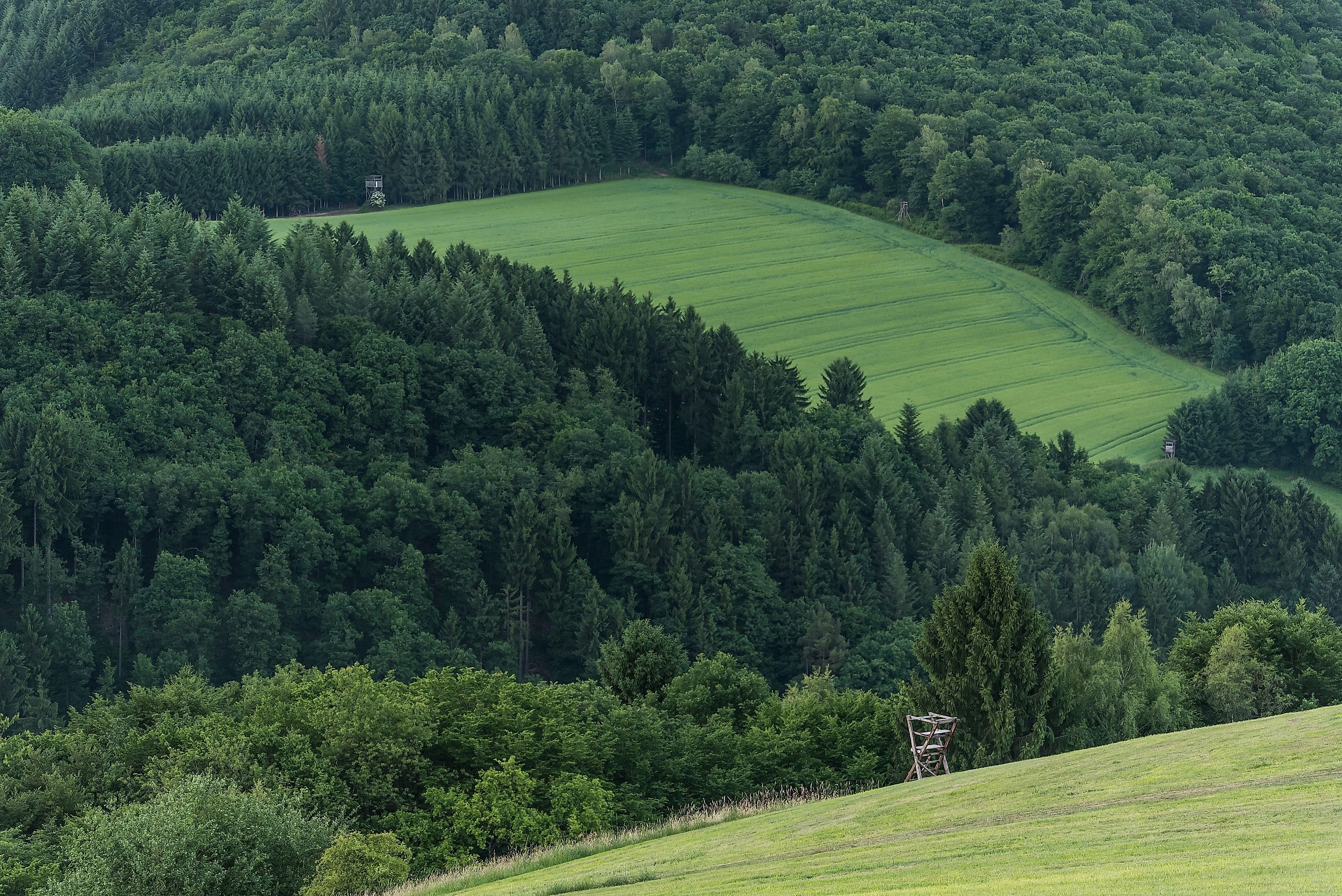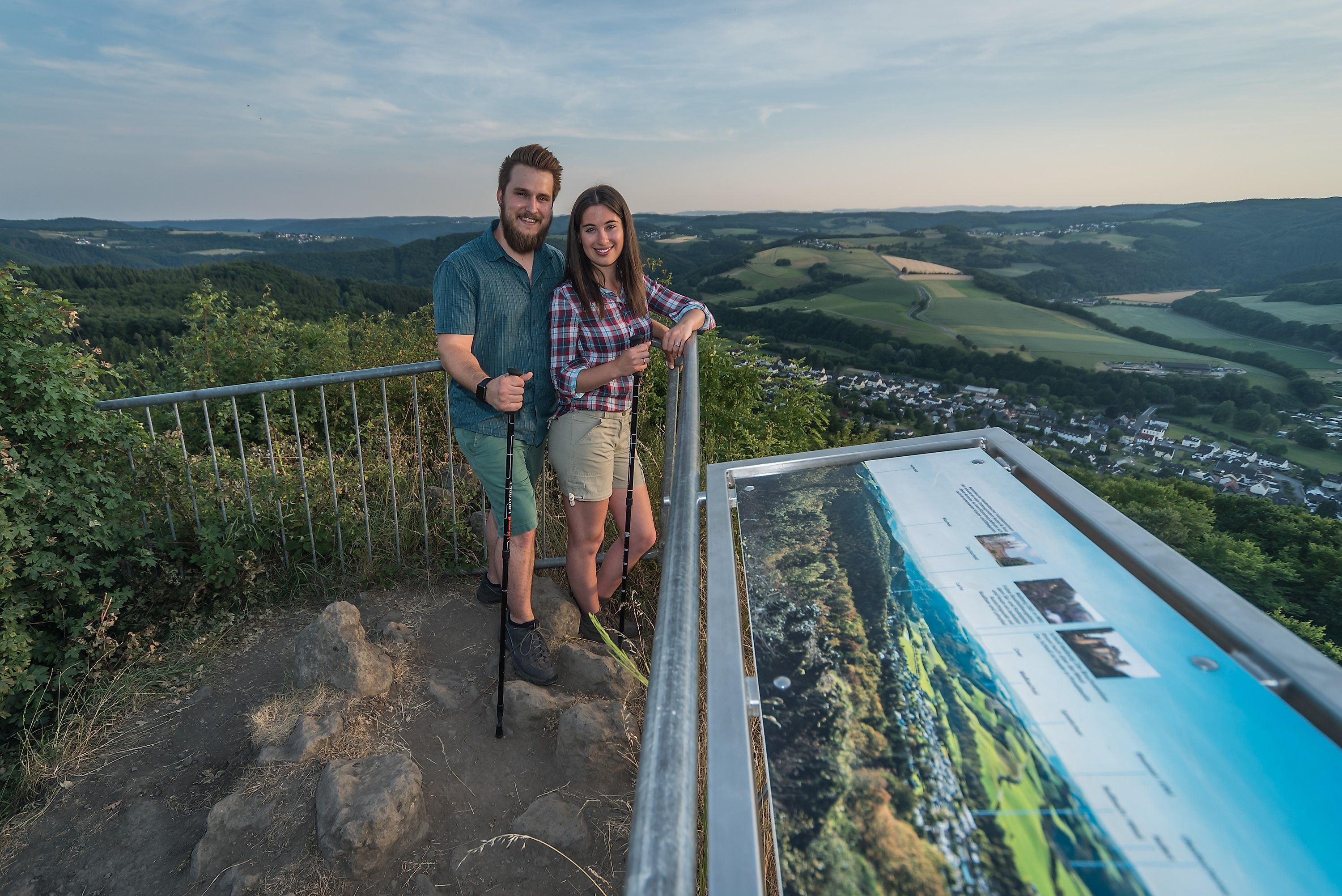 Vom Aussichtsplateau auf dem Gipfel bietet sich ein herrlicher Ausblick ins frühlingshafte Wiedtal, bei guter Sicht sogar bis ins Siebengebirge und die Eifel.