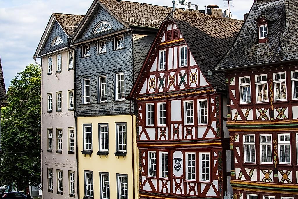 Los geht es durch die Bahnhofstraße. Ich wähle die steile Variante und durchquere zunächst nach rechts den Stadtpark, gehe am Dillturm vorbei, überquere die vor mir liegende Straße und passiere die Eisdiele (hier hole ich mir noch rasch eine kleine Stärkung, bevor es bergauf geht!). Danach biege ich linker Hand der Eisdiele wieder in die Fußgängerzone ein. Ich lasse die Obere Hauptstraße hinter mir, um kurz darauf am markanten Fachwerkbau mit der „Aufhocker-Figur“, die den Wanderern die Zunge herausstreckt, links in die Gasse „Breiter Winkel“ abzubiegen. Dort begrüßen mich die Blumen eines Privatbesitzes, direkt danach passiere ich die Stadtbücherei. In der Mühlgasse 5 am Ende des Winkels bewundere ich das älteste Wohnhaus von Herborn, das 1445 erbaut wurde, und in dem heute ein kleiner Gastronomiebetrieb untergebracht ist. Geradeaus gehe ich wenige Meter durch die Dreihäusergasse und dann weiter geradeaus die historische Treppenanlage „Kleine Grede“ hinauf. Das Fluss-Steinpflaster ist hier zum Teil noch aus alter Vorzeit erhalten. Für die steile Variante halte ich mich unmittelbar am Ende der Treppe rechts und spaziere unterhalb des Hauses Schulberg 22 etwa 100 Meter geradeaus bis zum ältesten erhaltenen Stadttor. Ich durchquere die „Steinerne Pforte“, gehe weiter geradeaus und passe beim Überqueren der Kallenbachstraße und der Nassaustraße auf den fließenden Verkehr auf. Dann wird mein Weg etwas anspruchsvoller: Direkt vor mir liegt der sehr steile, etwa 600 Meter lange Abschnitt der Dollenbergstraße. Diese führt mich zunächst durch ein Wohngebiet und dann durch die Natur hinauf zum Aussichtsturm Dillblick, der kurz vor dem Hessentag 2016 eröffnet wurde.