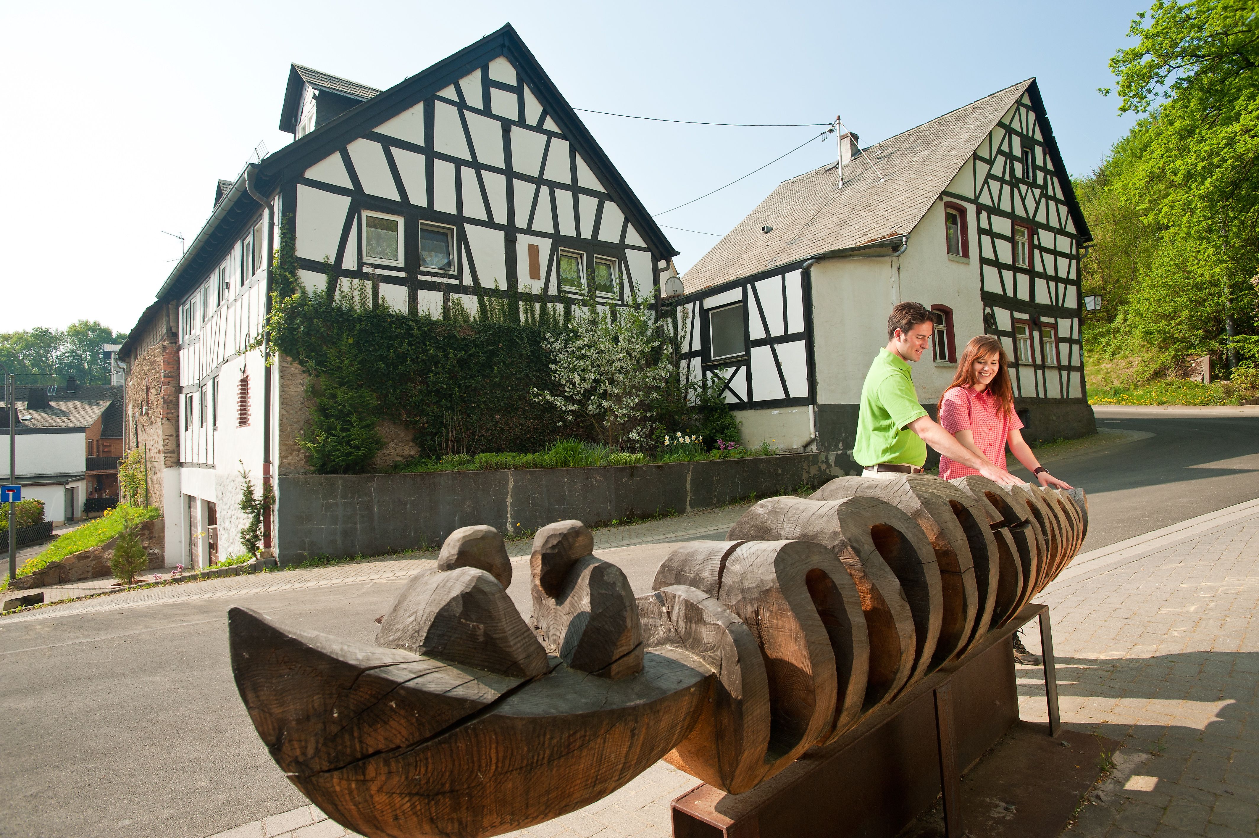 Der Wanderweg, der durch und über die Höhen des Gelbachtals und die Montabaurer-Stadtteile Wirzenborn, Reckenthal und Bladernheim führt, ist seit eh und je eine beliebte Flaniermeile mit Blick auf Schloss Montabaur in der Region südlicher Westerwald. Hier kannst du Wandern mit Kunstgenuss verbinden, denn nach insgesamt vier Holzbildhauer-Symposien auf dem Fischerhof in den Jahren 2009, 2010, 2011 und 2014 säumen jetzt 42 unterschiedliche Holz-Skulpturen die beiden Rundwanderwege.