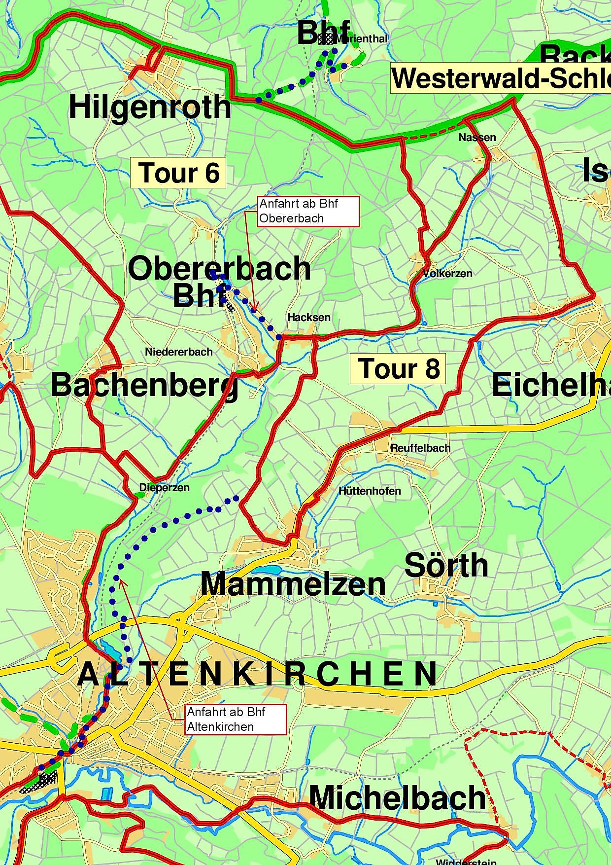 Die Radtour ist sowohl über den Bahnhof Obererbach (1 km) als auch über den Bahnhof Altenkirchen (3 km) gut zu erreichen. Die Regionalbahn 90 (Siegen-Au-Altenkirchen-Limburg) fährt hier im Halb- bzw. Stundentakt.