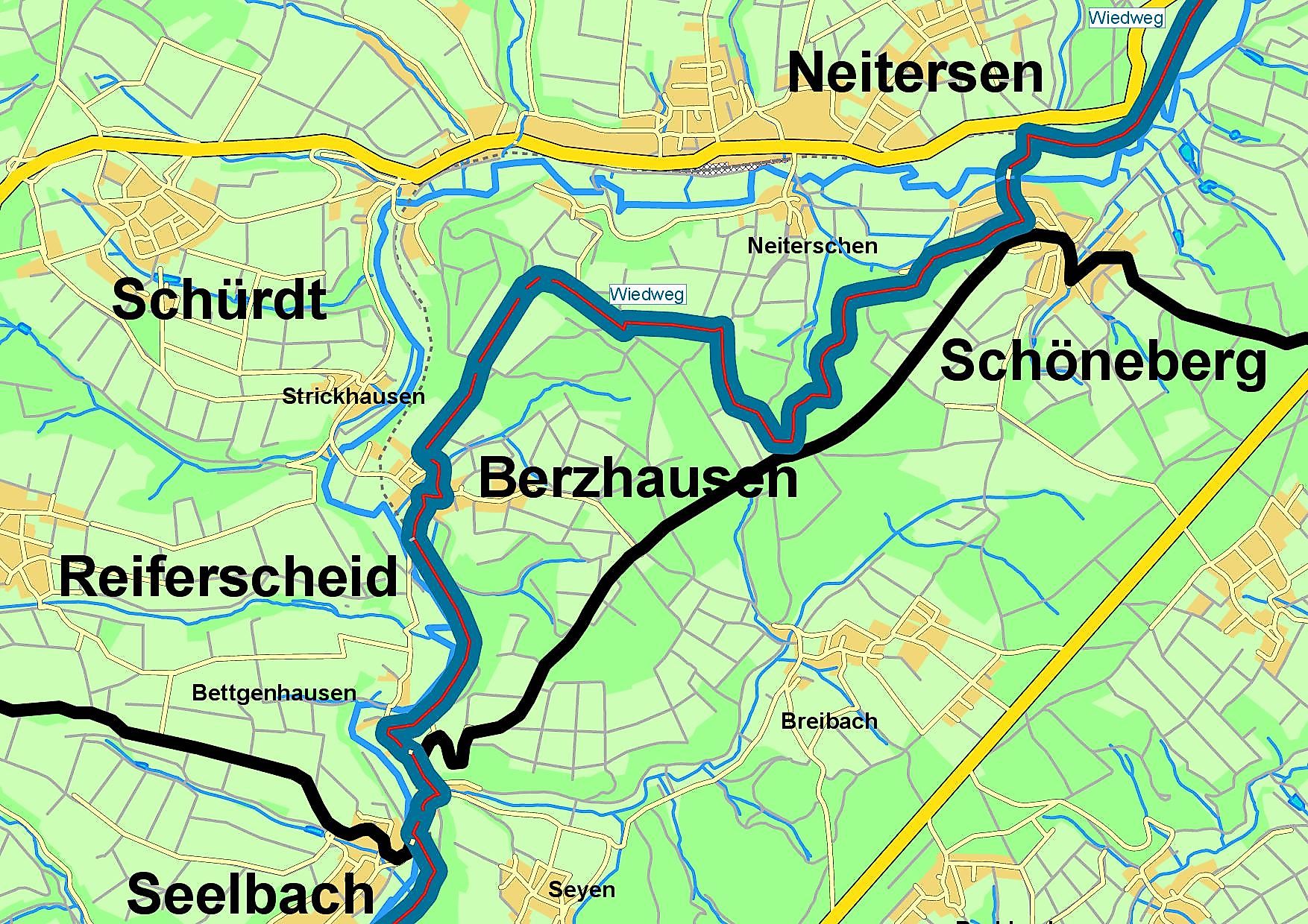 Einige freie Waldflächen und kleine Neuaufforstungen machen mir den Blick frei über die vielen kleinen Tälchen und Seifen, deren Wasser die Wied speist. Beim Funkturm, auf dem Obernauer Kopf, habe ich den höchsten Punkt erreicht und gehe nun mit Blick auf Berzhausen und Reiferscheid wieder ins Wiedtal hinab. Hinter der Ortsgemeinde Berzhausen erreiche ich die Bahngleise und wandere Richtung Bettgenhausen, einem Ortsteil von Seelbach. Alles Orte mit langer Geschichte und vielem Auf und Ab. So konnte sich Bettgenhausen, wie auch die anderen Dörfer in der Region bis ins 19. Jahrhundert nur langsam entwickeln. Daran war nicht nur der dürftige Ertrag der Landwirtschaft schuld, sondern auch die vielen Kriege, die das Land ruinierten. Der Westerwald diente immer als Durchzugsgebiet. Die Soldateska versorgte sich aus Dörfern und nahm den Einwohnern nicht nur die Nahrungsmittel und das Vieh, sondern quartierte sich auch ein und raubte alles, was brauchbar erschien. Mehr zur Geschichte dieser Orte findet man auf den Websites der jeweiligen Dörfern.