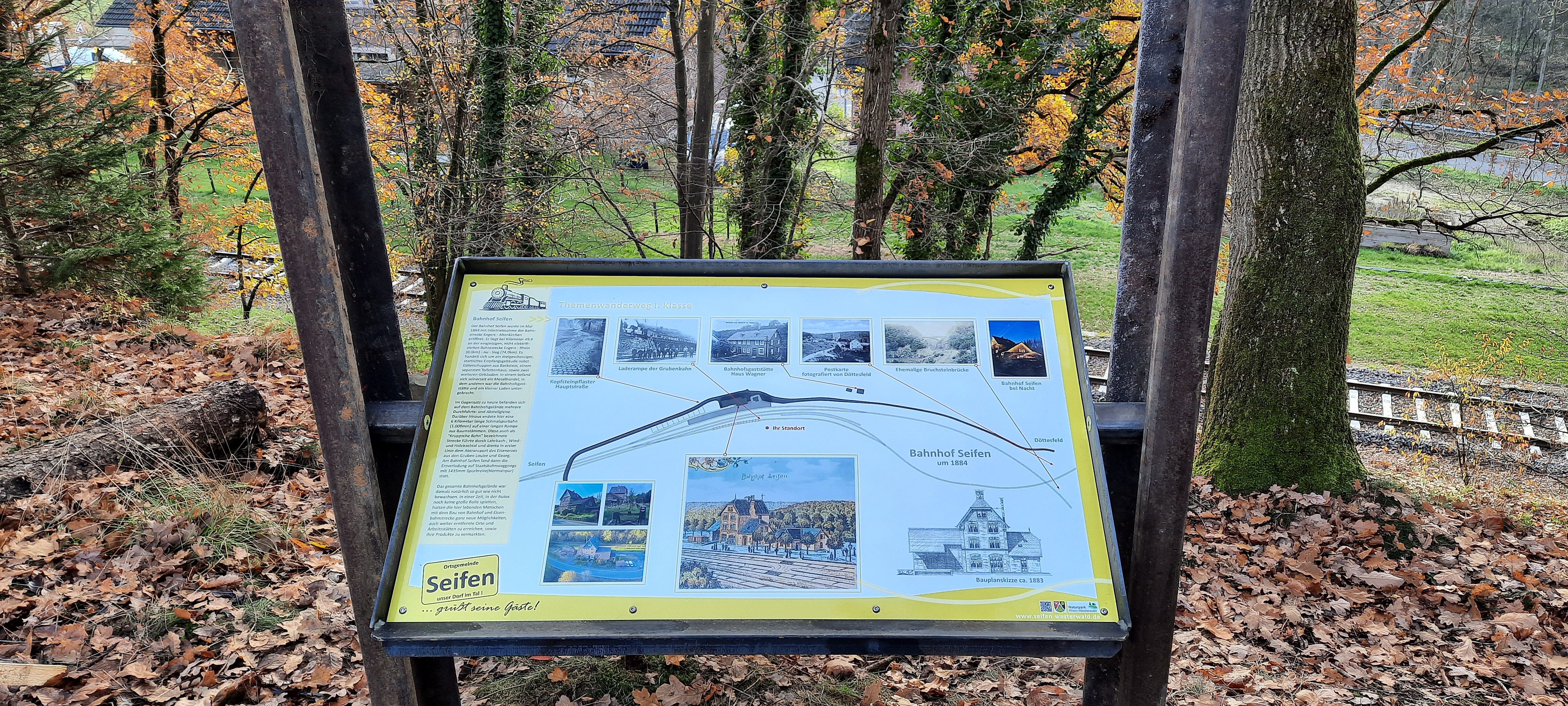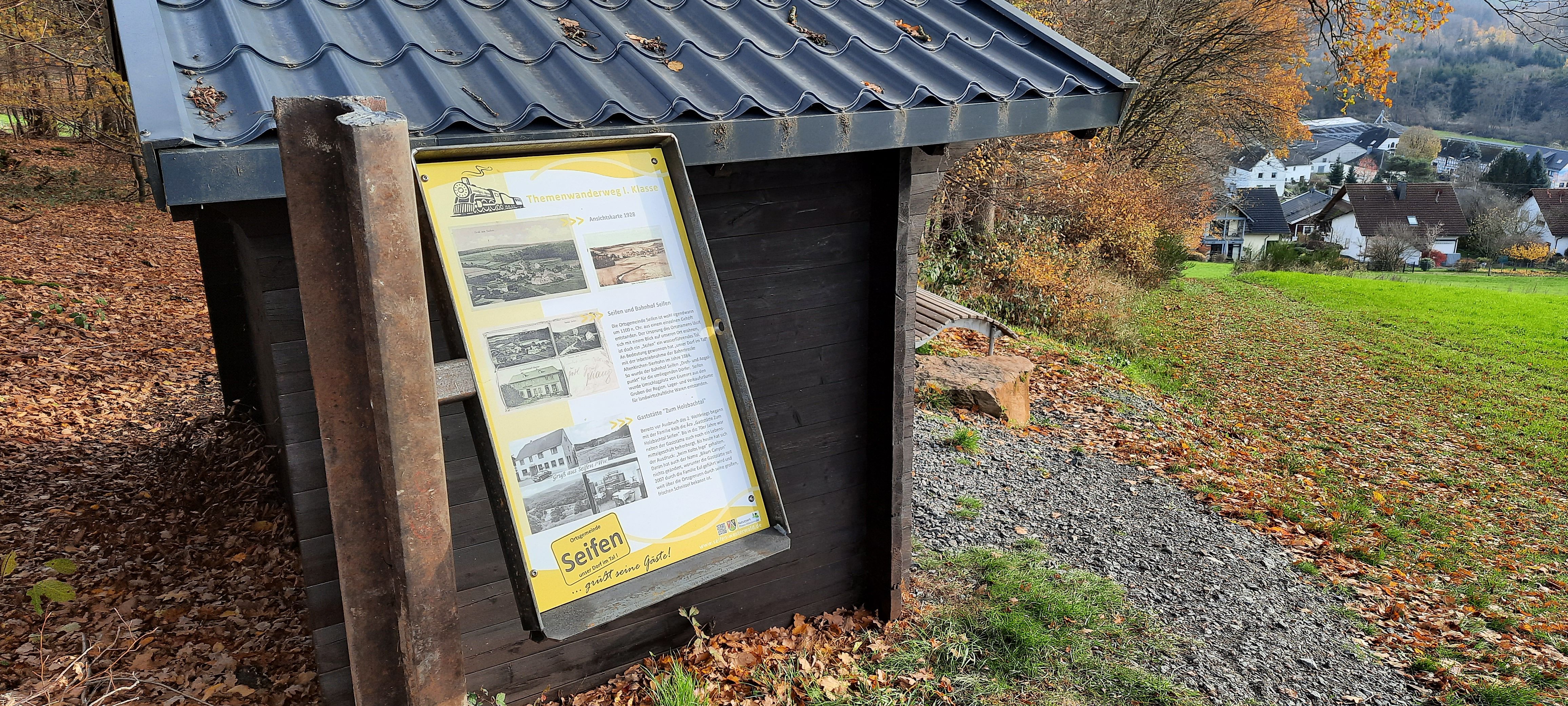 In der Ortsmitte von Seifen beginnt der Wanderweg, welcher mit einem Anstieg durch ein kleines Waldgebiet beginnt und zu einem wunderschönen Panoramablick über den Ort und in die Ferne führt. Weiter geht es am Friedhof vorbei. Hier erläutert uns eine erste Infotafel den Weg und die Zeit des Erzbabbaus in dieser Region.