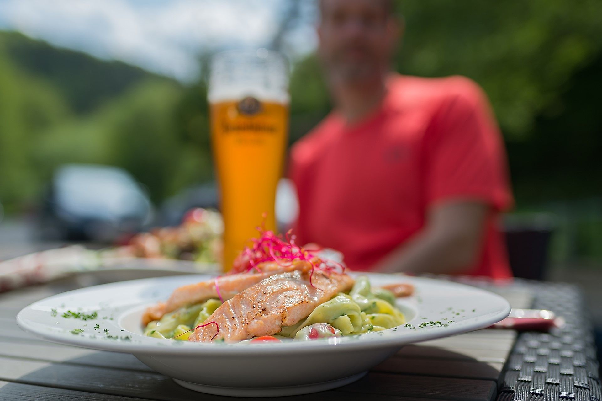 Wir starten den Rundweg T1 im Süden von Thalhausen an der Thalhauser Mühle mit Einkehrmöglichkeit und schöner Außenterrasse.