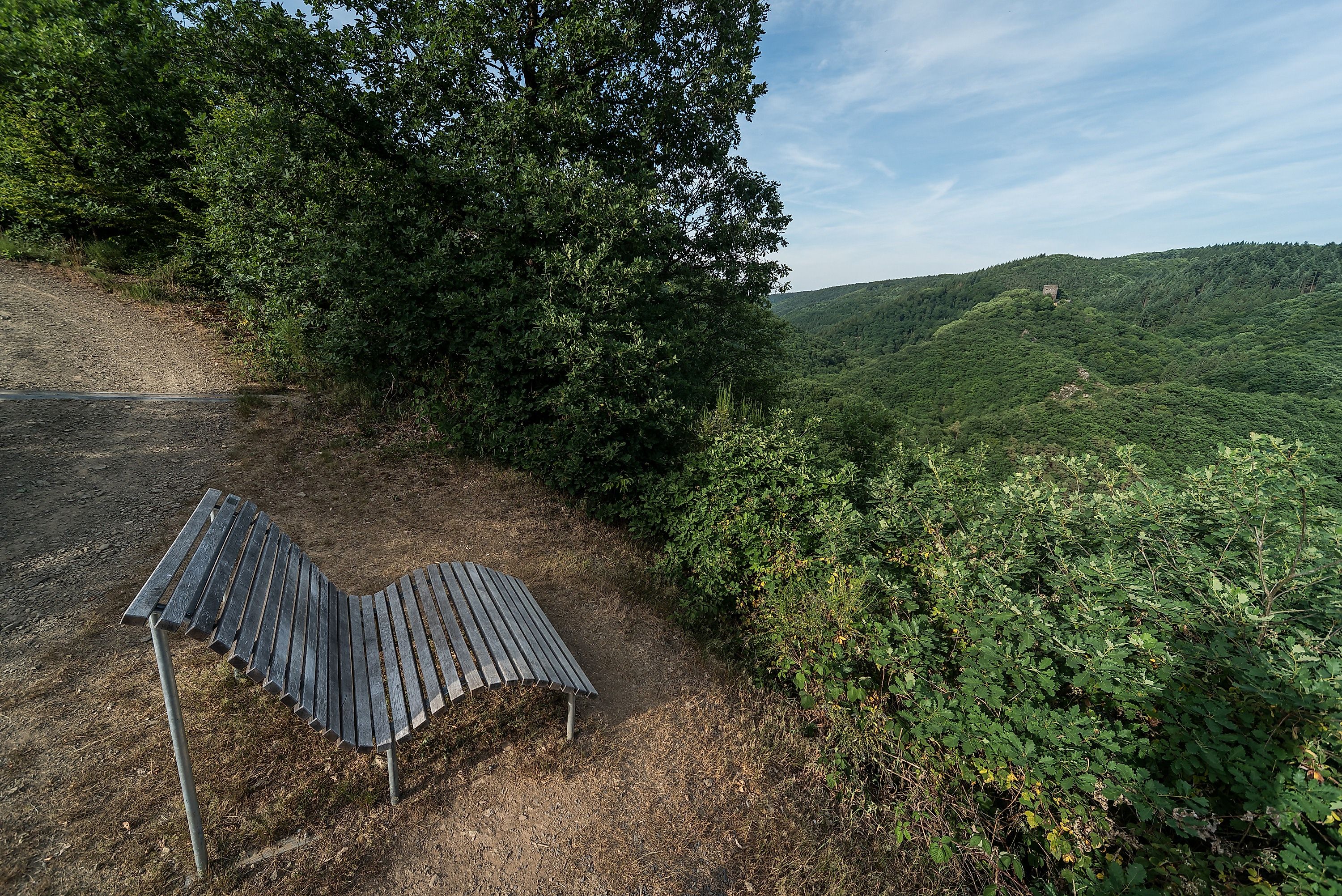 Nun steigen wir hinab durch das Wildgehege des Fürsten zu Wied ins tiefe Dombachtal, um vorbei an der Rehberghütte und dem Eichenhof den Ort Kurtscheid zu erreichen. In Kurtscheid zieht die Heilige Schutzengel-Kirche mit Dorfbrunnen und dem historischen Taufbecken die Aufmerksamkeit auf sich, aber auch die Kirchenfenster und die Darstellung der Erzengel und der Schöpfungsgeschichte sind von besonderer Schönheit. Wir umrunden den Friedhof und bestaunen das grandiose Panorama des Siebengebirges in der Ferne. Hier verweilen wir auf den neu errichteten Baumelbänken und genießen den herrlichen Ausblick.