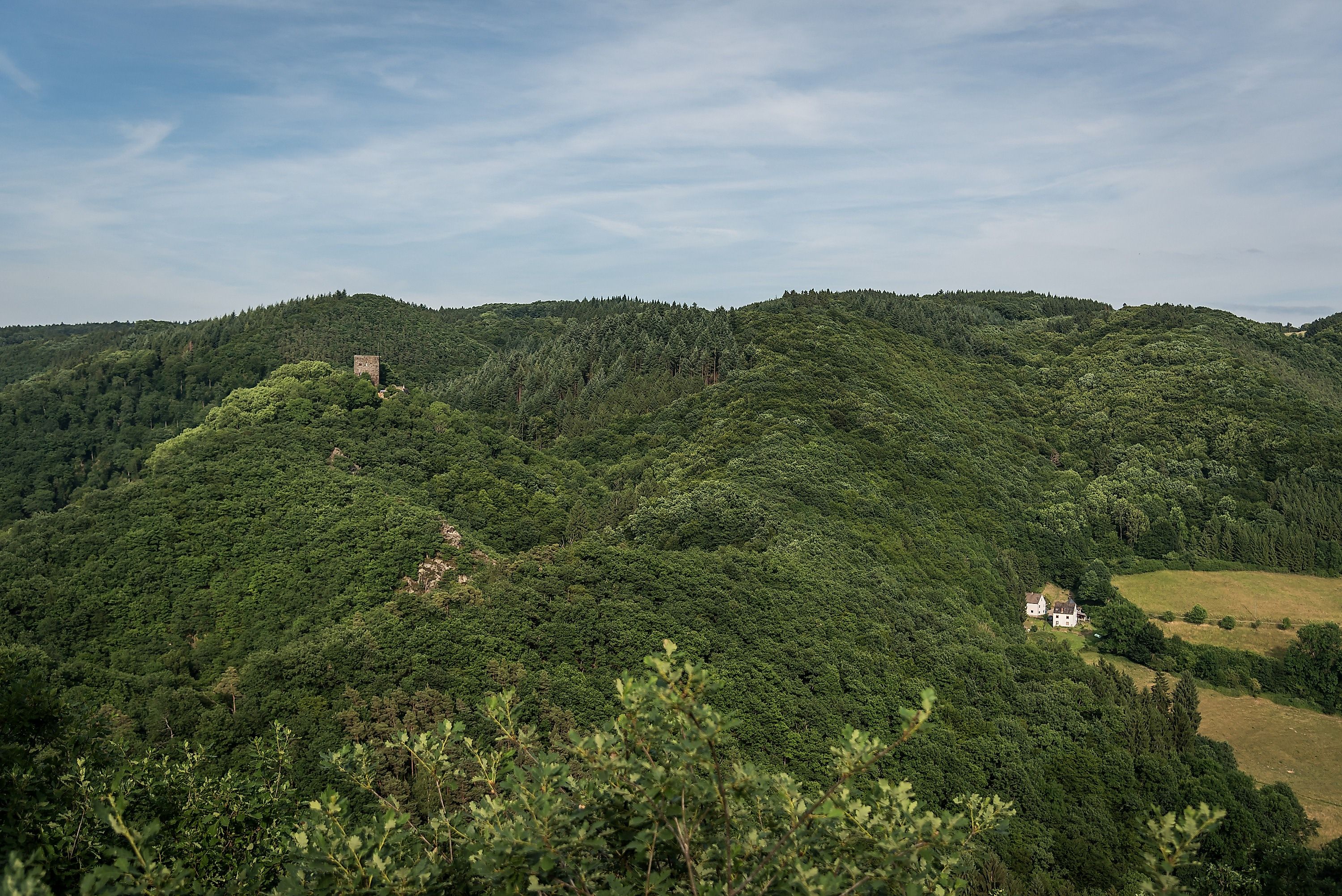 Der Klosterweg führt nun hinab ins Fockenbachtal, und wir fühlen uns mit den hügeligen Wiesenlandschaften des Wiedtales ins Allgäu versetzt. Wir passieren die Burgruine Neuerburg und überqueren den Burgseifen in Richtung Kelterhof.