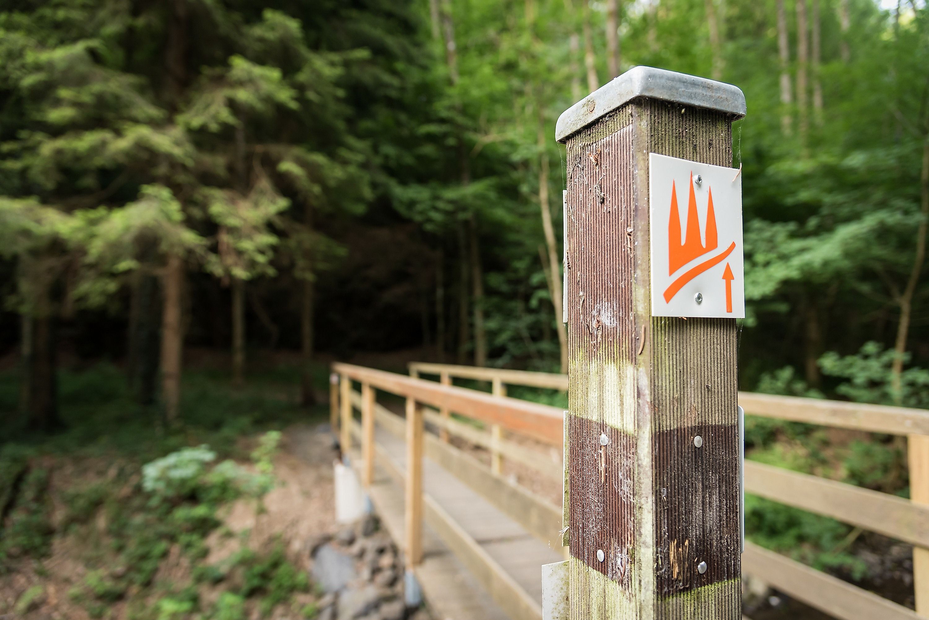 Hier sind Ziel und Anfang zugleich. Über den Parkplatz in der Ortsmitte von Waldbreitbach erreichen wir auf dem markierten Zuweg nach der Überquerung der Wied den Westerwald-Steig.