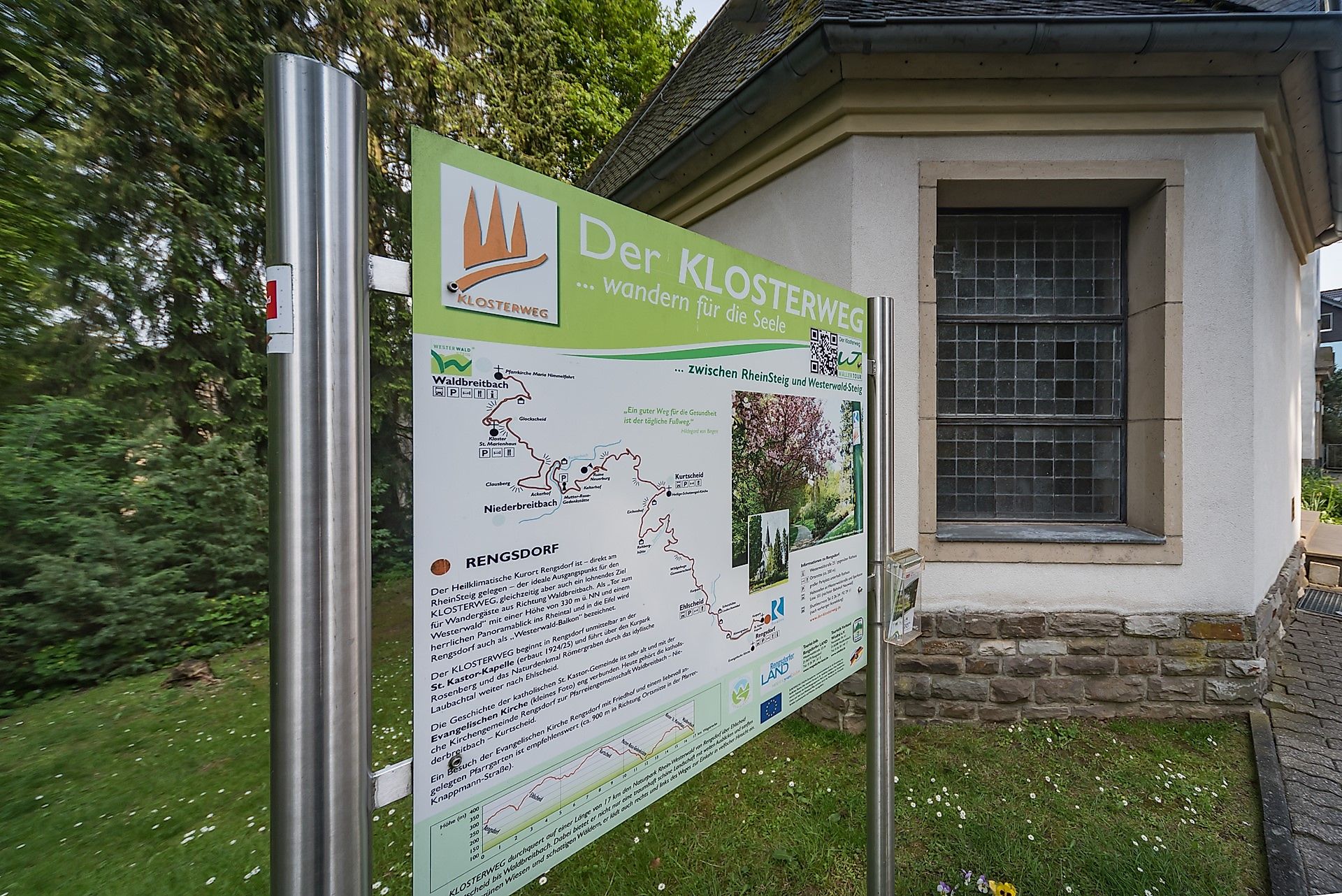 Die Lage des Rengsdorfer Landes im Naturpark Rhein-Westerwald - zwischen Rheintal und Westerwaldhochfläche - nimmt eine besondere Stellung als „Tor zum Westerwald“ oder besser gesagt als „Westerwald-Balkon“ ein. Es partizipiert von den herrlichen Panorama-Ausblicken ins Rheintal und in die Eifel, von den idyllischen Bach- und Wiesentälern und natürlich von den angrenzenden Höhenlagen des Westerwaldes.In diesem attraktiven Fleckchen Erde liegt zwischen dem RheinSteig in Rengsdorf und dem Westerwald-Steig im angrenzenden Waldbreitbach der KLOSTERWEG, der auf einer Länge von ca. 18 km einen hohen Erlebniswert für Wander- und Trekkingfreunde garantiert. Er erfüllt die Anforderungen für Premiumwanderwege und ist berechtigt, das DEUTSCHE WANDERSIEGEL zu tragen.Der KLOSTERWEG durchquert nicht nur eine traumhaft schöne Landschaft mit weiten Ausblicken und sanften Hügeln, mit grünen Wiesen und schattigen Wäldern, er lädt auch rechts und links des Weges zur Einkehr in vielfacher Hinsicht ein.