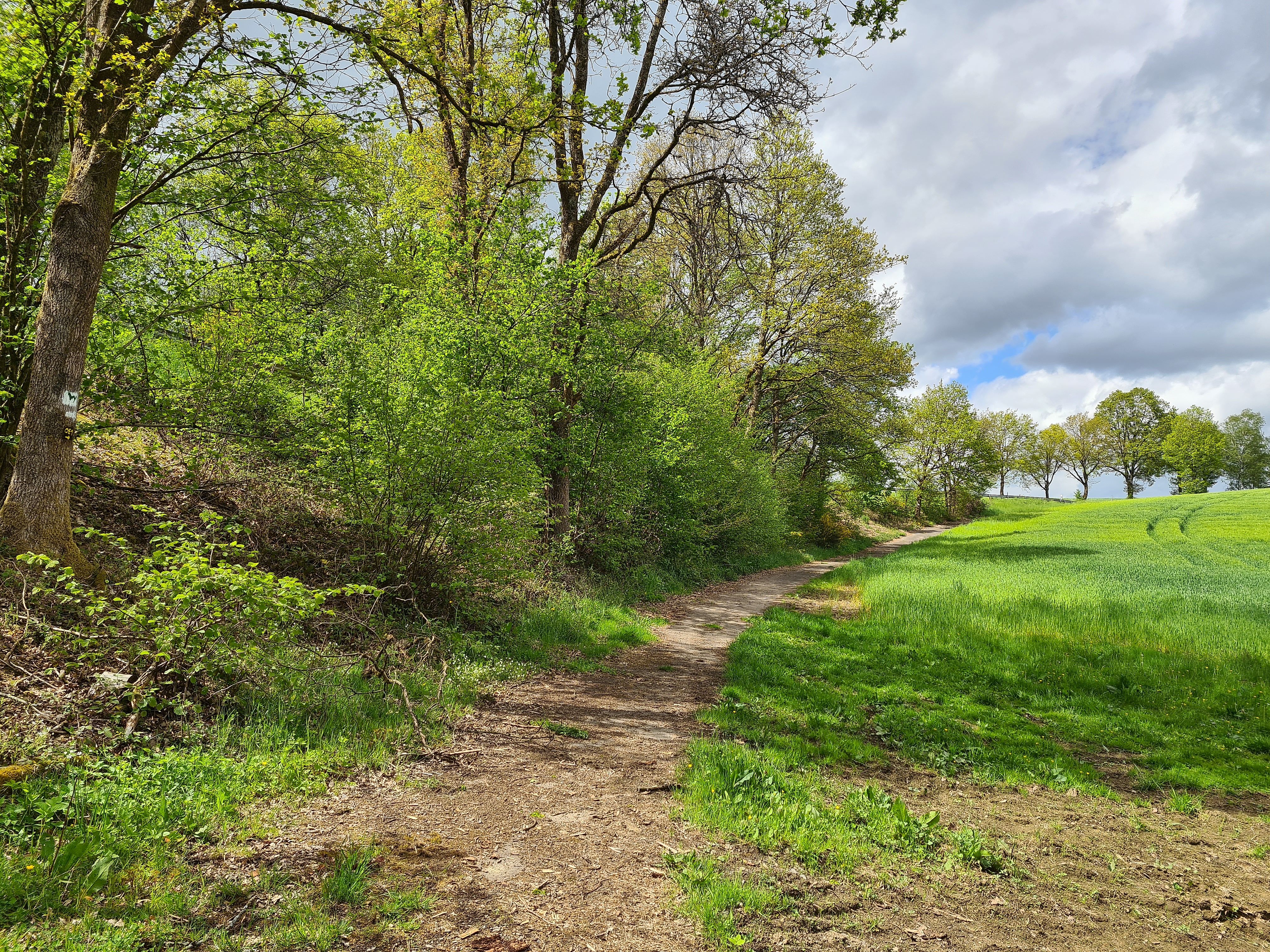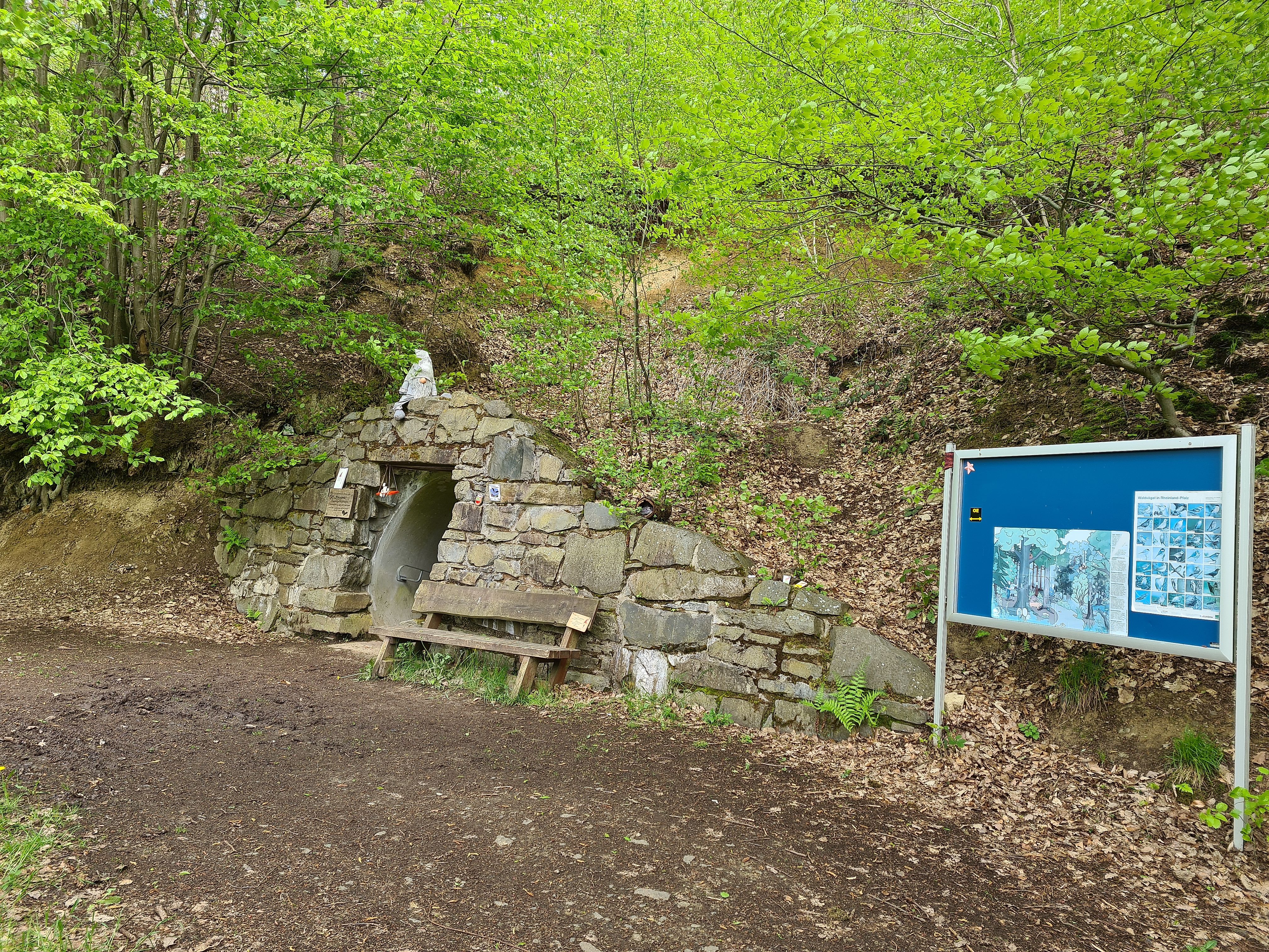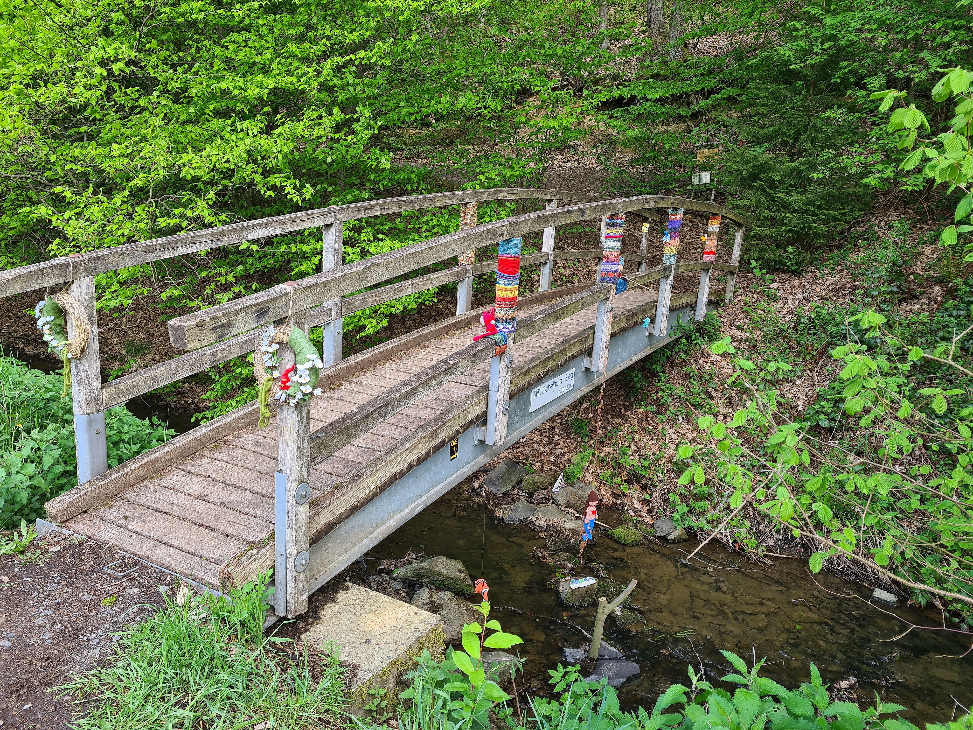 Vom Bahnhof aus laufe ich wenige Meter Richtung Norden und quere die Bahngleise. Hinter dem Weiher geht es über eine kleine Holzbrücke und hier finde ich schon die ersten Zeichen des Wichtelpfades. Am alten Stolleneingang und dem kleinen Friedhof vorbei geht es dann in das Waldgebiet hinauf, wo wir auf den WesterwaldSteig treffen. Leider hat hier der Borkenkäfer große Schäden verursacht und viele mit Nadelholz bestandene Waldbereiche mussten gefällt werden. Am Ende dieses Waldgebietes habe ich einen wunderbaren Ausblick auf Hilgenroth. Gleich nebenan ist die Wanderhütte, wo eine erste Rast möglich ist. Zwischen Wiese und Wald führt der Weg weiter bis zur K 37. Kleine Stufen erleichtern mir den gegenüber liegenden Aufgang der Straßenböschung. Nun durchwandere ich das Waldgebiet von Busenhausen. Hier ist ein wichtiger Quellbereich des Erbaches und kleine Gräben und Bachläufe durchziehen den teils feuchten Forstbestand.Dann erwartet mich wieder ein toller Ausblick vom asphaltierten Höhenweg Richtung Bachenberg und Obererbach. Erst beim Abzweig zum Angelteich verlasse ich die Teerstraße und es geht auf naturnahen Wegen wieder Richtung Obererbach.