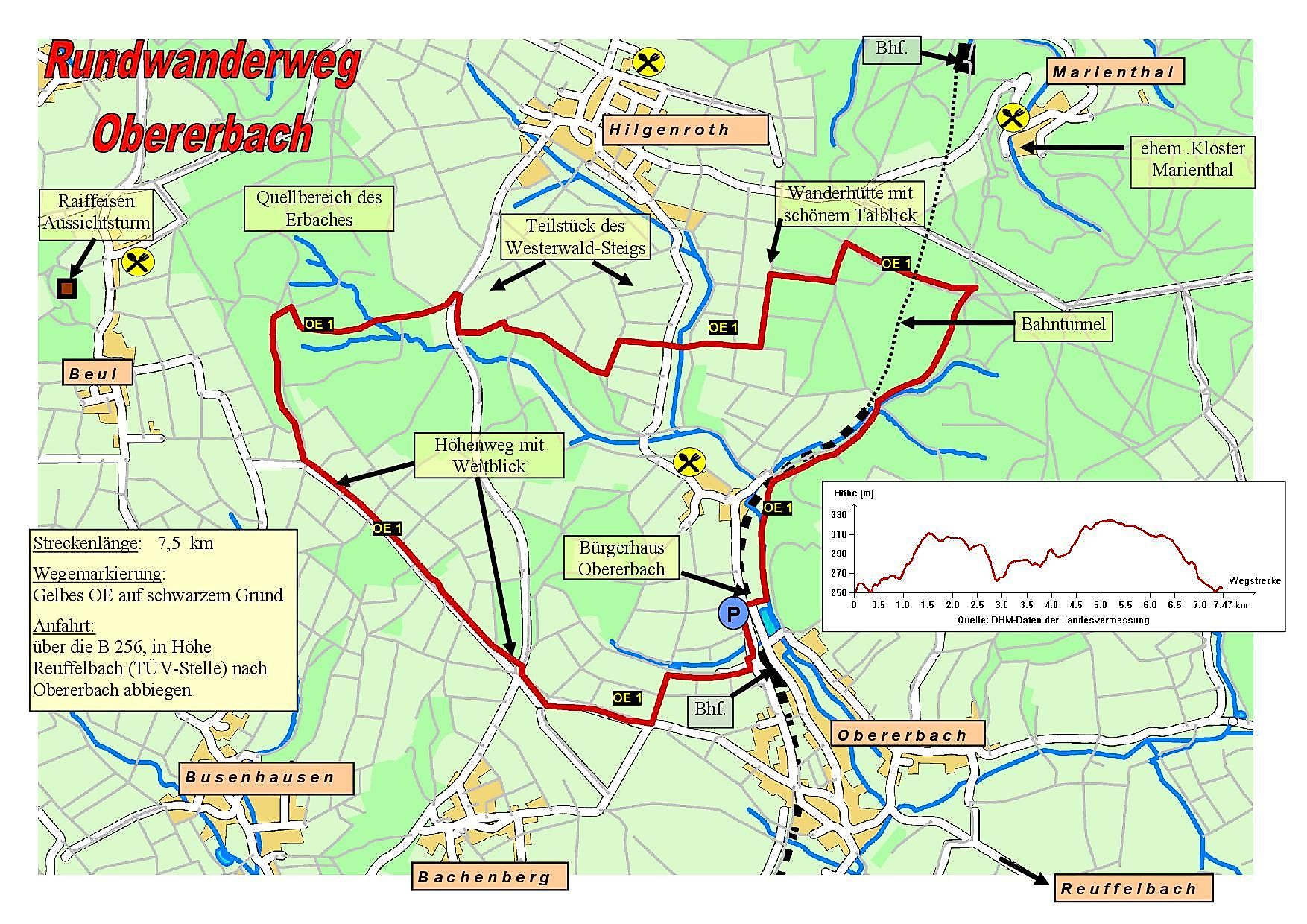 Der Wanderweg hat direkten Bahnanschluss. Die Westerwald-Sieg Bahn (RB 90) verbindet die Anschlüsse: Siegen - Au/Sieg- Altenkirchen - Hachenburg - Limburg.Auch von Köln/Bonn hat man zügigen Anschluss in Au/Sieg und gelangt von dort in 15 Min. zum Bahnhof Obererbach.Zugverbindungen unter: www.vrminfo.de