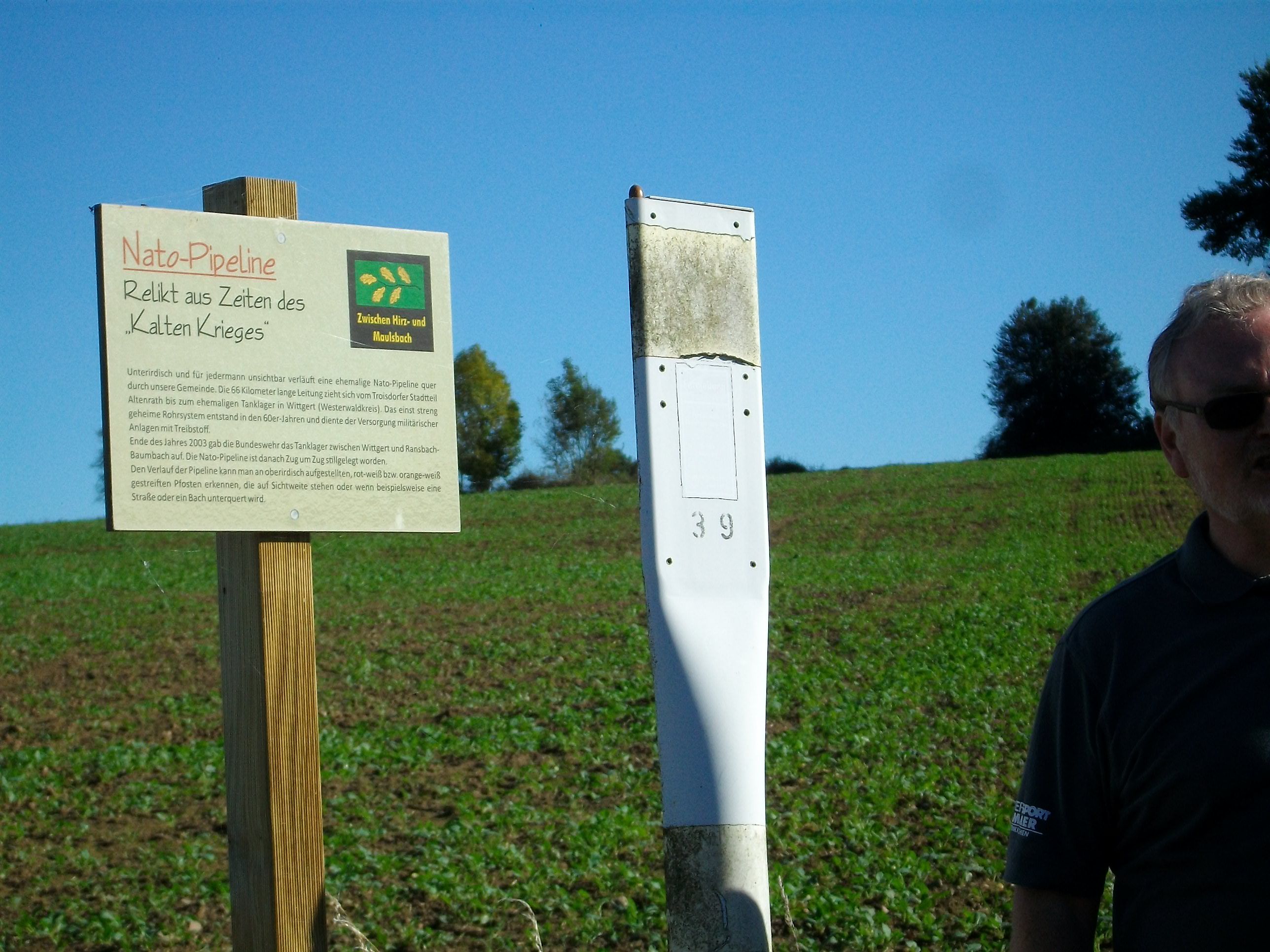 Ich entdecke einen rot-weiß gestreiften Pfosten, Zeichen für die ehemalige Nato-Pipeline, welche hier unterirdisch aus Richtung Köln durch den Westerwald verläuft.