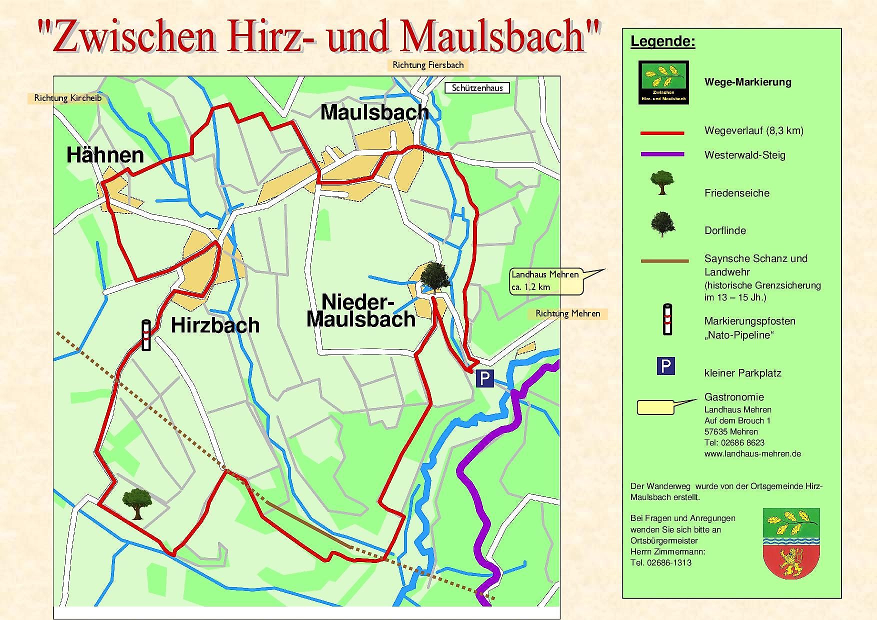 Vom Parkplatz aus geht es über naturbelassenen Weg und parallel zum Maulsbach Richtung Nieder-Maulsbach zur Dorflinde. Von dort kehre ich zurück ins Mehrbachtal und wandere auf befestigten Wegen durch Wald und Wiesenflächen bis zum Hirzbach. Nach der Bachquerung geht es bergauf in ein Waldstück und wenn ich genau hinsehe, entdecke ich einen schwachen Wall zwischen den Bäumen, der früher natürlich viel mächtiger war. Hier musste über Jahrhunderte die Grenze zur Grafschaft Sayn geschützt werden.