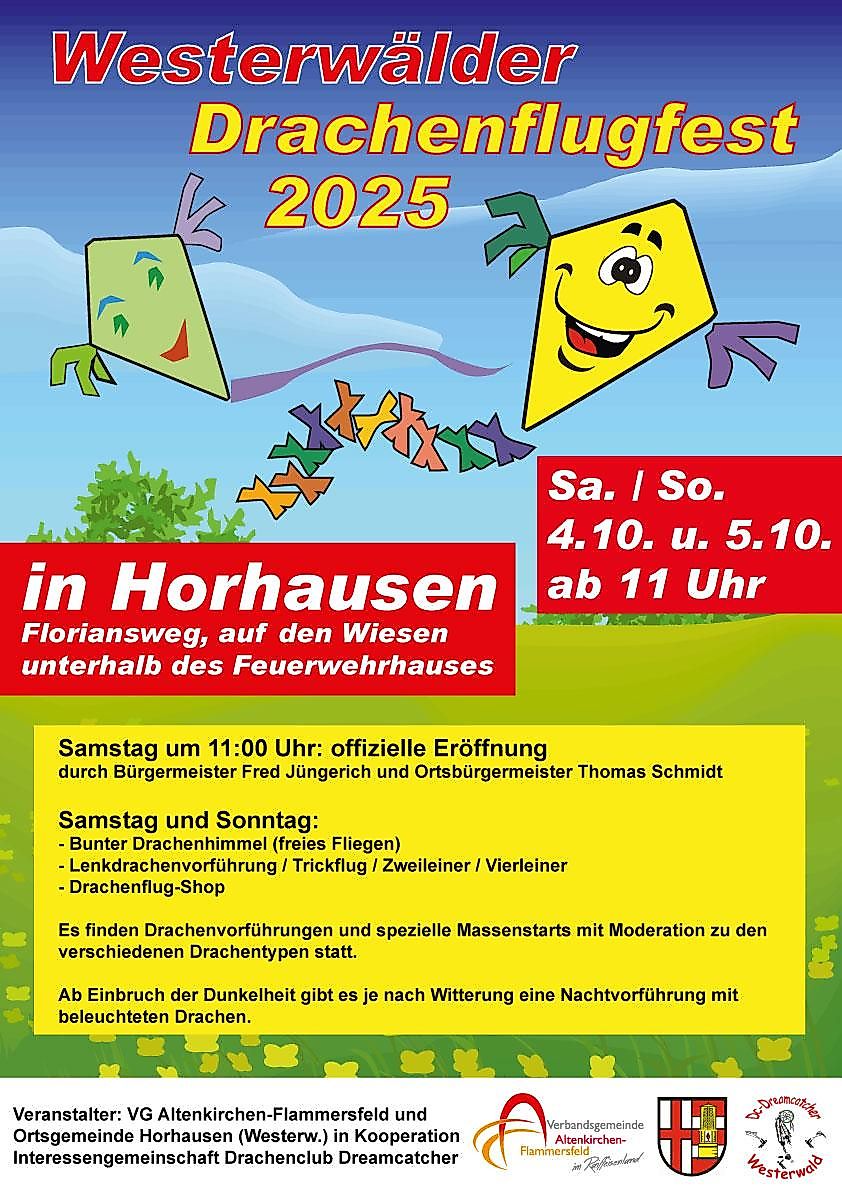 Hier werden wieder Profis mit spektakulären Drachen erwartet, die ihre Flugkünste demonstrieren. Auch Kinder, Jugendliche und interessierte Erwachsene sind eingeladen, zwei erlebnisreiche Tage in Horhausen zu verbringen und ihre Drachen steigen zu lassen.Nach Einbruch der Dunkelheit lädt der Drachenflugclub zu einer beleuchteten Kulisse ein.