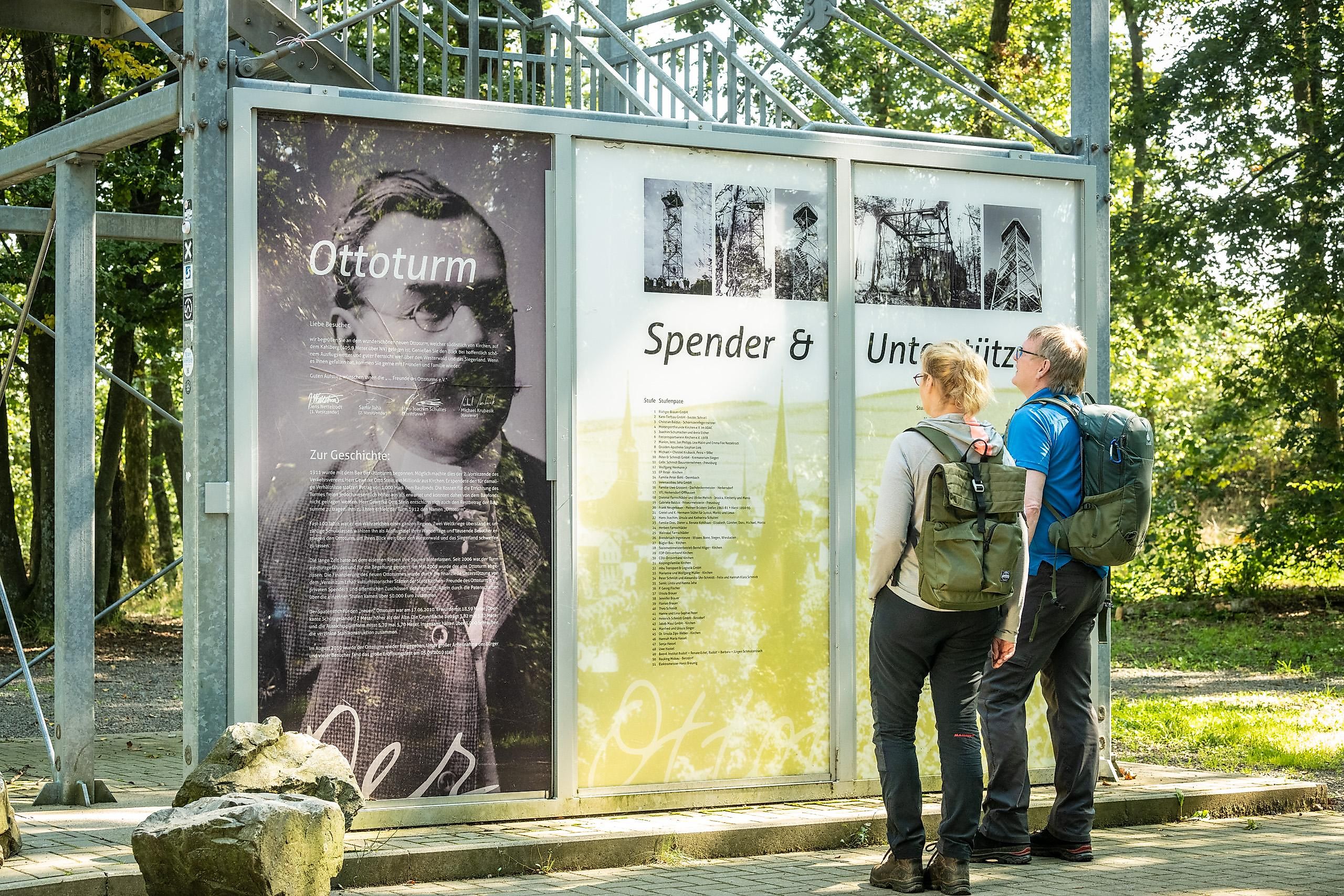 An official opening festival was held to officially inaugurate the new Ottoturm on September 5, 2010. The construction of the tower incurred a total cost of 130,000 euros. With an impressive donation total of around 70,000 euros, the association “Friends of Ottoturm e.V.” made a substantial contribution itself. This demonstrates that people feel a strong connection to "their" Ottoturm, even beyond the city limits of Kirchen (Sieg). The now 18.59-meter tall tower is a popular destination for excursions in good weather and invites visitors for a stroll or hike. It offers an excellent panoramic view into the Siegtal, towards Freusburg, and all the way to the heights of the Westerwald.