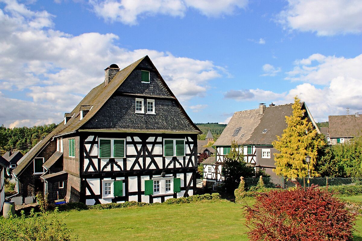 Alsdorf, at the confluence of the Steinebach into the Heller, was also strongly influenced by the mining industry. Large smelters were once located here. The managers of these works, the smelter foremen, also lived here. A contemporary witness from that time is the smelter foreman’s house in Alsdorf, which still stands today. This half-timbered house, listed as a historic monument, stands out significantly from the surrounding buildings due to its unusual entrance area.