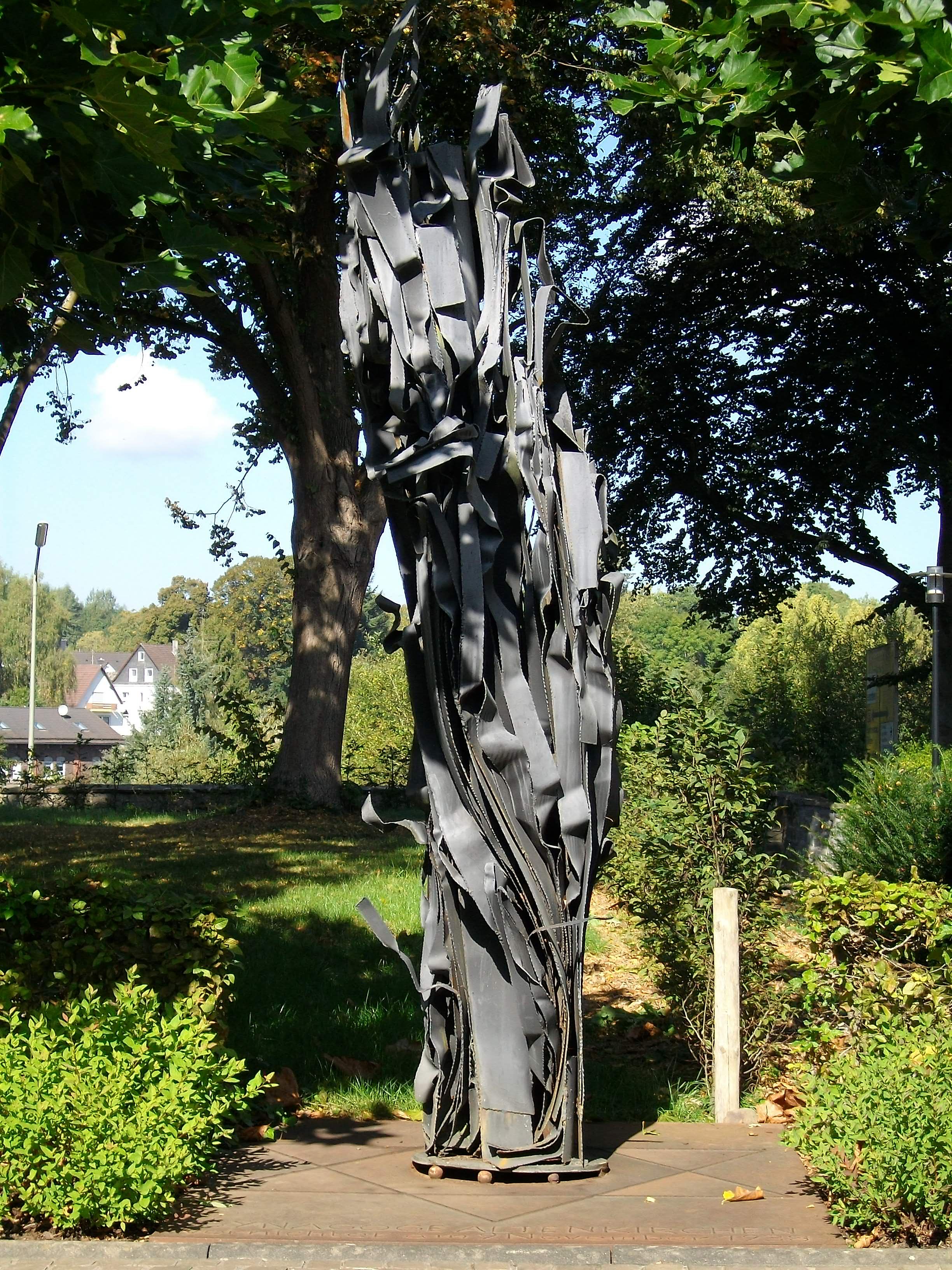 We pass the "Historical Quarter," a place for preserving the town's history, and find at the end of “Wallstraße” / “Im Hähnchen” on the ground an old street corner stone, formerly a buffer for horse-drawn carts. Further up, Saynstraße leads us left onto Schlossplatz.On the left, we find a depiction of the former castle on a utility box. However, the buildings were destroyed by major fires and war events.We cross the square towards the church and see on the left the flame memorial in remembrance of the synagogue and the Jewish fellow citizens who fell victim to the Holocaust.