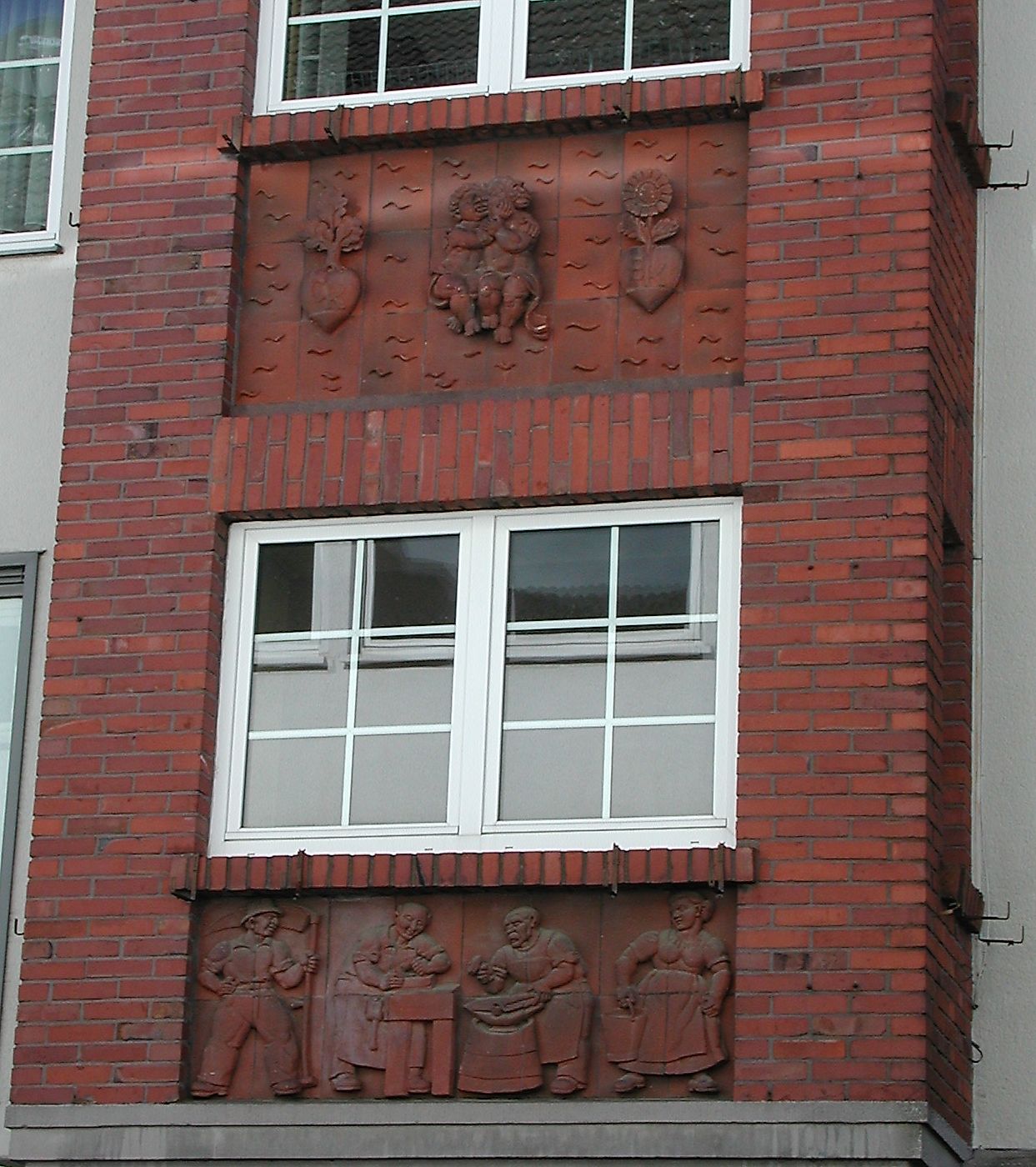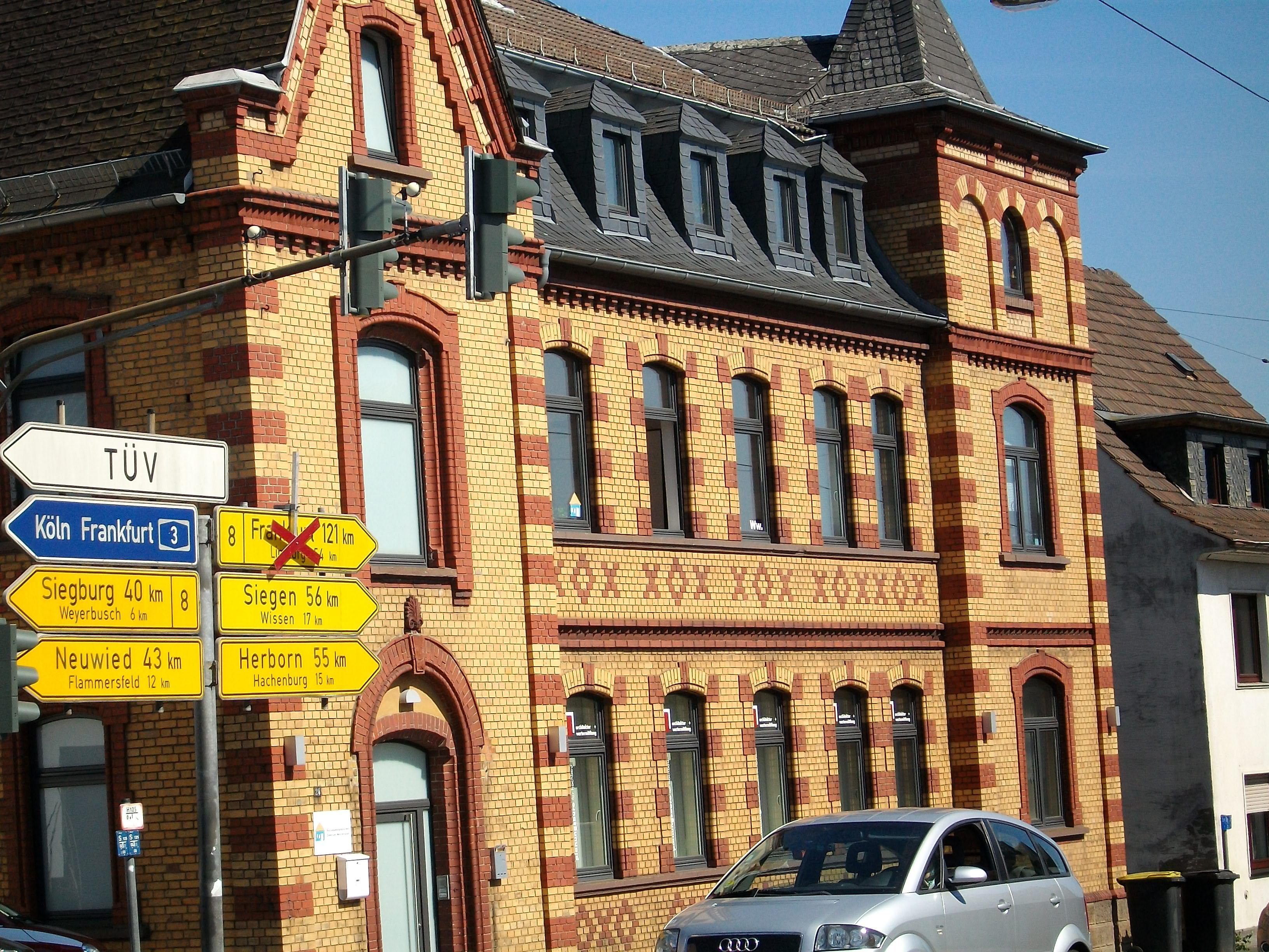From the train station, we go via Konrad-Adenauer-Platz and the “zig-zag path” up to Wiedstraße. Here, we turn right to the signal-controlled intersection, where we already recognize the “XOX House,” named after the distinctive brick pattern. In the valley behind this building was previously the old brickworks. The associated clay pit was located behind today's ALDI market. Via Ziegelweg, we go back to the “B8,” the Kölner Straße, or, in earlier times, the “Huh Stroß,” the Hohe Straße, an old military and trade route from Cologne to Frankfurt am Main and also to Leipzig which passes through Altenkirchen here.