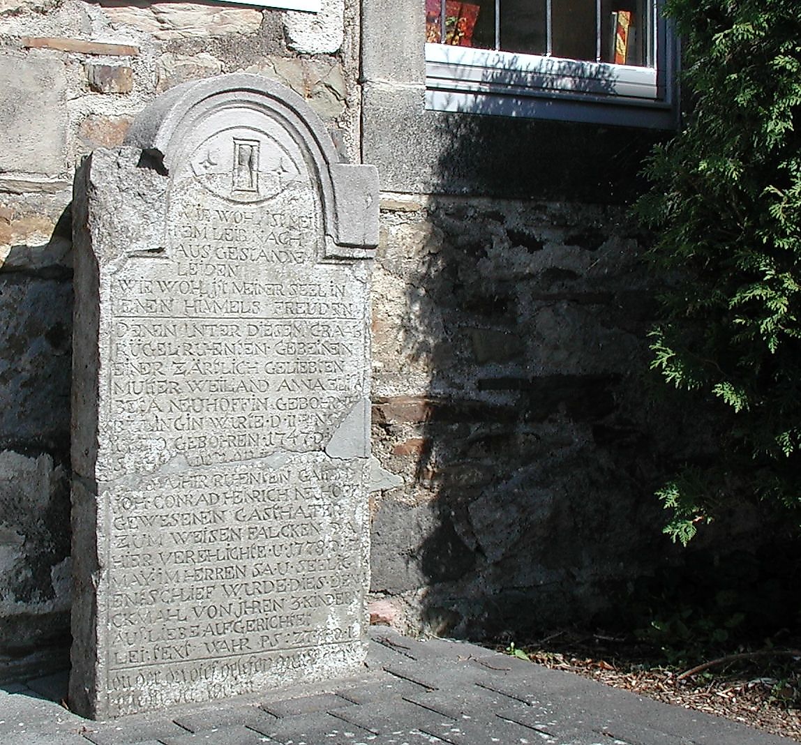 On the left past the church stands an old gravestone in front of the Protestant library, found during excavations around the church. A wide passage now leads us back onto Wilhelmstraße, and we see the artistically designed facade of the former hardware store of the Kuss family.