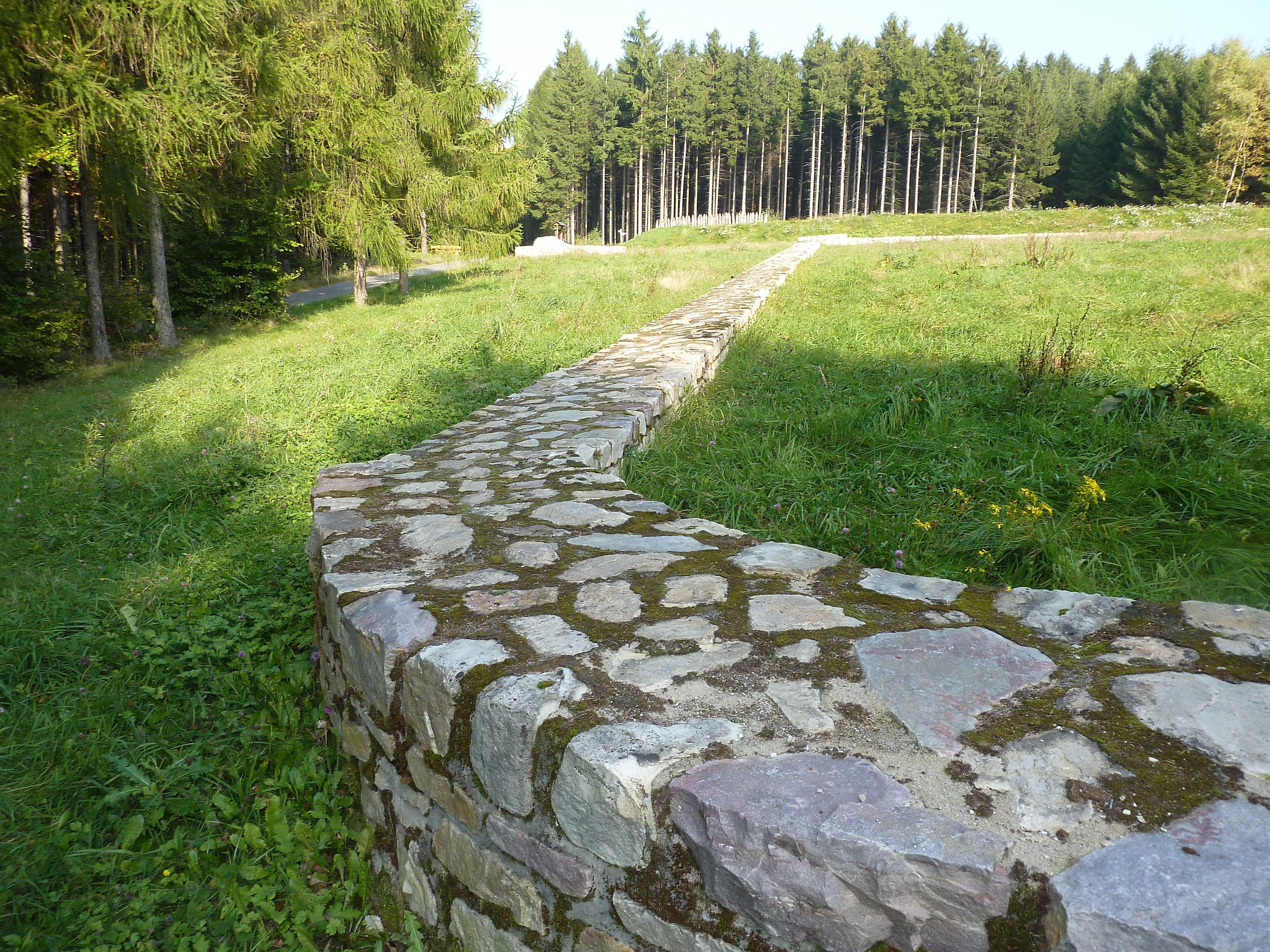 You are now standing in front of the fort whose outer walls have been made visible again. Then walk past the rampart at the fort to the spruces and then continue parallel to the Limes. Pass through the spruce stand further into the beech forest and straight ahead to the forest path and you will see the large sign with explanations about the spoil heap: WP 1/72, now go down this path following the signs, then right into the town and the school entrance right up, over the school yard, past the gym on the left, down again and from here you have a wonderful view to the "Hohe Acht" in the Eifel.