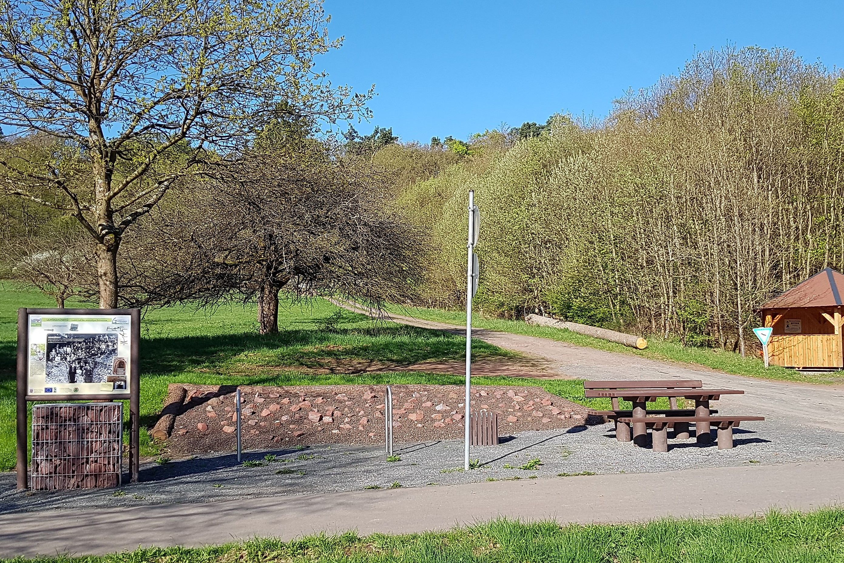 After about 100 meters I reach the Ulmtal cycle path on the right – the former route of the Ulmtal railway, which has been converted into a cycle/walking path – and stand in front of the main entrance to the Siegfried Fietz sculpture park. The composer, performer and producer, who lives in Allendorf, initiated the park. I admire sculptures made from local materials such as wood, basalt and metal and retrieve explanations by the artists via mobile phone and QR code. After a thorough round, I walk the remaining approximately 1.2 kilometers along the Ulmtal cycle path. At a rest area, a board informs me about ore mining in the area. Shortly before the car park, I have the option to stop at the Outdoor Centre with restaurant, beer garden, playground and many animals.