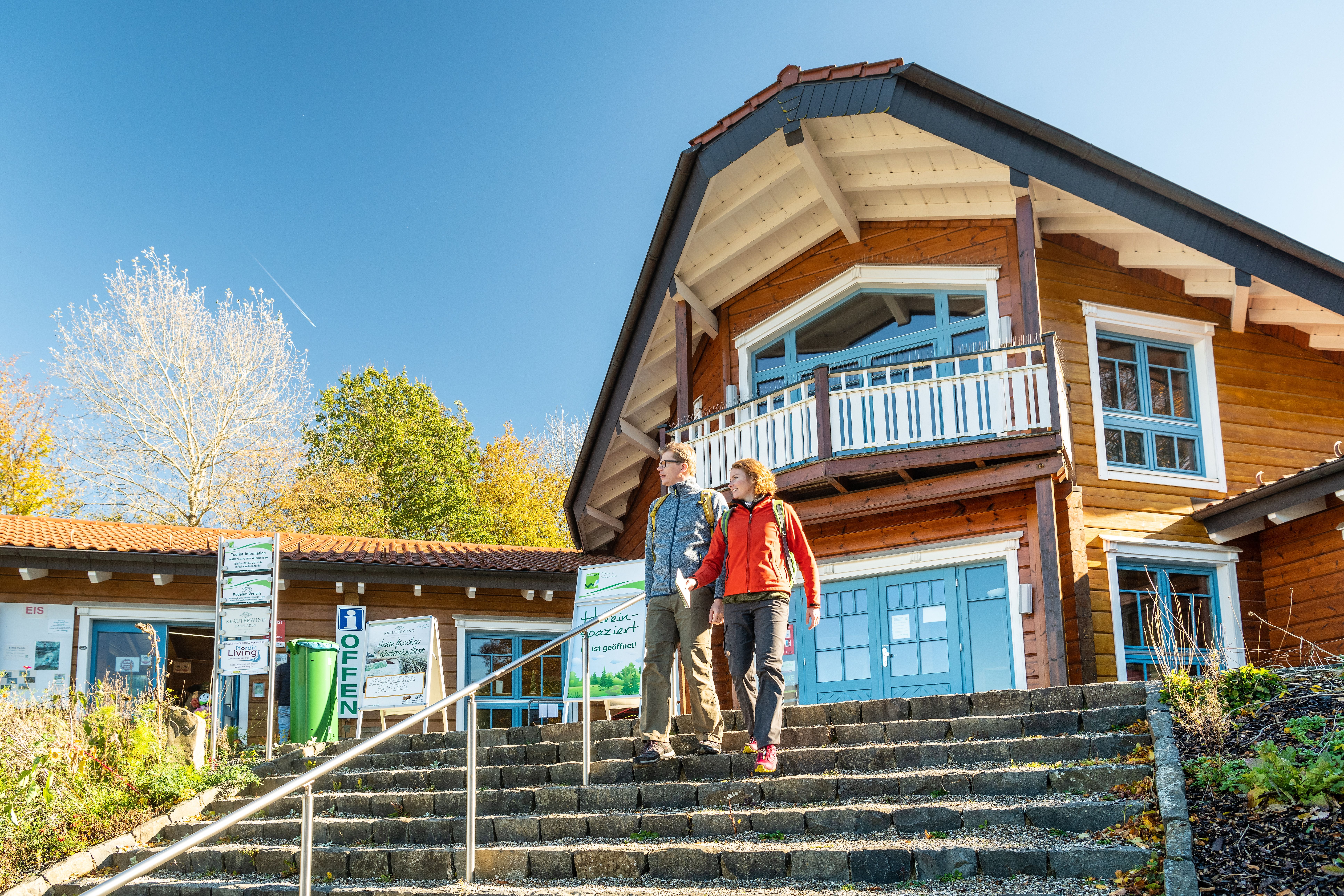 Shortly before the intersection, I take the footpath to the right between the trees towards the WällerLand Tourist Information at Wiesensee, whose wooden building can be seen on the right. I find some souvenirs and regional products here. Relaxed, I sit for a while longer in the hiking swing at the parking lot and enjoy the lake view before starting my journey home.