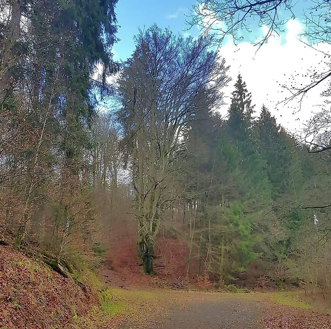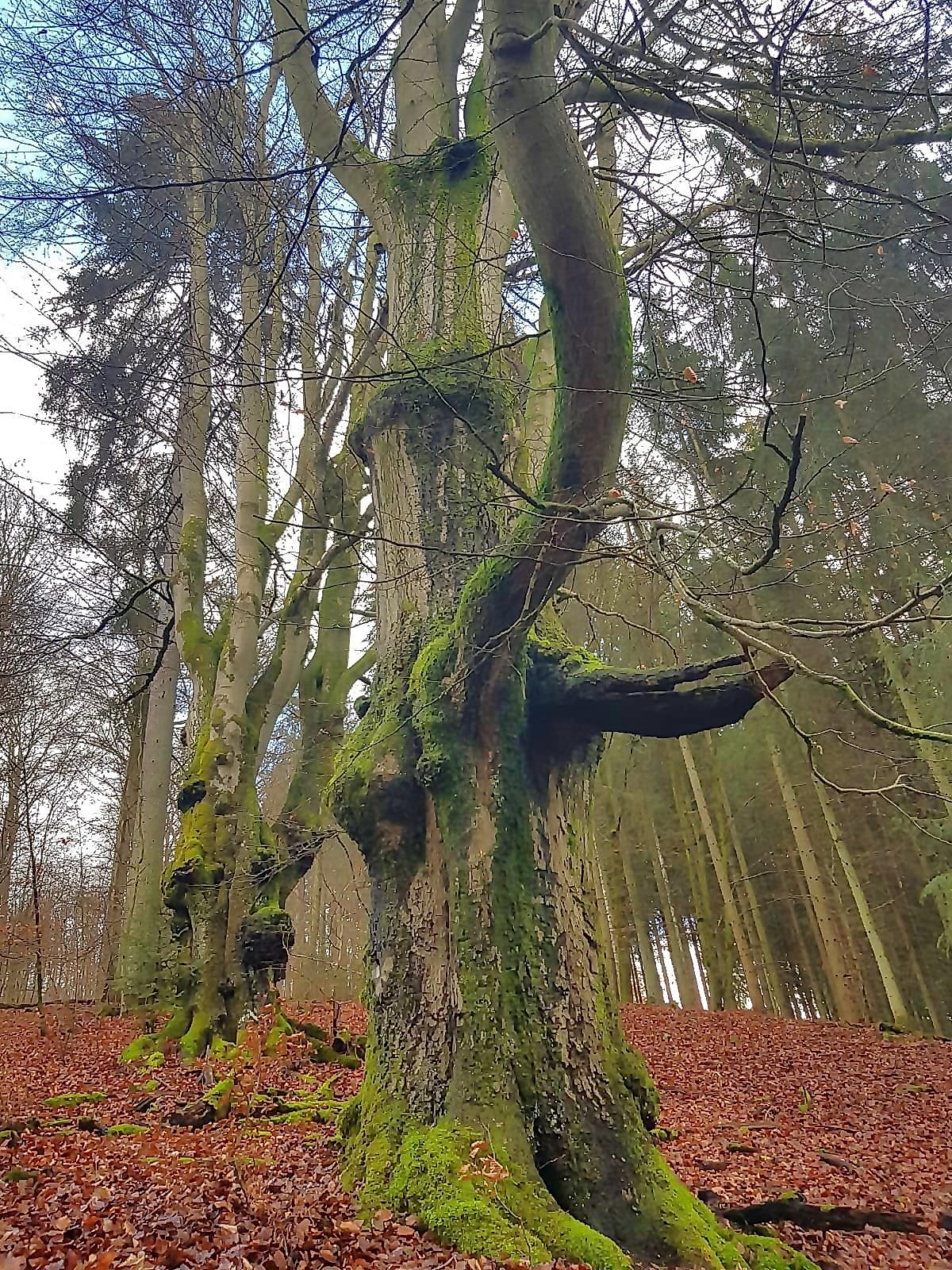Directly on stage 13 of the Natursteig Sieg on the hiking trail between the miniature golf course and Herkersdorf in the Imhäusertal valley (Druiden.Hexen.SiegerLand), there are two majestic-looking royal beeches that have been natural monuments since 1939 and are already around 380 years old.