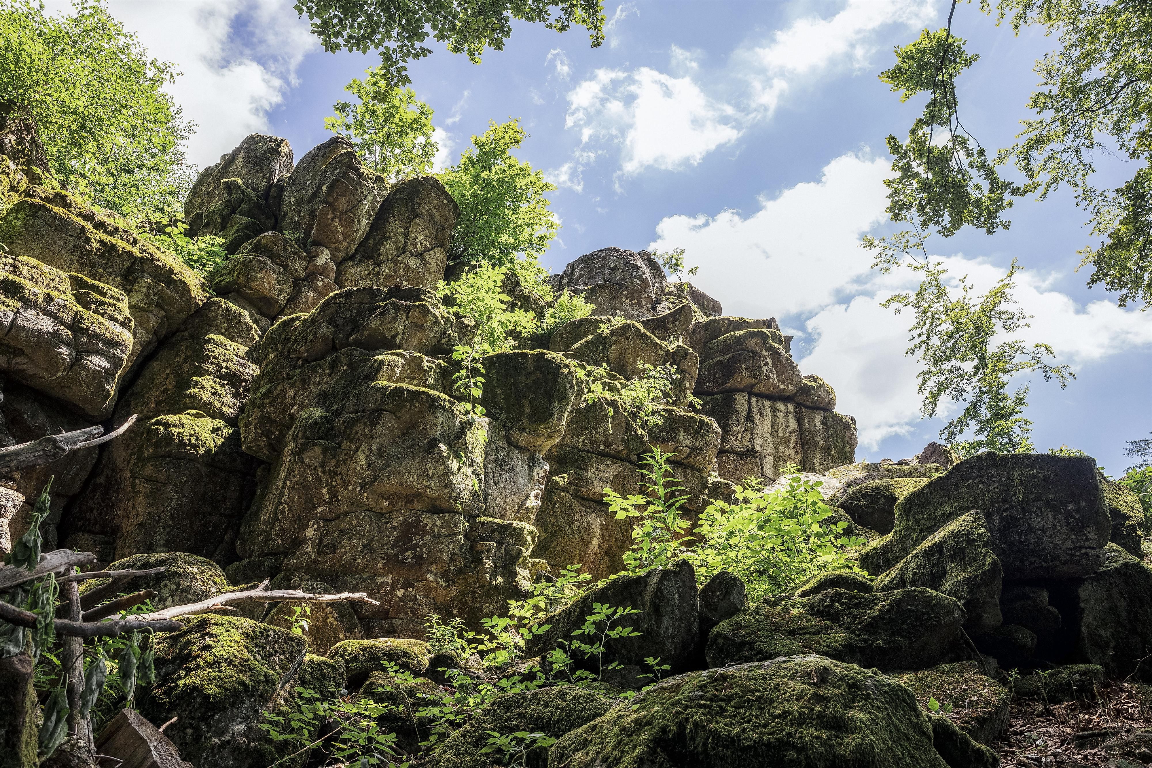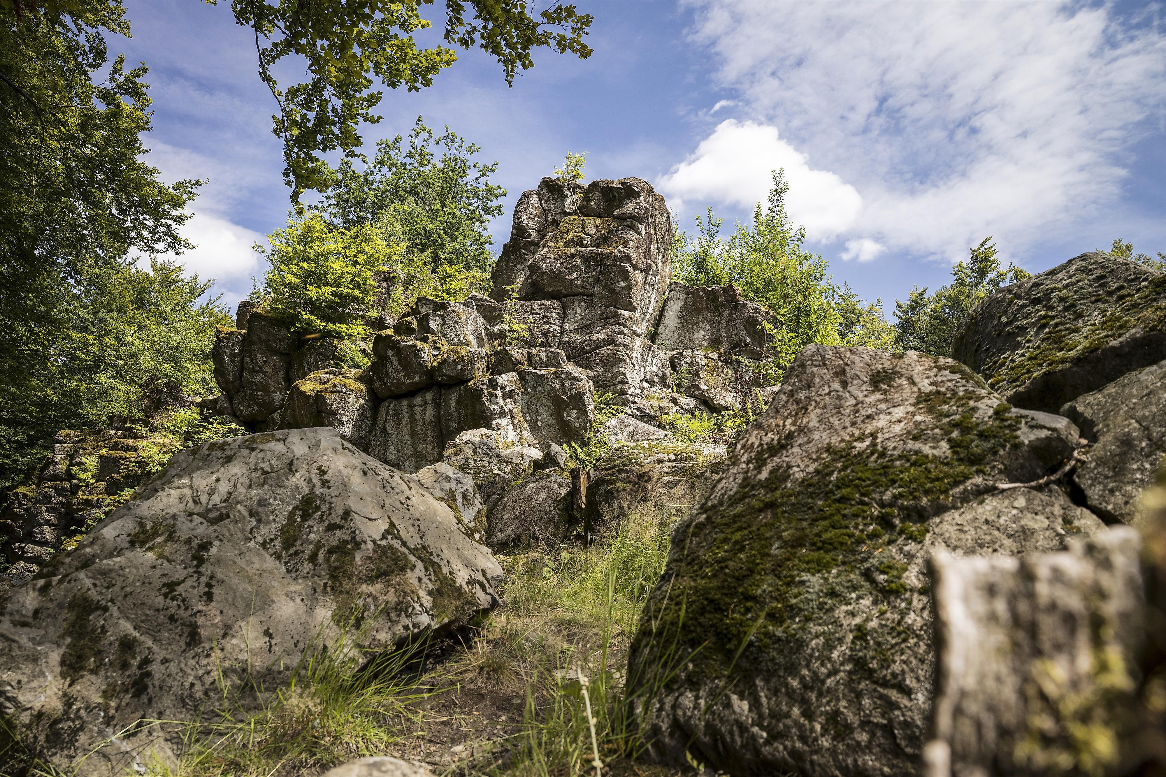 The large and the small Wolfstein are two basalt formations in the middle of the forest of the Wildpark on the Marienberger Höhe. They were formed about 25 million years ago by a volcanic eruption. A legend tells that the devil wanted to build a stairway to heaven with stones, but they fell apart. Today, the Wolfsteine are designated as a natural monument and a popular excursion destination.