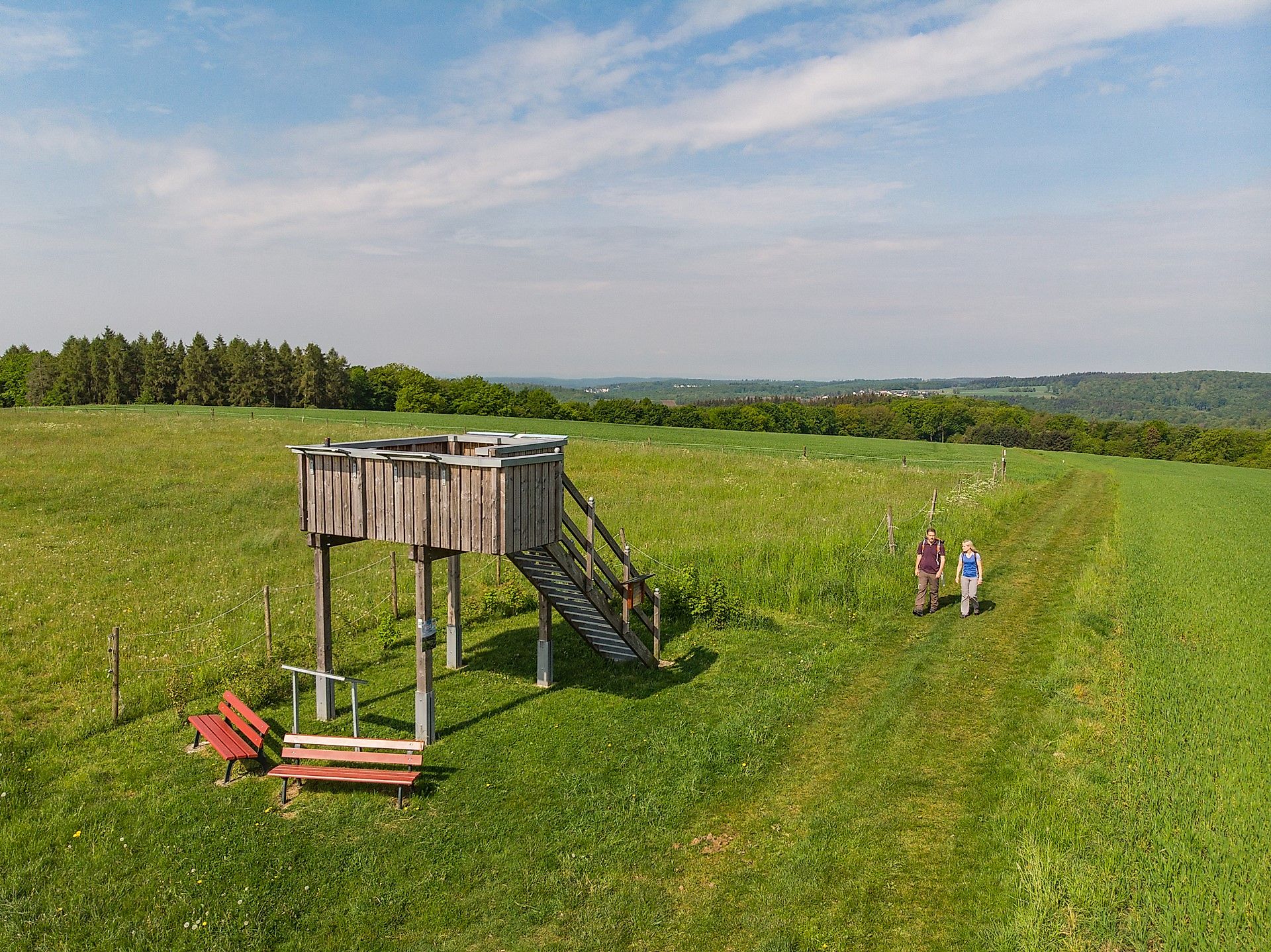 From there, the path leads us straight into the Rüscheid district with the new nature trail "Dremherem em Reschd" (Around Rüscheid). Lovingly created information boards make us curious about this place. At the highest point, we cross the L 258 (be careful!) and enjoy the wonderful view of the Jahrsbach valley opposite at the Bürgermeister-Wink-Hütte. We pass the Himmelsteich pond and the sports field and continue across lush meadows to a small viewing platform. On a clear day, hikers can enjoy an almost panoramic view from here, reaching as far east as the Großer Feldberg in the Taunus (70 km). The path leads through a mysterious forest back to Anhausen, allowing us to enjoy further views along the way. The final highlight is the historically impressive Anhausen church from the 13th century.