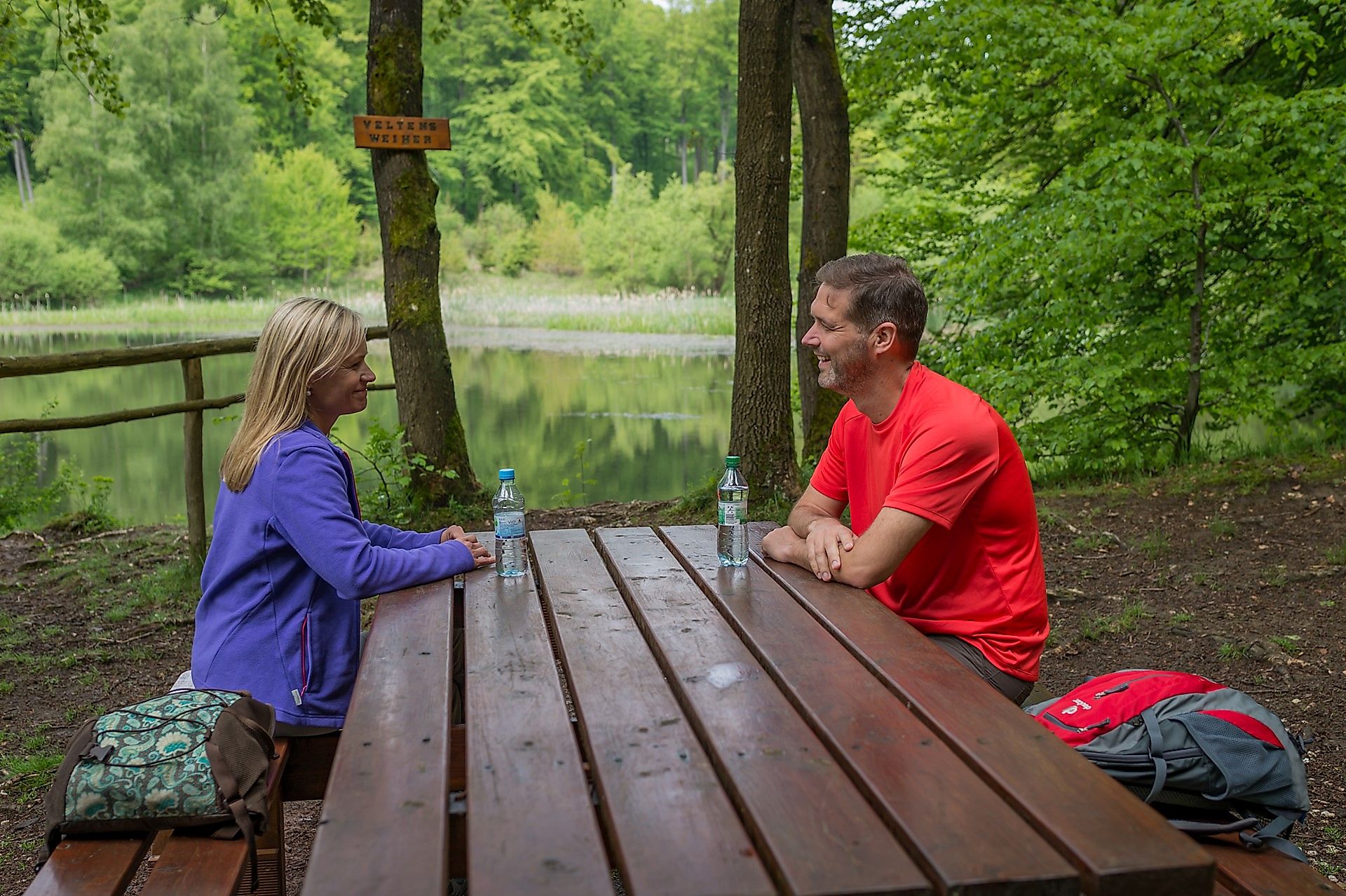 We reach the Iserbach valley via the "Wasserweg" with two wonderful seats with a view of Isenburg and cross the K 113 and the Iserbach, which gives its name to our hiking trail, on the way to the Thalhauser mill. From now on, we encounter large and small fish ponds, the water flows and gurgles, and we feel the abundance of water in this wonderful spot. Finally, we arrive at Veltens Weiher and enjoy a rest at the beautiful group of tables.